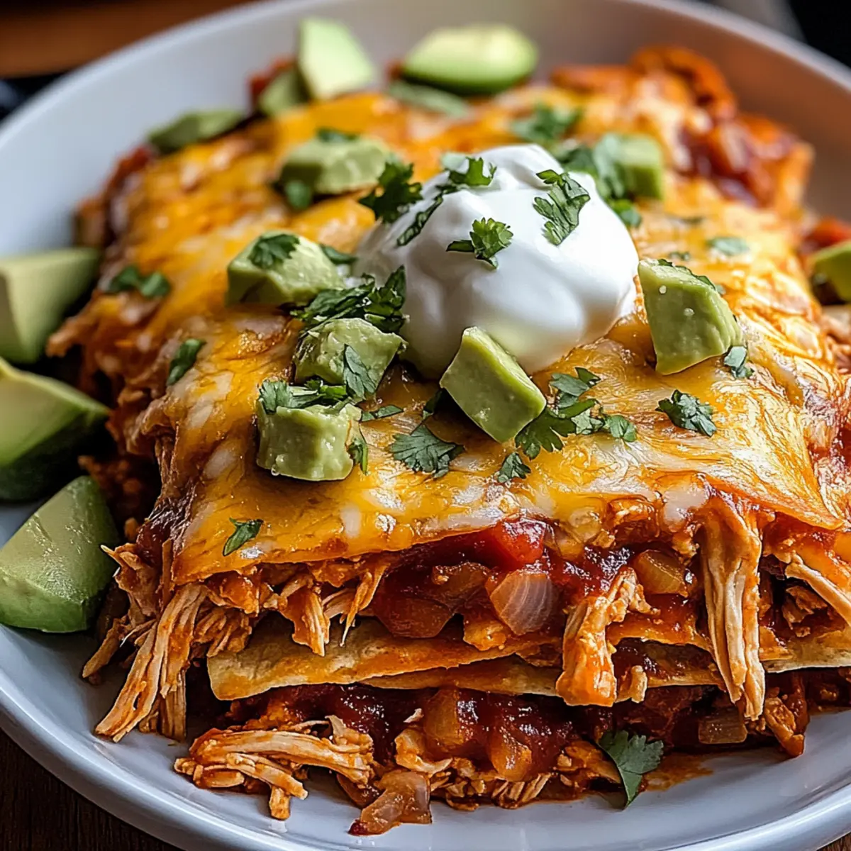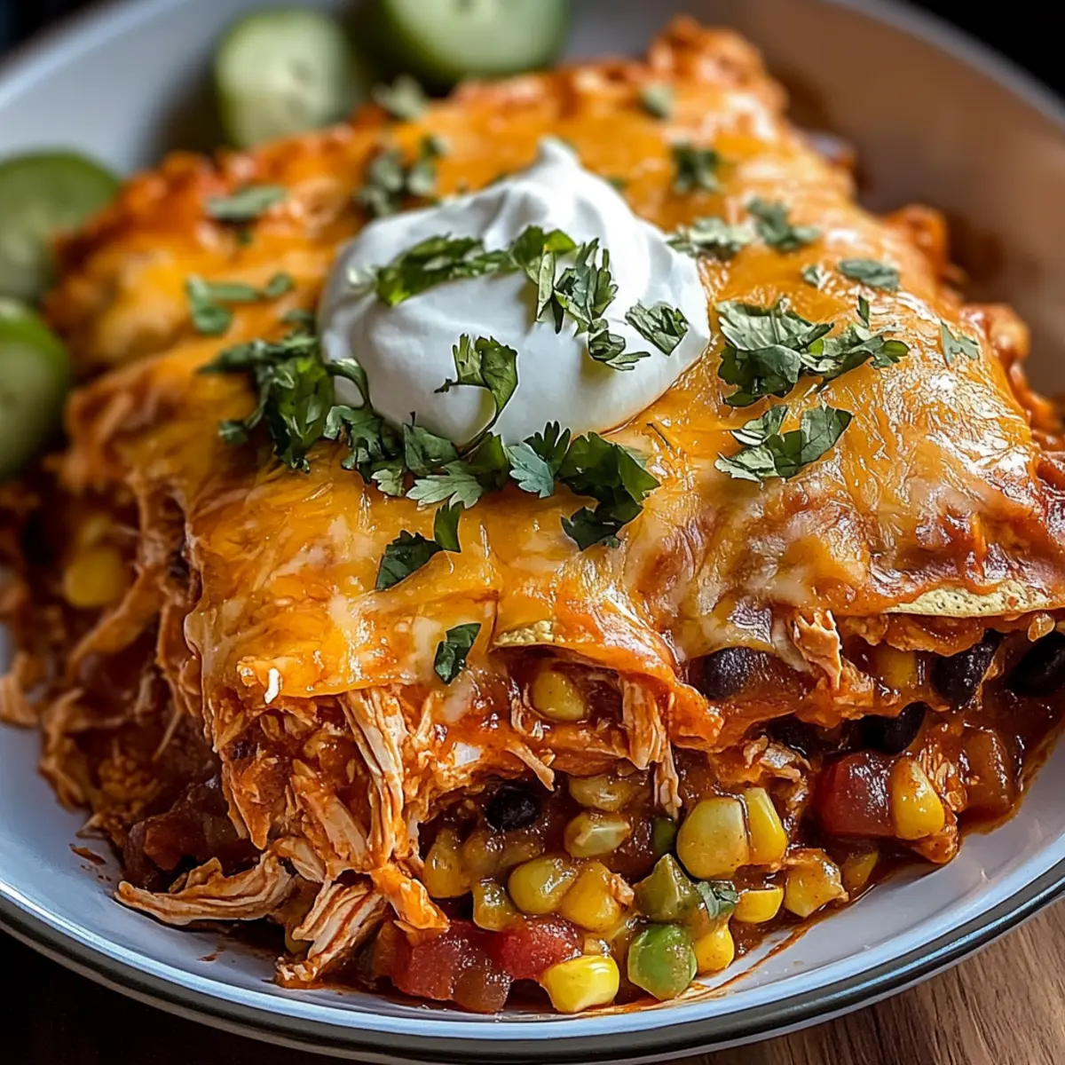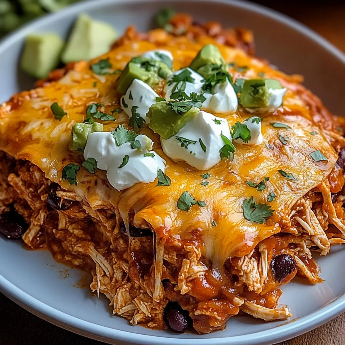 Jump to Recipe Print RecipeAs the aroma of spices wafts through the kitchen, I know it’s time to gather everyone around for a delightful meal. My Shredded Chicken Enchilada Casserole isn’t just a recipe; it’s a heartwarming reminder that homemade food can bring comfort and joy to our busy lives. This dish marries tender, seasoned chicken with savory enchilada sauce and gooey cheese, making it a fantastic choice for a quick weeknight dinner that pleases even the pickiest eaters. Plus, its beginner-friendly steps allow you to whip it up effortlessly, whether you’re entertaining guests or just looking to satisfy your family’s cravings. With its customizable layers, this casserole is also adaptable for vegetarian diets, proving that hearty meals can be enjoyed by everyone. What makes your kitchen feel like home? Let’s dive into this cozy recipe together! Why is this Casserole a Must-Try? Comforting Layers: Each bite of this Shredded Chicken Enchilada Casserole is filled with warmth, featuring hearty chicken, zesty sauce, and melty cheese. Beginner-Friendly: With simple steps, even novice cooks can create this dish effortlessly. Versatile Options: Easily transform it for vegetarian diets by swapping in veggies or plant-based proteins. Crowd-Pleasing Flavor: Perfect for family dinners or gatherings, it delights even the pickiest eaters. Make-Ahead Convenience: Prepare it in advance for busy nights, and it’s ready to pop in the oven when you need it! Shredded Chicken Enchilada Casserole Ingredients For the Casserole • Cooked Shredded Chicken – Your main protein source; feel free to substitute with store-bought shredded chicken for a time-saving option. • Onion (diced) – Offers a sweet undertone and depth to your dish. • Red Bell Pepper (diced) – Adds a delightful crunch and vibrant color to the casserole. • Enchilada Sauce – Essential for flavor and moisture; consider using homemade sauce for a fresh twist. • Ground Cumin – Infuses the dish with earthy warmth. • Chili Powder – Provides that signature spiciness that enchiladas are known for. • Garlic Powder – A little sprinkle enhances the overall flavor profile with aromatic notes. • Corn Tortillas (cut into strips) – These form the essential layers that provide structure and texture. • Shredded Cheese (cheddar or Mexican blend) – Adds a creamy richness; try using reduced-fat or dairy-free cheese as an alternative. • Black Beans (canned, drained, and rinsed) – Contributes fiber and texture; pinto beans can be a suitable substitute. • Corn Kernels (canned, drained) – Offers sweetness and a delicious pop; feel free to use fresh or frozen corn. • Olive Oil – Perfect for sautéing your veggies and enhancing flavors. • Salt and Pepper – Essential for seasoning; adjust according to your taste. • Fresh Cilantro (chopped, for garnish) – Adds a burst of freshness at the end; for a creamy touch, consider adding optional sour cream and lime wedges on the side. This Shredded Chicken Enchilada Casserole is not just a dish; it’s a warm embrace on a plate, perfect for bringing loved ones together. Enjoy! Step‑by‑Step Instructions for Shredded Chicken Enchilada Casserole Step 1: Preheat and Prepare Begin by preheating your oven to 375°F (190°C). While it’s heating, take a 9×13-inch baking dish and lightly grease it with cooking spray or olive oil. This will prevent your Shredded Chicken Enchilada Casserole from sticking while it bakes, ensuring easier serving later. Step 2: Sauté the Vegetables In a large skillet, add 1 tablespoon of olive oil and heat it over medium heat. Once hot, toss in the diced onion and red bell pepper. Sauté these vegetables for about 5 minutes until they soften and become fragrant, stirring occasionally to prevent burning. This step adds sweetness and flavor to your casserole. Step 3: Combine the Chicken and Spices Next, stir in your cooked shredded chicken, enchilada sauce, ground cumin, chili powder, garlic powder, salt, and pepper into the skillet. Cook this mixture for an additional 3 minutes, stirring to blend the flavors thoroughly. The chicken should be heated through, and the sauce should start to bubble slightly. Step 4: Layer the Casserole In your greased baking dish, spread half of the chicken mixture evenly across the bottom. Then, layer half of the corn tortilla strips over the chicken. Next, add half of the black beans and corn, followed by a generous sprinkle of shredded cheese. This layering creates a delicious structure in your Shredded Chicken Enchilada Casserole. Step 5: Repeat the Layers Repeat the layering process by adding the remaining chicken mixture on top of the previous layers. Once again, place the remaining tortilla strips, followed by the rest of the black beans, corn, and top it all off with the remaining shredded cheese. This ensures every bite is packed with flavor and texture. Step 6: Bake the Casserole Cover your dish tightly with aluminum foil to keep the moisture in and prevent the cheese from burning. Place it in the preheated oven and bake for 25 minutes. This step allows the flavors to meld together beautifully while the casserole heats through. Step 7: Uncover and Finish Baking After 25 minutes, carefully remove the foil from the casserole. Return it to the oven to bake uncovered for an additional 10 minutes, or until the cheese is bubbly and golden brown on top. This creates a delightful crust that adds to the overall comfort of your Shredded Chicken Enchilada Casserole. Step 8: Let it Cool and Serve Once out of the oven, let the casserole cool for a few minutes to help set the layers. As it cools, chop some fresh cilantro for garnish. Serve slices of your Shredded Chicken Enchilada Casserole topped with cilantro and, if desired, accompanied by sour cream and lime wedges for extra zest. Shredded Chicken Enchilada Casserole Variations Feel free to get creative and customize the Shredded Chicken Enchilada Casserol