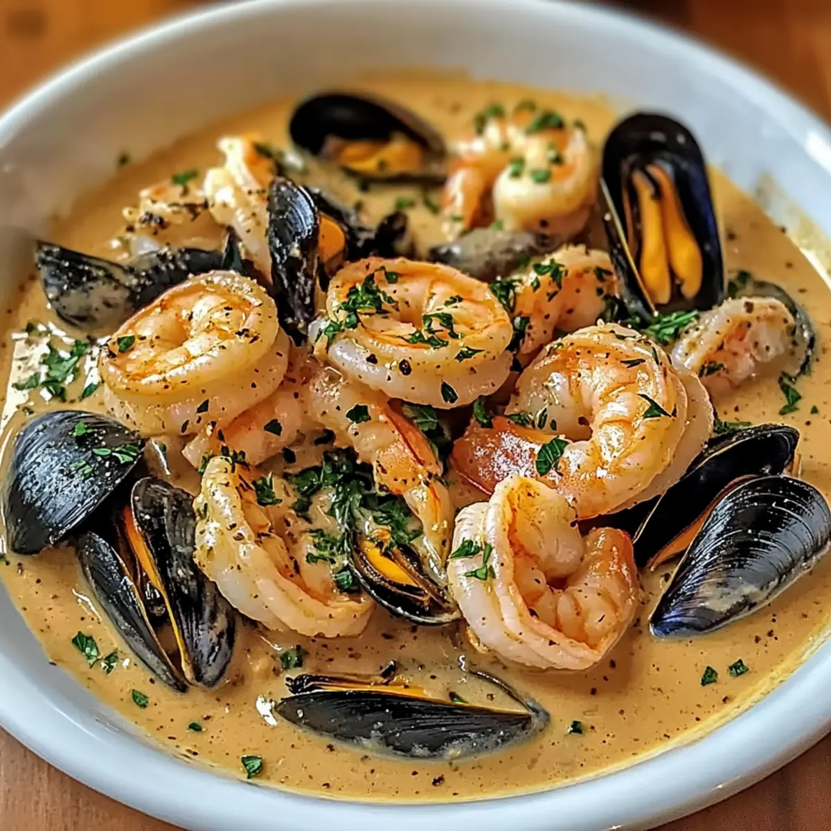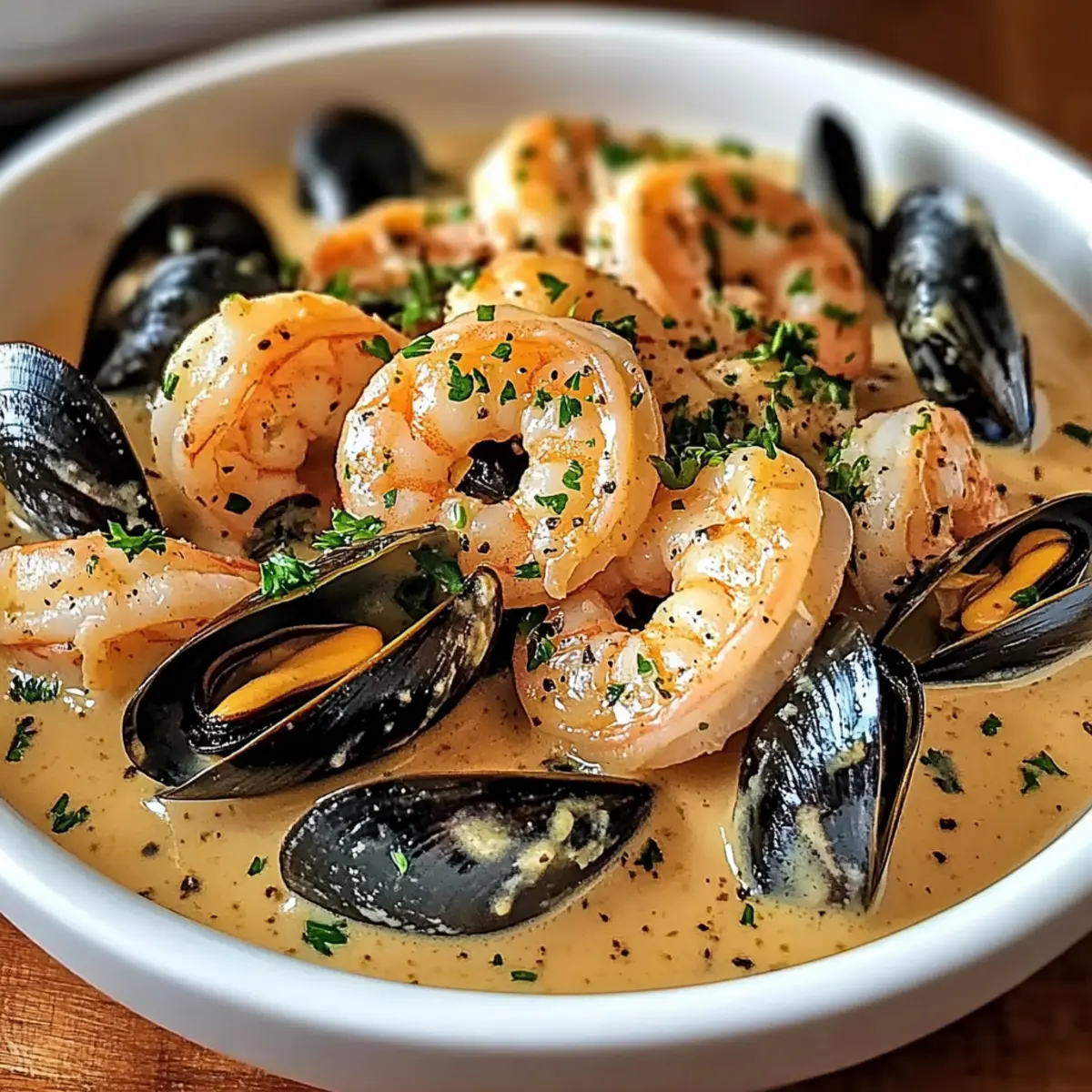 Jump to Recipe Print RecipeThe kitchen was filled with a fragrant whisper of garlic and butter—my two favorite scents swirling together like an old friend’s embrace. In just 30 minutes, I whipped up a dish that would transform any ordinary evening into a culinary celebration: Shrimp and Mussels in Creamy Garlic Sauce. This recipe is not only gluten-free, but it offers the perfect balance between rich comfort and the bright zest of lemon. Picture succulent shrimp nestled beside tender mussels, all enveloped in a velvety garlic cream sauce that beckons you to savor each delightful bite. Plus, it’s quick enough for a weeknight dinner without sacrificing elegance. I can’t wait to share this crowd-pleasing dish with you! What will you pair with it for the ultimate dining experience? Why is this dish a must-try? Simplicity at Its Best: This recipe comes together in just 30 minutes, making it an ideal choice for busy weeknights when you crave something special. Rich, Luxurious Flavor: The creamy garlic sauce envelops the shrimp and mussels, creating a delightful umami experience that you won’t forget. Versatile Pairing Options: Serve it over pasta or with crusty bread to soak up every drop of that delicious sauce; either way, your guests will be impressed! Gluten-Free Enjoyment: You can indulge without worry, as this dish easily fits into a gluten-free lifestyle. Endless Customization: Feel free to experiment by adding your favorite herbs, or even a kick of heat with red pepper flakes. Each time you make it, it can be a new experience! Impressive Yet Easy: Your friends and family will think you’ve slaved away, but this dish proves you can impress without the stress. If you’re still looking for more delicious seafood recipes, check out my Garlic Butter Shrimp for another quick hit! Shrimp and Mussels in Creamy Garlic Sauce Ingredients For the Seafood • Shrimp – Adds sweetness and protein; use fresh or high-quality frozen, thawed shrimp for best results. • Mussels – Provides a briny flavor and texture; ensure they are fresh and discard any that don’t close when tapped. For the Garlic Cream Sauce • Butter – For richness in the sauce; you can also use olive oil for a lighter option. • Garlic – Essential for that aromatic flavor profile; fresh minced garlic is preferred for maximum taste. • White Wine – Enhances the sauce flavor as you deglaze; substitute with vegetable broth for a non-alcoholic version. • Heavy Cream – Gives the sauce its creamy texture; alternatives include half-and-half or coconut cream for lighter or dairy-free options. For Brightness and Seasoning • Lemon Juice & Zest – Balances the richness with brightness; fresh lemon will provide the best flavor. • Chopped Parsley – Adds freshness and a pop of color; can be substituted with other fresh herbs like basil or cilantro. • Salt & Pepper – Essential for tasting; adjust to your preference to enhance the overall dish. Each ingredient in this Shrimp and Mussels in Creamy Garlic Sauce plays a vital role, turning simple seafood into a spectacular meal. Enjoy creating this culinary masterpiece! Step‑by‑Step Instructions for Shrimp and Mussels in Creamy Garlic Sauce Step 1: Prepare Seafood Begin by cleaning the mussels under cold running water, scrubbing the shells to remove any debris. Ensure all mussels are closed; discard any that remain open after tapping. If using fresh or frozen shrimp, peel and devein them if necessary, rinsing under cool water and patting dry for a clean finish to your Shrimp and Mussels in Creamy Garlic Sauce. Step 2: Make Garlic Sauce In a large skillet, melt 3 tablespoons of butter over medium heat. Add 4 minced garlic cloves to the simmering butter, stirring constantly for 1-2 minutes until fragrant and just golden but not browned. This creates a flavorful base for the creamy sauce that will envelop your shrimp and mussels. Step 3: Add Wine Pour in 1/2 cup of white wine into the skillet, stirring gently to deglaze the pan and infuse the sauce with flavor. Allow the wine to simmer for about 3-4 minutes, letting it reduce slightly until the raw alcohol scent dissipates, which enhances the richness of the Shrimp and Mussels in Creamy Garlic Sauce. Step 4: Cook Mussels Carefully add the cleaned mussels to the skillet, then cover with a lid. Steam for about 5 minutes until the mussels have opened beautifully. It’s essential to discard any mussels that remain closed, as they are not safe to eat, ensuring your dish is both delicious and safe for enjoyment. Step 5: Add Shrimp Gently fold in the prepared shrimp into the skillet with the mussels. Allow the shrimp to cook for 3-4 minutes until they turn pink and opaque, stirring occasionally. The shrimp will absorb all the flavors from the garlic cream sauce, making your Shrimp and Mussels in Creamy Garlic Sauce even more delectable. Step 6: Finish Sauce Lower the heat and pour in 1 cup of heavy cream, stirring gently to combine. Allow the mixture to simmer for another 3-5 minutes until the sauce thickens to a luscious consistency. This creamy coating will perfectly envelop your seafood, adding a velvety texture to the final dish. Step 7: Season Stir in the juice and zest of one lemon, along with a handful of chopped parsley. Season the sauce to taste with salt and pepper, adjusting the flavors to your liking. The acidity from the lemon brightens up the rich creaminess, creating a balanced Shrimp and Mussels in Creamy Garlic Sauce that sings with flavor. Step 8: Serve Immediately Once everything is perfectly combined and heated through, it’s time to serve your shrimp and mussels immediately. Ladle the seafood and creamy garlic sauce into bowls or plates, garnishing with extra parsley for a pop of color. Pair this dish with crusty bread or pasta to enjoy every last drop of that irresistible sauce. Expert Tips for Shrimp and Mussels in Creamy Garlic Sauce Don’t Overcook: Avoid overcooking the shrimp and mussels 