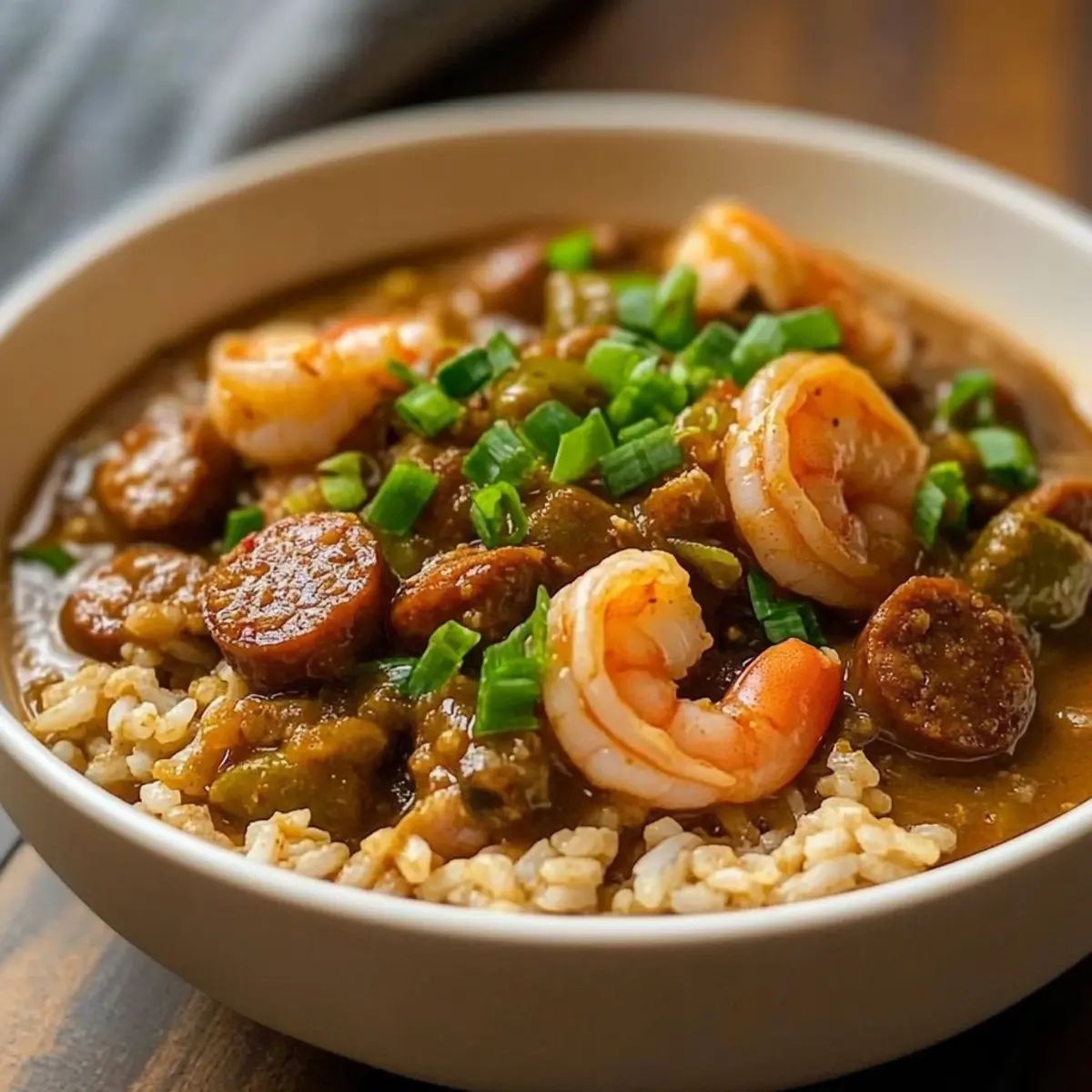 Ladle the piping hot Shrimp Gumbo with Andouille over your prepared brown rice in individual serving bowls. For an added touch of freshness, consider garnishing with chopped green onions or parsley. This delicious dish not only delivers warmth and comfort but also makes for a beautifully presented meal ready to impress!
