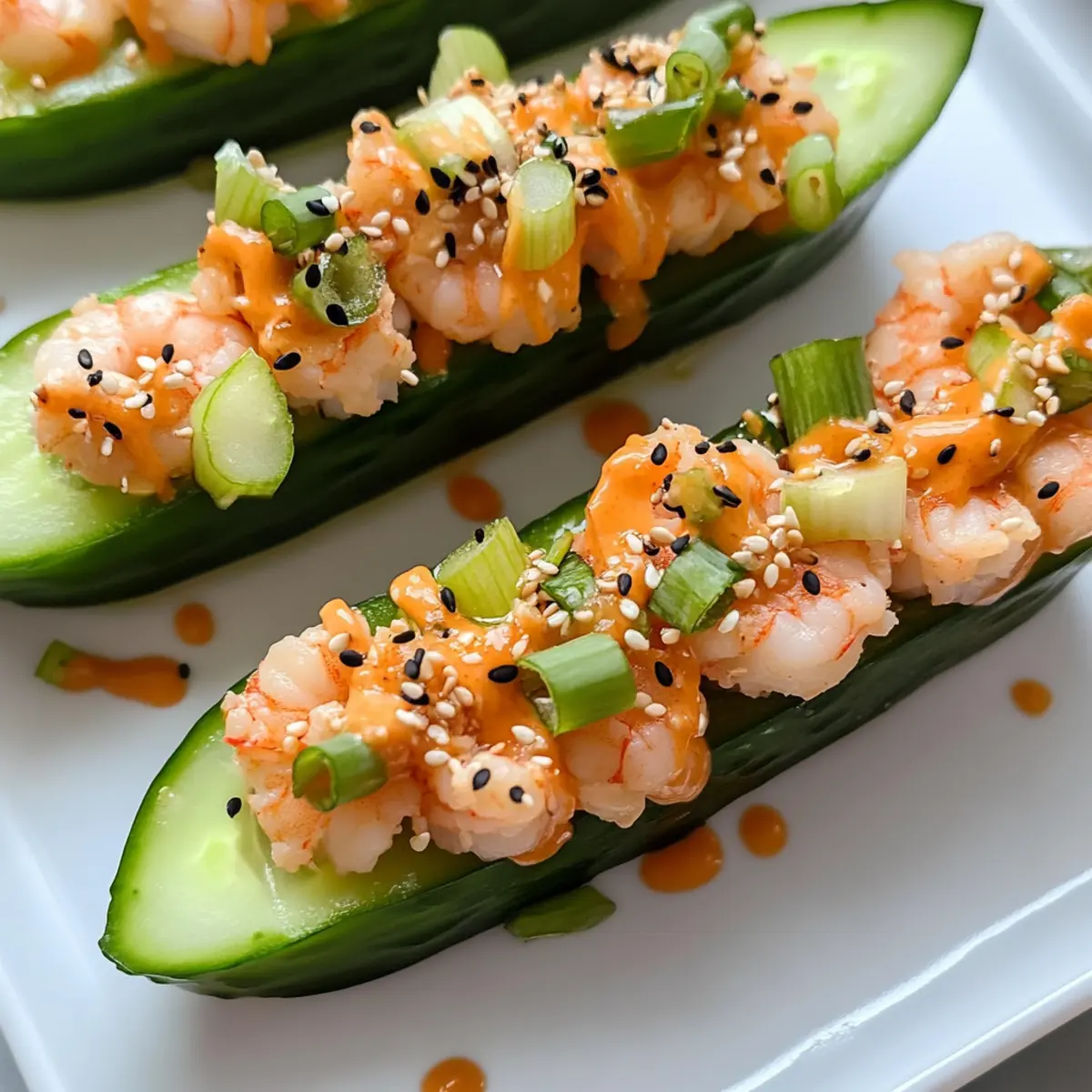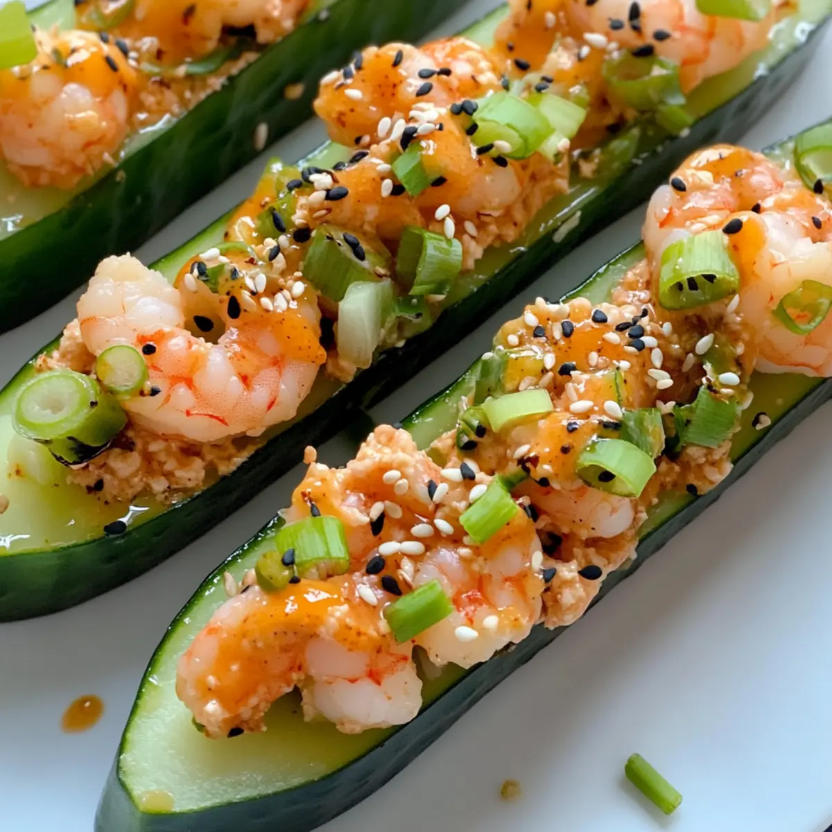 Jump to Recipe Print RecipeOne sunny afternoon, I found myself craving sushi but also wanted something healthier and quicker to whip up. That’s when I stumbled upon the idea of making Shrimp Sushi Cucumber Boats with Oregon Bay Shrimp. These delicious little creations offer a fresh and low-carb twist on traditional sushi rolls, combining juicy shrimp with crisp cucumbers for a delightful crunch. Preparing them is a breeze, making them perfect for a light lunch, an appetizer for gatherings, or just a quick snack to satisfy your seafood cravings. Plus, they’re not just a feast for the eyes but also a nourishing choice brimming with vibrant flavors and textures. Curious to dive into this easy seafood sensation? Why Try Shrimp Sushi Cucumber Boats? Fresh and Flavorful: These Shrimp Sushi Cucumber Boats burst with the taste of Oregon Bay shrimp, ensuring every bite is a delight. Low-Carb Option: Perfect for those looking to cut carbs without sacrificing flavor, these boats keep things light and satisfying. Quick to Prepare: With minimal prep time, you’ll have a delicious meal ready in no time, making them ideal for busy days or last-minute gatherings. Crowd-Pleasing Appeal: Serve these vibrant boats at your next gathering, and watch them disappear as guests savor the unique twist on sushi. Customizable Delight: Feel free to personalize the filling with additions like avocado or swap out shrimp for crab—it’s all about your preference! Indulge in this seafood sensation and consider pairing it with Garlic Shrimp Over Mashed Potatoes for a complete meal experience! Shrimp Sushi Cucumber Boats Ingredients • Get ready to create these delightful bites! For the Filling Wild Oregon Bay Shrimp – The star ingredient brings a sweet and succulent flavor; feel free to use any pre-cooked shrimp if Oregon Bay isn’t available. Kewpie Mayo – This Japanese mayonnaise adds a unique richness; you can substitute it with regular mayo or a vegan option if needed. Sriracha – Provides a spicy kick; adjust to taste for a milder or bolder flavor. Toasted Sesame Oil – Infuses a lovely nuttiness; olive oil can be used as a suitable alternative. Green Onions (Diced) – Adds a fresh crunch; chives are a great, milder substitution if preferred. For the Cucumber Boats Large Cucumbers – These form the sturdy “boats” for your filling; choose firm, fresh cucumbers for the best results. For the Garnish Sriracha Mayo – A delicious topping made from mixing kewpie mayo and sriracha, ensuring a creamy finish; plain mayo works as a simpler alternative. Sesame Seeds – Sprinkled on top for crunch and visual appeal; poppy seeds can add an interesting twist. Now that you have these fresh ingredients ready, you’re all set to whip up your Shrimp Sushi Cucumber Boats with Oregon Bay Shrimp! Enjoy your culinary adventure! Step‑by‑Step Instructions for Shrimp Sushi Cucumber Boats with Oregon Bay Shrimp Step 1: Prepare the Cucumbers Begin by selecting firm, fresh cucumbers and cutting them in half lengthwise. Carefully scoop out the seeds using a spoon to create “boats” while ensuring the cucumber halves remain intact. You’ll want to keep the walls thick enough to hold the filling securely, which creates a lovely base for your Shrimp Sushi Cucumber Boats. Step 2: Make the Filling In a medium mixing bowl, combine the Oregon Bay shrimp with kewpie mayo, sriracha, diced green onions, and toasted sesame oil. Stir gently until all the ingredients are well mixed, ensuring the shrimp is evenly coated in the creamy mixture. This flavorful blend is the heart of your Shrimp Sushi Cucumber Boats, so take care to create a delightful consistency. Step 3: Assemble the Boats Take each prepared cucumber half and fill them generously with the shrimp mixture. Use a spoon to press the filling down gently, ensuring it holds its shape and doesn’t spill over. As you fill the boats, visualize how each bite will be bursting with flavor, thanks to the succulent Oregon Bay shrimp nestled in the crunchy cucumber. Step 4: Add Toppings Drizzle sriracha mayo over each filled cucumber boat for a touch of extra creaminess and heat, allowing it to cascade over the sides for a visually appealing effect. Finish by sprinkling additional diced green onions and sesame seeds on top, creating a delightful garnish that enhances the look and taste of your Shrimp Sushi Cucumber Boats. Step 5: Serve and Enjoy These Shrimp Sushi Cucumber Boats are best enjoyed fresh for the ultimate crunch and flavor experience. Arrange them on a serving platter, perhaps on a bed of fresh greens, for an inviting presentation. As you gather around the table, get ready to delight in these vibrant, low-carb snacks that are sure to impress friends and family alike. Expert Tips for Shrimp Sushi Cucumber Boats Choose Fresh Shrimp: Ensure your Oregon Bay shrimp is cooked and fresh. If using frozen, defrost thoroughly before mixing to maintain texture and flavor. Cucumber Selection: Opt for firm, large cucumbers to prevent sogginess. Thinner cucumbers may yield weak boats that can’t hold the filling well, so pick wisely! Adjust the Heat: Sriracha can vary in spice levels; start with a small amount and gradually add more if you like it hotter. This will keep your Shrimp Sushi Cucumber Boats appealing to every palate. Mix Well: When combining the filling, ensure the shrimp are evenly coated with the mayo and sriracha mixture for consistent flavor in every bite. Serve Fresh: These boats are best enjoyed immediately. If you must store them, keep the filling separate from the cucumbers to avoid sogginess—combine just before serving! Garnish with Care: Don’t skip the sesame seeds and green onion topping; they enhance texture and visual appeal, making your Shrimp Sushi Cucumber Boats more inviting. How to Store and Freeze Shrimp Sushi Cucumber Boats Fridge: Keep any leftover Shrimp Sushi Cucumber Boats in an airtight container in the fridge for up to 1 day. Store them