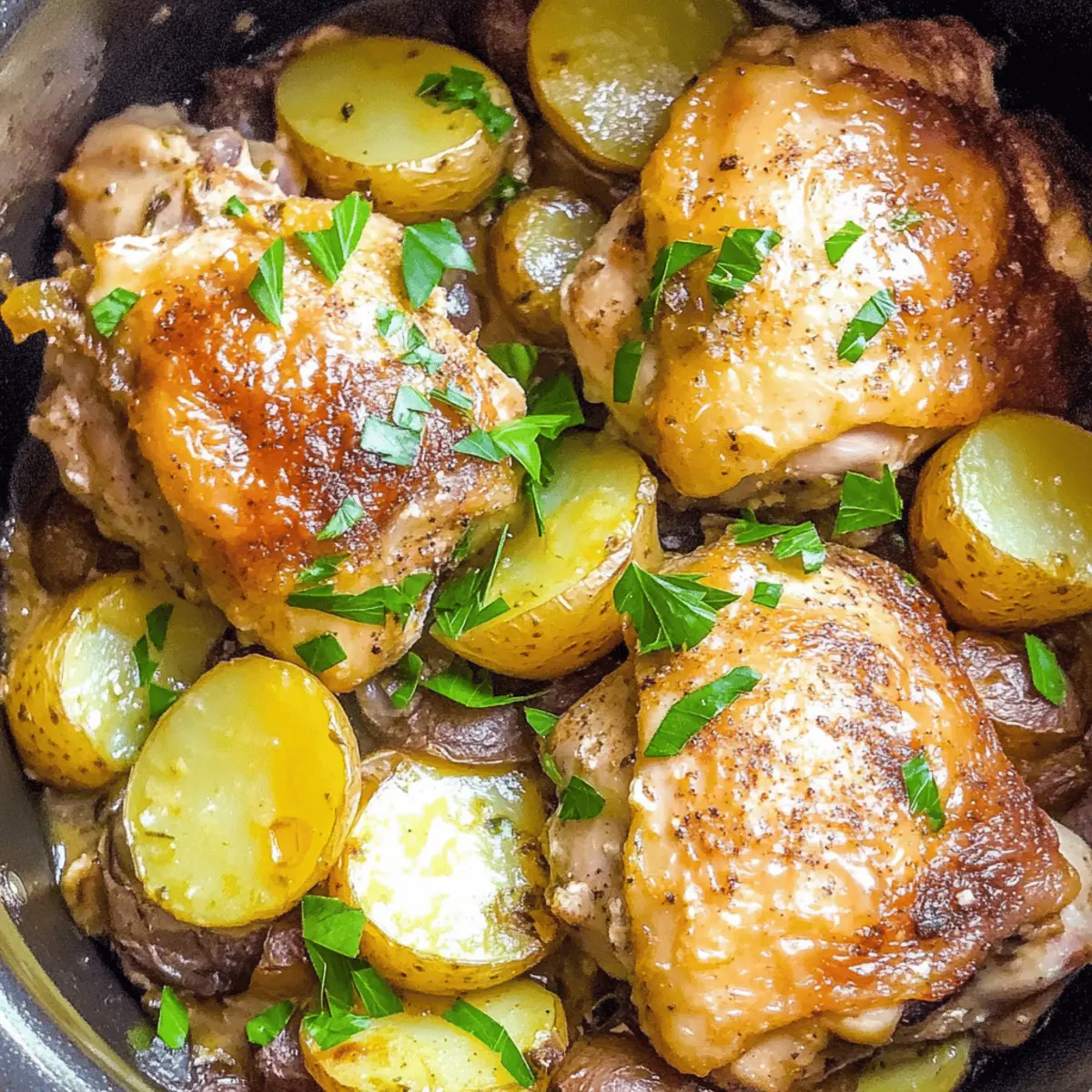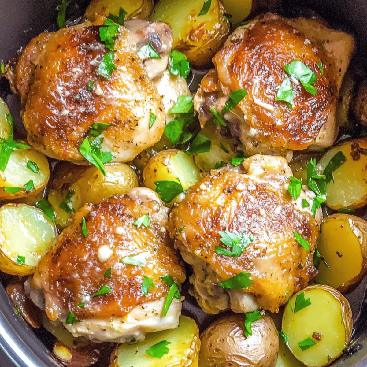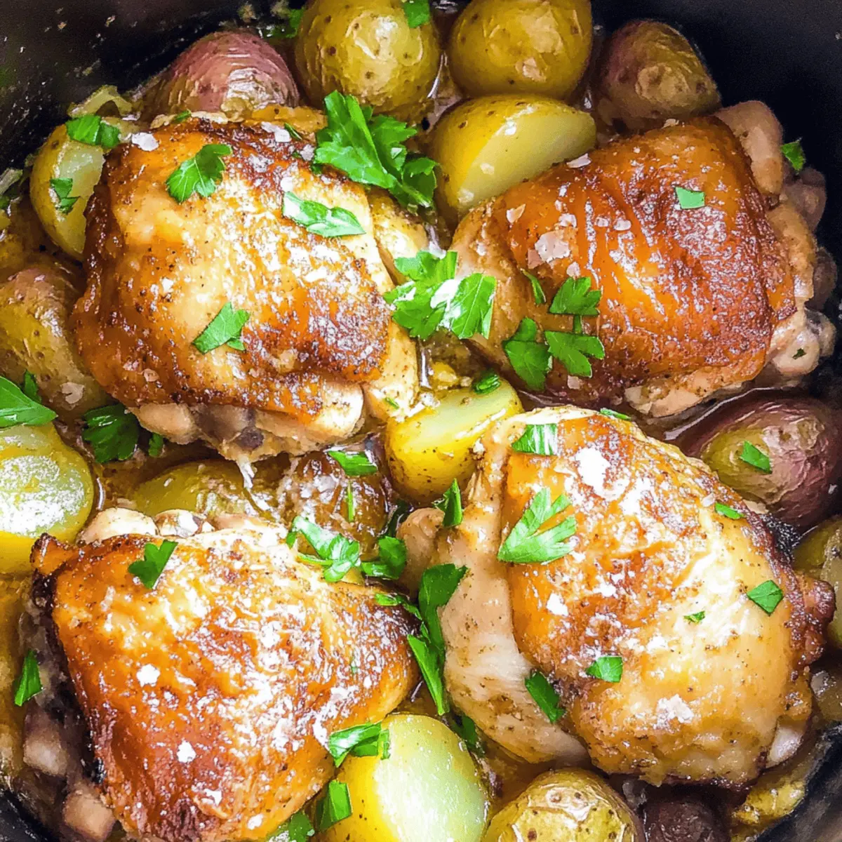 Jump to Recipe Print RecipeThe aroma of garlic wafting through the kitchen can transport you to a cozy bistro, where every meal feels like a warm embrace. With my Slow Cooker Garlic Parmesan Chicken and Potatoes, you don’t need to be a culinary expert to whip up an impressive, comforting dinner. This recipe is a lifesaver for those busy nights, allowing your slow cooker to do all the heavy lifting while you relish the satisfying blend of flavors. Not only is it a straightforward one-pot meal, but it also delivers that dreamy combination of tender chicken and creamy potatoes, making it a family favorite. Whether you’re entertaining guests or craving a homemade feast after a long day, this dish is sure to be a hit. Curious how to elevate your average weeknight dinner? Let’s dive into the delicious details! Why is this chicken recipe a must-try? Simplicity at its finest: This Slow Cooker Garlic Parmesan Chicken requires minimal prep time, making it perfect for busy weeknights. Flavor explosion: The combination of garlic and parmesan creates a mouthwatering aroma and taste that will transport you straight to culinary heaven. Ultimate comfort food: With tender chicken and creamy potatoes, this dish is the embodiment of cozy, home-cooked goodness. Versatile for any occasion: Whether it’s a family dinner or brunch with friends, this recipe is sure to impress any crowd. Time-saving solution: Let your slow cooker do the work while you relax, giving you more time for what matters most. For more delicious chicken recipes, check out our Honey Garlic Chicken or Chicken Parmesan Sandwiches! Slow Cooker Garlic Parmesan Chicken Ingredients • For the Chicken Bone-in, Skin-on Chicken Thighs – Main protein source, lending rich flavor and moisture; substitute with boneless thighs for a quicker cook but expect drier meat. Garlic (minced) – Essential for aroma and flavor; fresh garlic is highly encouraged for the best taste. • For the Seasoning Garlic Salt – Adds flavorful depth; if you don’t have it, regular salt works fine as long as you add garlic separately. Paprika – Provides warmth and vibrant color; can be swapped with smoked paprika for a different flavor dimension. Pepper – Adds a touch of spice and complexity; feel free to use your favorite variety based on preference. • For the Cooking Olive Oil – Used for searing the chicken to lock in moisture; can be replaced with vegetable oil if desired. • For the Side Baby Potatoes – Hearty side that absorbs delicious flavors; substitute with regular potatoes, cut to similar sizes for even cooking. Shredded Parmesan – Introduces a cheesy finish and bursts of flavor; consider using nutritional yeast for a non-dairy alternative. • Garnish Parsley – Adds a fresh note and a pop of color to the presentation; optional but highly recommended for visual appeal. Enjoy preparing this Slow Cooker Garlic Parmesan Chicken as it creates a deliciously aromatic meal that pleases the entire family! Step‑by‑Step Instructions for Slow Cooker Garlic Parmesan Chicken Step 1: Prepare Seasoning In a small bowl, combine garlic salt, paprika, and pepper, mixing well to create a flavorful seasoning blend. This step ensures that the chicken will absorb all the delicious flavors you want in your Slow Cooker Garlic Parmesan Chicken. Set this mixture aside so it’s ready when you need to spice up your chicken and potatoes. Step 2: Sear Chicken In a large skillet, heat olive oil over medium-high heat. Add the bone-in, skin-on chicken thighs skin-side down, searing for about 2 minutes until golden brown and crispy. This initial searing locks in moisture and enhances flavor, creating a deliciously rich base for your slow-cooked meal. Once beautifully browned, carefully transfer the chicken to a plate. Step 3: Prep Potatoes Take your baby potatoes and halve or quarter them to ensure they cook evenly. In a mixing bowl, toss the potatoes with the remaining seasoning and minced garlic, coating them thoroughly for maximum flavor. Arrange the seasoned potatoes in an even layer at the bottom of the slow cooker, as they will soak up all the savory goodness while cooking. Step 4: Layer and Cook Place the seared chicken thighs directly on top of the seasoned potatoes in the slow cooker. Cover with the lid, setting your slow cooker to LOW for 6-7 hours or HIGH for 3-4 hours. This slow and gentle cooking method will break down the chicken’s fibers, resulting in tender, juicy meat that falls off the bone while the potatoes cook to creamy perfection. Step 5: Finish and Serve Once your Slow Cooker Garlic Parmesan Chicken is fully cooked, sprinkle shredded parmesan on top of the chicken and potatoes right before serving for that irresistible cheesy finish. Garnish with chopped parsley for a pop of color and fresh flavor, then serve this comforting meal straight from the slow cooker for a delightful family dinner. Slow Cooker Garlic Parmesan Chicken Variations Feel free to get creative and customize this recipe to suit your tastes and preferences! Vegetable Boost: Add carrots or green beans for a colorful veggie twist that enhances both flavor and nutrition. Boneless Option: Swap chicken thighs for boneless cuts for a quicker cook. Just remember they may dry out more easily. Herb Twist: Experiment with different herbs like thyme, rosemary, or oregano to elevate the flavor profile of your dish. Spicy Kick: Mix in red pepper flakes or a dash of hot sauce to add some heat and excitement to your meal. Creamy Alternative: Stir in a dollop of cream cheese or sour cream during the last hour of cooking for an extra creamy texture. Combine these variations with sides such as Cheddar Garlic Herb Potato Soup or Slow Cooker Cowboy Sandwiches for a well-rounded meal! Different Potatoes: Try using sweet potatoes for a healthier, naturally sweet alternative that pairs wonderfully with garlic and parmesan. Zesty Flavor: Add a splash of lemon juice or zest before serving to bright