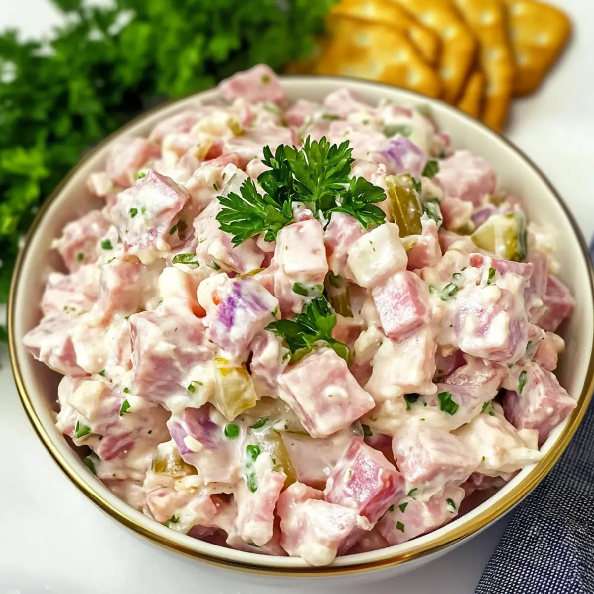 Jump to Recipe Print RecipeYou know that feeling when you take a bite of something that instantly transports you to sunny picnics and family gatherings? That’s exactly what my Southern Deviled Ham Salad does for me. It’s a delightful way to transform leftover holiday ham into a creamy, savory dish that’s perfect for quick appetizers or sandwiches. Not only is this recipe a breeze to whip up, but it also offers a delightful versatility that makes meal prep a joy, allowing you to serve it on crackers or as a filling in sliders. The zesty sweetness of sweet pickle relish adds just the right kick, making it a crowd-pleaser every time. Are you ready to discover how easy it is to bring this classic dish to your table? Why Is Deviled Ham Salad So Irresistible? Creamy Texture: The combination of mayonnaise and ham creates a smooth delight that spreads flawlessly on any surface. Quick & Easy: With minimal prep time, you’ll have a delicious dish ready to impress in no time, making it perfect for unexpected guests! Versatile Serving Options: This salad works wonderfully as a spread on crackers or stuffed in sliders, perfect for any gathering. Customizable Flavors: Adjust the recipe by adding crunch with diced celery or spice with hot sauce to suit your taste! Family Favorite: It’s a nostalgic dish that brings back memories and is sure to become a hit at your next family picnic or luncheon. Plus, you can explore more refreshing dishes like Tomato Salad Refreshing or Watermelon Cucumber Salad to complement your meal! Southern Deviled Ham Salad Ingredients Elevate your snacks with this classic dish! For the Salad Chopped Ham – Use quality leftover ham or fresh deli slices to ensure a savory base. Mayonnaise – Full-fat mayo delivers a rich creaminess, but low-fat varieties work well for a lighter option. Sweet Pickle Relish – Adds a zesty sweetness that perfectly balances the savory ham; opt for relishes without preservatives for best flavor. Optional Mix-ins Diced Celery – Introduces a satisfying crunch that elevates the salad’s texture. Chopped Green Onions – Offers a fresh, mild onion flavor that complements the dish beautifully. Hot Sauce – A few dashes provide a spicy kick, adding depth to your Southern Deviled Ham Salad. Step‑by‑Step Instructions for Southern Deviled Ham Salad Step 1: Combine Ingredients In a large mixing bowl, add your chopped ham, mayonnaise, and sweet pickle relish. Using a sturdy spoon, thoroughly mix the ingredients together until the ham is well-coated and the relish is evenly distributed throughout the Southern Deviled Ham Salad. This should take about 2-3 minutes, resulting in a cohesive, creamy texture. Step 2: Adjust to Taste Once combined, it’s time to taste your salad and adjust the flavors. If you prefer a creamier consistency, gradually stir in more mayonnaise until you reach your desired texture. Alternatively, add a bit more sweet pickle relish if you want to enhance the zesty sweetness. Give it another 1-2 minutes of gentle mixing to ensure all flavors meld beautifully. Step 3: Chill the Salad For the best flavor, cover the bowl with plastic wrap and place it in the refrigerator. Allow the Southern Deviled Ham Salad to chill for at least 30 minutes. This resting period helps the flavors to develop fully, making every bite deliciously satisfying when you finally serve it. Step 4: Serve and Enjoy After chilling, remove the salad from the fridge and give it a quick stir to redistribute the ingredients. Serve the Southern Deviled Ham Salad generously on crackers or as a filling in sandwiches. It’s a versatile dish perfect for any occasion, from casual snacks to festive gatherings, sure to please your guests. Helpful Tricks for Southern Deviled Ham Salad Flavor Balance: Start with less mayonnaise and relish to find your ideal flavor profile. You can always add more if needed! Mix Thoroughly: Ensure an even distribution of flavors by mixing well. This method is key for a delicious Southern Deviled Ham Salad. Chill Time: Allowing the salad to chill for at least 30 minutes enhances the flavors. Don’t skip this step for optimal taste! Ingredient Quality: Use quality chopped ham and fresh mayonnaise for the best flavor. Quality ingredients make the world of difference! Avoid Freezing: Don’t freeze the salad as the mayonnaise will separate when thawing, ruining the creamy texture. What to Serve with Southern Deviled Ham Salad Nothing pairs quite like the delightful flavors and textures of a well-rounded meal that brings comfort and joy to your table. Crispy Crackers: The crunch of crackers beautifully contrasts the creamy salad, providing a satisfying texture for each bite. Leafy Green Salad: A fresh side salad with mixed greens and a light vinaigrette enhances the flavors. Its crispness offers a refreshing balance. Sparkling Lemonade: This zesty drink cuts through the richness of the ham salad, adding a refreshing twist that complements the dish perfectly. Sweet Potato Chips: The natural sweetness and crunch of these chips make for a delightful pairing, mirroring the relish’s tangy sweetness. Vegetable Platter: Offer an assortment of carrots, celery, and bell peppers. Their crunch and freshness contrast the creaminess, making for a satisfying experience. Mini Slider Rolls: These soft rolls are perfect for piling on a generous scoop of salad, turning your dish into a handheld delight. Fruit Salad: A bright medley of seasonal fruits adds a touch of sweetness and color, making your meal feel vibrant and complete. Sparkling Water: A refreshing, bubbly beverage that cleanses the palate and elevates your dining experience without being overpowering. Chocolate Chip Cookies: For dessert, classic cookies add a sweet finish, providing the perfect closure to a delightful meal with their chewy goodness. Cheese Platter: A selection of cheeses complements the rich ham salad, introducing exciting flavor pairings for the palate to explore. Storage Tip