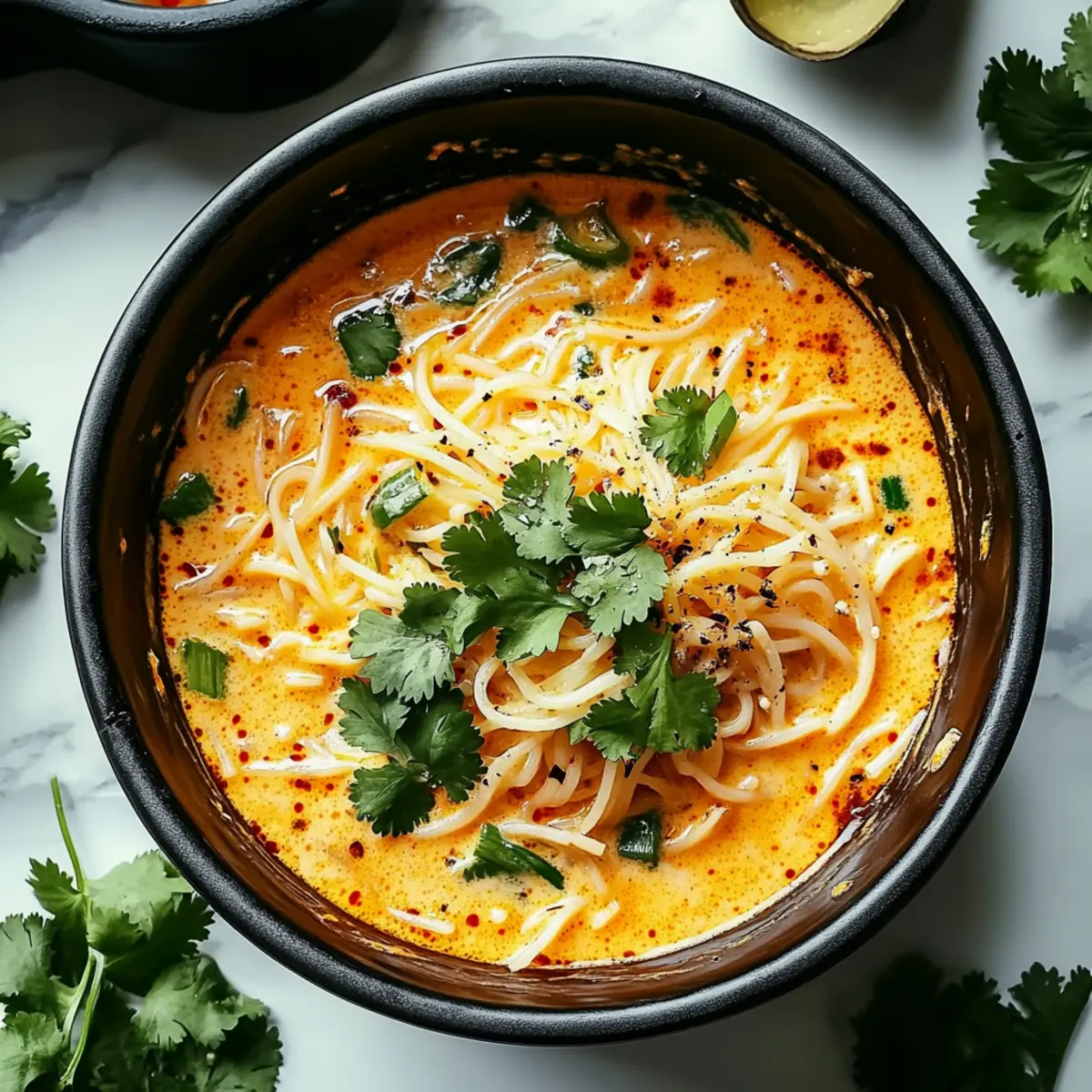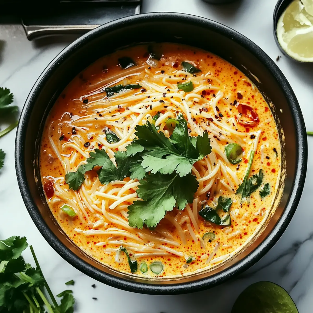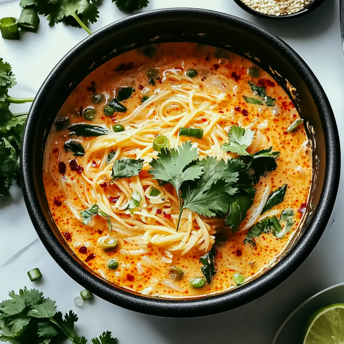 Jump to Recipe Print RecipeAs I stirred the pot, the scent of garlic and ginger danced through the kitchen, reminding me why cooking is such a joy. Enter Spicy Coconut Noodles—my go-to comfort food that marries creamy coconut milk with just the right amount of spice. This recipe is as quick as it is satisfying, perfect for those hectic weeknights when you crave something delicious yet simple. With customizable spice levels and various noodle options, these noodles invite you on a culinary adventure tailored to your taste buds. Plus, it’s a fantastic way to enjoy a hearty meal that’s both vegan-friendly and gluten-free. Are you ready to transform your dinner routine with this easy and flavorful dish? Let’s dive into the recipe together! Why are Spicy Coconut Noodles a Must-Try? Flavor Explosion: Each bite of these Spicy Coconut Noodles is a luscious fusion of rich coconut milk and aromatic spices that will tantalize your taste buds. Quick & Easy: Whip up this gourmet meal in just 30 minutes—perfect for busy weeknights without sacrificing taste or nutrition. Customizable Fun: Whether you like it mild or extra spicy, you can adjust the heat level and noodle type to suit your preference, making it versatile for everyone. Healthy Comfort: Enjoy the satisfying creaminess and warmth while relishing the knowledge that this dish is vegan-friendly and gluten-free. Crowd-Pleaser: Serve it at gatherings, and watch as your friends and family rave about this delightful dish—it’s sure to become a favorite! Explore further with these delicious variations like Chicken Buttered Noodles or try pairing it with some Spicy Honey Pepper Chicken for an exciting twist! Spicy Coconut Noodles Ingredients Get ready to whip up a dish that will make your taste buds sing! For the Noodles Rice Noodles – The light and versatile base of the dish that absorbs all the flavors; you can swap these with soba or udon noodles for different textures. For the Sauce Vegetable Oil – Ideal for sautéing without overpowering; any neutral oil like canola or avocado works well. Garlic – Fresh garlic brings aromatic depth; if you’re in a pinch, powdered garlic can also do the trick. Fresh Ginger – Adds a warm kick; ground ginger is a substitute but might lose some of that vibrant flavor. Red Curry Paste – The heart of your Spicy Coconut Noodles, packed with spices; adjust the amount to suit your spice tolerance. Soy Sauce – Brings that essential umami flavor; if you’re gluten-free, opt for tamari instead. Sesame Oil – Adds a nutty richness; can be replaced with more vegetable oil if necessary. Coconut Milk – The creamy backbone of the sauce; use full-fat for the best texture, or a light version for fewer calories. Vegetable Broth – Helps loosen the sauce while enriching the flavor; homemade or store-bought works beautifully. Brown Sugar – Balances the dish perfectly; coconut sugar is a great alternative if you’re looking for a change. Lime Juice – Brightens up the dish, cutting through the richness; lemon juice makes for a suitable substitute. Chili Flakes – Adds that spicy kick; adjust according to your heat preference or use fresh chili for an extra burst. Salt and Black Pepper – Essential to balance all the flavors; always adjust to taste. For Garnishing Cilantro – Freshness on top, bringing brightness to each bite; basil or parsley can also work if you prefer. Green Onions – Adds a mild flavor and delightful crunch; feel free to skip if you’re aiming for simplicity. Peanut Butter – Introduces creaminess and a nutty undertone; almond or cashew butter can be used as alternatives. Sriracha Sauce – For those who crave a spicy finish; adjust as needed for your preferred level of heat. Get ready to dive into this comforting and flavorful dish of Spicy Coconut Noodles that combines the creaminess of coconut milk with delicious spices, elevating your home-cooked meal to new heights! Step‑by‑Step Instructions for Spicy Coconut Noodles Step 1: Prepare the Noodles Begin by boiling a large pot of water over high heat. Once it reaches a rolling boil, add the rice noodles and cook according to the package instructions, typically 4-6 minutes, until tender but still slightly firm (al dente). Drain the noodles in a colander and set them aside, letting some steam escape to avoid clumping. Step 2: Sauté Aromatics In a large skillet or wok, heat 2 tablespoons of vegetable oil over medium heat. Once the oil is shimmering, add minced garlic and ginger, sautéing them for 1-2 minutes until golden and fragrant. Stir continuously to prevent burning, as this will form the aromatic base for your Spicy Coconut Noodles. Step 3: Incorporate the Curry Paste Add 2-3 tablespoons of red curry paste to the skillet with the sautéed garlic and ginger. Stir well, cooking for another 1-2 minutes until the paste is fragrant and well combined, allowing the spices to bloom. This step brings the heat and depth of flavor that define your Spicy Coconut Noodles. Step 4: Mix in Sauces Pour in ¼ cup of soy sauce and 1 tablespoon of sesame oil, mixing thoroughly to combine all ingredients in the pan. Allow the mixture to come to a gentle simmer for about 1 minute, as this will meld the flavors together beautifully. The vibrant colors and aromatic scents should fill your kitchen. Step 5: Add Coconut Milk Slowly pour in one can (about 400ml) of full-fat coconut milk and ½ cup of vegetable broth, stirring continuously to create a smooth sauce. Let it simmer on low heat for 3-5 minutes, allowing the flavors to meld. The sauce should become creamy and slightly thickened, inviting you to taste it. Step 6: Sweeten and Spice It Up Next, mix in 1-2 tablespoons of brown sugar, juice from one lime, and 1-2 teaspoons of chili flakes or fresh chili. Stir well to fully dissolve the sugar and integrate all the flavors. Allow the sauce to simmer for an additional 2-3 minutes so the sweetness balances the spicy elements wonderfully. S