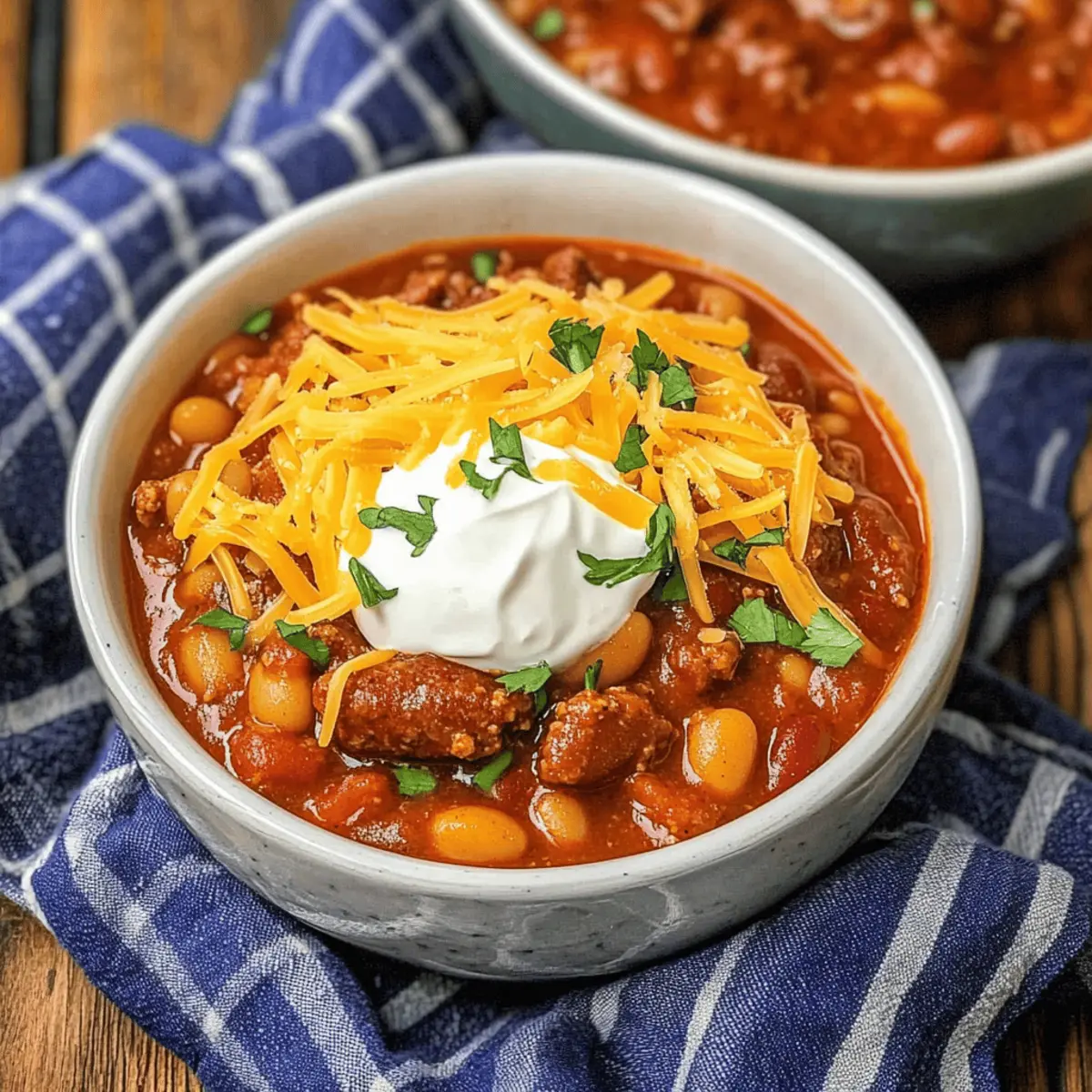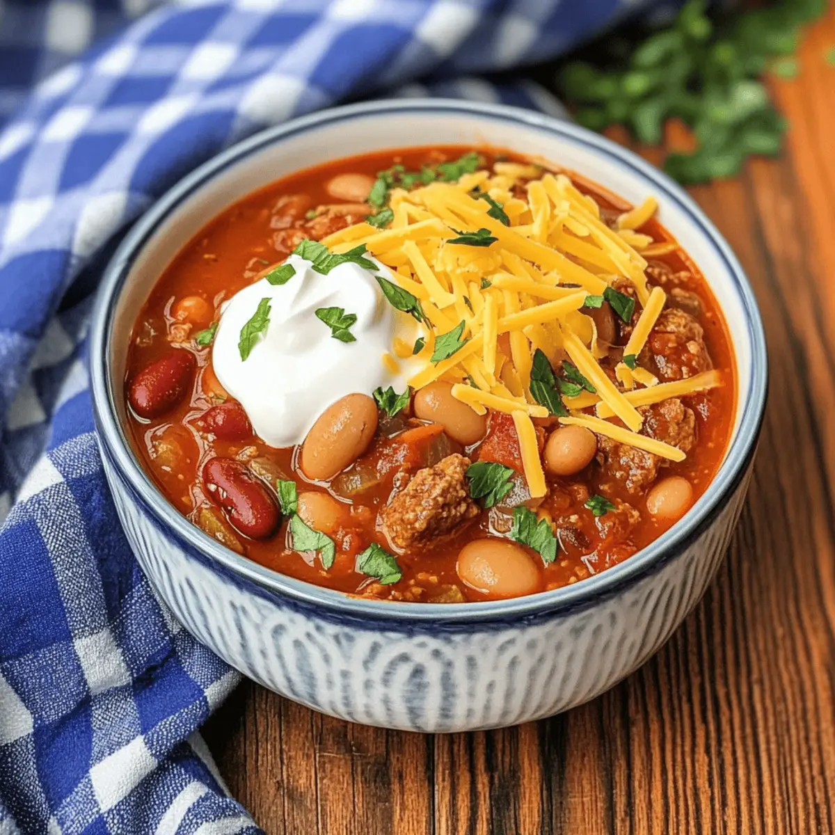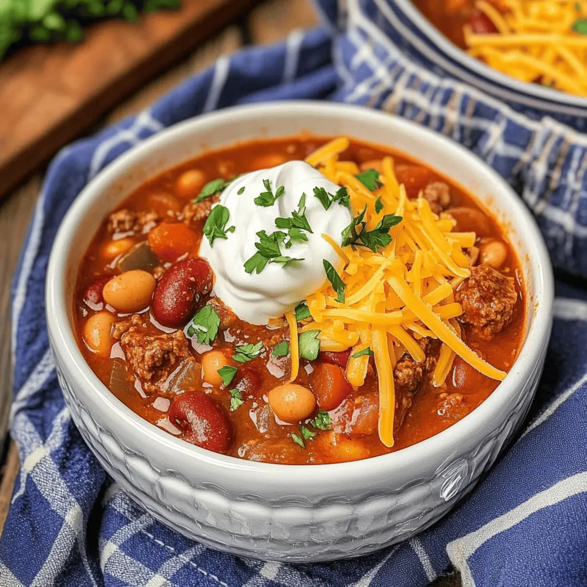 Jump to Recipe Print RecipeAs the chill of winter creeps in, a steaming bowl of Spicy Five Bean Steak and Sausage Chili is just the heartwarming remedy we all crave. You can almost feel the warmth radiating from the pot, filled with a medley of tender steak, spicy sausage, and five different beans all lovingly simmered together. What’s more, this comforting recipe not only comes together quickly, but it’s also a family-friendly feast that creates smiles—perfect for gatherings with loved ones. Whether you choose the stovetop or slow cooker method, you’ll find the process as rewarding as the joy it brings to your table. Curious about how to make this cozy classic? Let’s dive right in! Why is this chili a must-try? Hearty Comfort: This Spicy Five Bean Steak and Sausage Chili is the ultimate dish for chilly nights, delivering warmth and satisfaction in every bite. Simplicity Meets Flavor: With easy-to-follow instructions, even novice cooks can master this delicious recipe without breaking a sweat. Flexibility at Its Finest: Opt for stovetop or slow cooker methods to fit your busy schedule. Crowd-Pleasing Delight: Perfect for family gatherings, it’s a dish that invites smiles and a second helping. Nutrient-Rich: Packed with protein and fiber, it’s a wholesome meal that keeps you full and happy. Serve it alongside Cornbread for a complete comfort food experience! Spicy Five Bean Steak and Sausage Chili Ingredients • Gather your ingredients for a warm bowl of comfort! For the Chili Base Skirt or Flank Steak – Adds richness and protein; use tender cuts for best results. Hot Sausage – Provides spiciness and depth; substitute with mild sausage if desired. Ranch Style Beans (3 cans, 42 ounces) – Infuse flavor with spices, essential for the chili’s character; no direct substitute but other seasoned beans can work. Pre-cooked Black Beans (3 cups or 2 cans) – Contributes creaminess; canned options save time. Pre-cooked Great Northern Beans (3 cups or 2 cans) – Light texture enhances the bean variety. Pre-cooked Pinto Beans (3 cups or 2 cans) – Adds earthiness; can replace with other types of beans. Pre-cooked Light Red Kidney Beans (3 cups or 2 cans) – Offers color and additional protein. For the Tomato Mix Tomato Sauce (15 ounces or 1 can) – Provides a rich base; can use crushed tomatoes for a chunkier texture. Petite Diced Tomatoes (28 ounces or 2 cans) – For sweetness and acidity; fresh tomatoes can be substituted if in season. Diced Tomatoes with Green Chile (20 ounces or 2 cans) – Adds flavor and spice; fresh chilies can be used. Chopped Green Chile (7 ounces) – Enhances heat; optional for less spice. For the Vegetables Onion (1 small, chopped) – Builds flavor depth; shallots can serve as a substitute. Red Bell Pepper (1 small, chopped) – Adds sweetness; can use any bell pepper color. Green Bell Pepper (1 small, chopped) – Provides crunch; omit for fewer vegetables. For Seasoning Taco Seasoning (4 tablespoons) – Unifies spice profile; adjust according to heat preference. Dive into making this satisfying Spicy Five Bean Steak and Sausage Chili that warms not only your kitchen but also your heart! Step‑by‑Step Instructions for Spicy Five Bean Steak and Sausage Chili Step 1: Brown the Meat In a large pot over medium-high heat, warm a drizzle of oil, then add the skirt or flank steak. Sear the meat for about 4-5 minutes, turning occasionally until it’s nicely browned all over. This step enhances the flavor profile of the Spicy Five Bean Steak and Sausage Chili. Once browned, transfer the steak to a bowl and set it aside. Step 2: Cook the Sausage In the same pot, add the hot sausage, crumbling it as you go. Cook the sausage for about 5-7 minutes until it’s browned and has rendered its flavorful oils. Keep the heat at medium-high to support even cooking, ensuring the sausage gets that perfect golden-brown color. This step infuses the chili with warmth and depth. Step 3: Combine Ingredients Return the browned steak to the pot with the sausage, and mix in all the beans, tomato sauce, petite diced tomatoes, diced tomatoes with green chile, and chopped green chiles. Toss in the chopped onion and bell peppers as well. Stir the ingredients together until well combined, allowing the vibrant colors of the Spicy Five Bean Steak and Sausage Chili to shine. Step 4: Bring to a Simmer Increase the heat to medium-high and bring the mixture to a gentle simmer, stirring occasionally. Watch as the chili begins to bubble and the ingredients meld, about 5-10 minutes. This simmering step helps develop the rich flavors of the chili, filling your kitchen with enticing aromas. Step 5: Slow Cook for Rich Flavor Reduce the heat to low, cover the pot, and let it simmer for at least 4-6 hours. Stir occasionally to prevent sticking and ensure all the flavors integrate beautifully. The long, slow cooking time allows the beans to soften and the spices to deepen, creating a heartwarming Spicy Five Bean Steak and Sausage Chili perfect for chilly nights. Step 6: Serve and Enjoy Once the chili is thick and robust, it’s time to serve! Ladle the hot chili into bowls and top with your favorite toppings, such as shredded cheese and sour cream. Serve it over baked potatoes, rice, or with cornbread on the side. This comforting dish brings family and friends together, promising smiles all around. How to Store and Freeze Spicy Five Bean Steak and Sausage Chili Fridge: Store leftover chili in airtight containers for up to 3 days. Allow it to cool completely before sealing to preserve freshness. Freezer: Freeze portions in airtight containers or freezer bags for up to 3 months. Be sure to leave some space for expansion as the chili freezes. Reheating: Reheat individual portions on the stove over medium heat or in the microwave, stirring occasionally, until warmed through. This ensures your Spicy Five Bean Steak and Sausage Chili stays delicious! Make-Ahead: Feel free to make the chili ahe