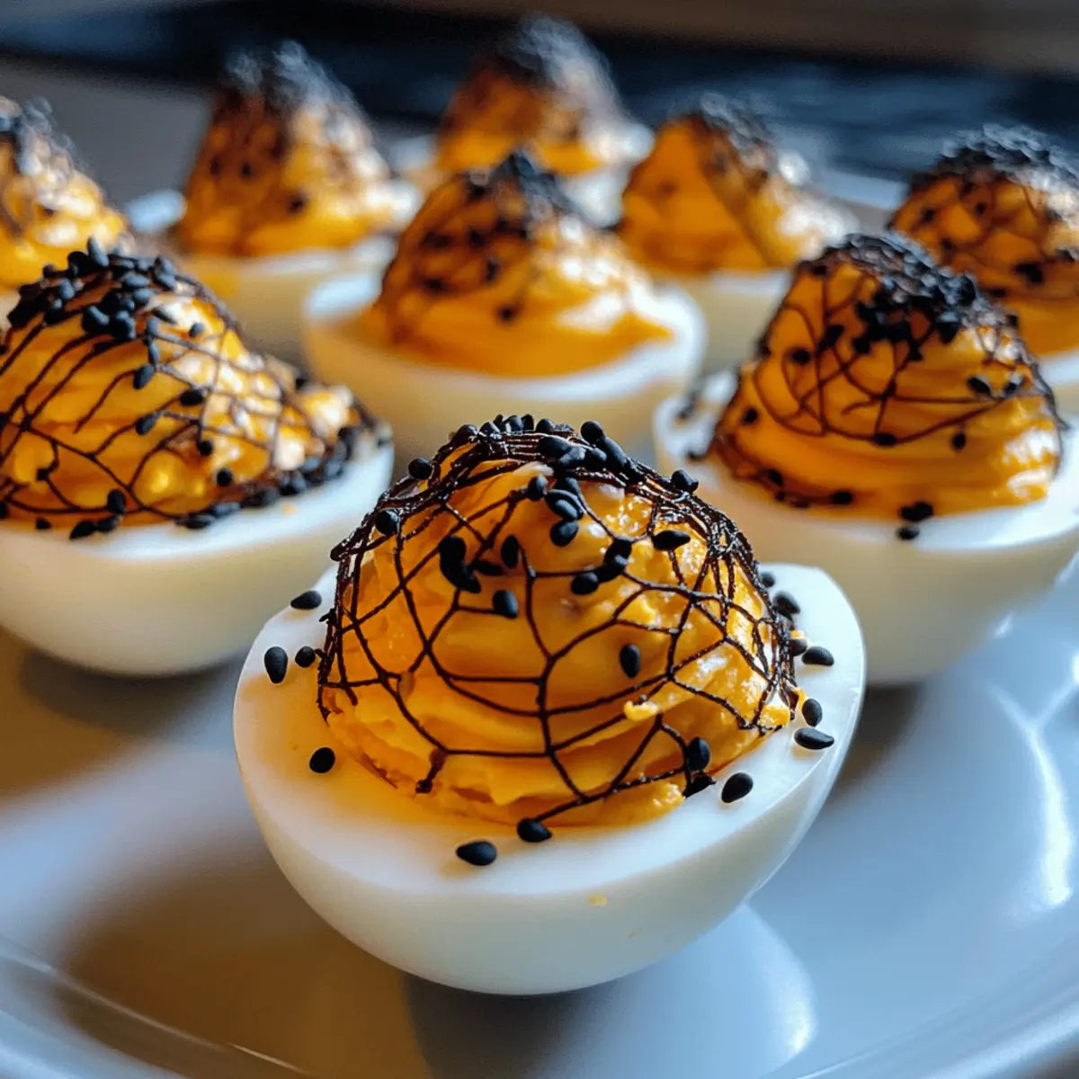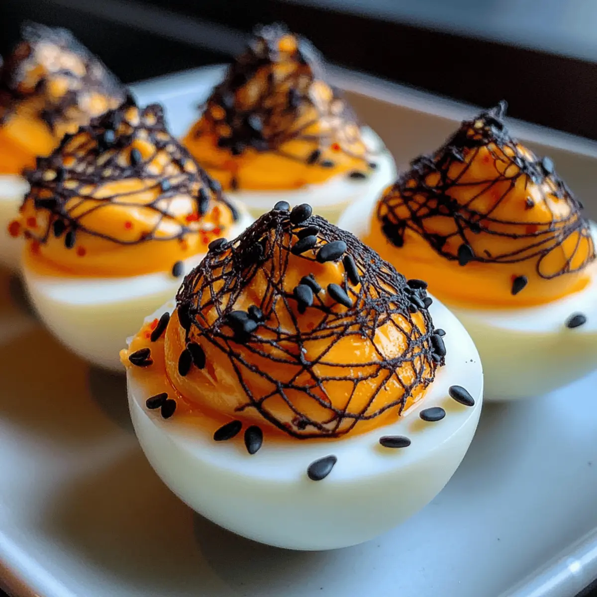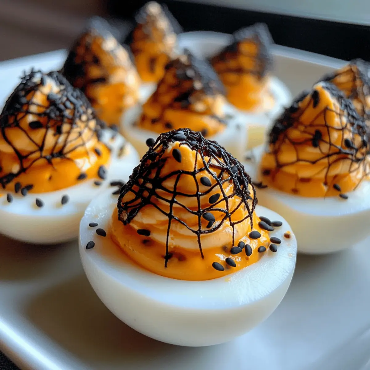 Jump to Recipe Print RecipeThe kitchen was filled with laughter and a hint of mischief as my friends and I planned our Halloween gathering. Amid the usual chatter about costumes, one idea transformed the air: Spooky Spiderweb Deviled Eggs! These fun, eerie bites not only make for a visually captivating appetizer but also pack a creamy, tangy punch that will leave guests raving. Plus, they’re quick to whip up and perfect for those of us ready to ditch the fast food in favor of homemade creations. Embrace the spirit of the season with these delightful eggs that are both vegetarian-friendly and low-carb. Curious about how to make your appetizer the highlight of the night? Let’s dive in! Why Are These Deviled Eggs So Unique? Creativity: Transform traditional deviled eggs into a Halloween showstopper with a striking black spiderweb design that will wow your guests! Ease: Quick to prepare, these delights require minimal ingredients and simple techniques that make cooking a breeze, ideal for both beginner cooks and seasoned chefs. Flavorful Twist: The creamy, zesty filling bursting with flavors from Dijon and apple cider vinegar ensures that every bite is a delicious experience. Versatile Options: Adjust the filling to suit your taste, like swapping grease for Greek yogurt in order to create a lighter dish. Explore ideas like adding a dash of hot sauce or vibrant orange for a festive flair! Crowd-Pleasing: Perfectly suited for any Halloween gathering, these Spooky Spiderweb Deviled Eggs are bound to be a crowd favorite, leaving everyone clamoring for more! If you love creative appetizers, you might also enjoy making Black Velvet Cake as a spooky dessert. Spooky Spiderweb Deviled Egg Ingredients • Get ready to make these delicious, Halloween-themed treats with the following ingredients! For the Eggs Eggs – Hard-boiled is the perfect base for traditional deviled egg flavor. Water – Essential for soaking the eggs to create the spiderweb effect, ensure you cover them completely. White Vinegar – Used in the soaking water to help set the color on the egg whites. For the Filling Mayonnaise – Adds creaminess to the yolk filling; Greek yogurt can make a healthy swap! Dijon Mustard – Enhances the filling with a tangy flavor; feel free to use yellow mustard for a milder kick. Apple Cider Vinegar – Brings tartness to the mixture; lemon juice works as a tasty alternative. Kosher Salt – Vital for seasoning throughout the dish; sea salt is a suitable substitute. Black Pepper – Adds warmth; optional if you prefer a milder taste. For the Garnish Smoked Paprika – A sprinkle adds both flavor and color; regular paprika can be used if needed. Black Sesame Seeds – Provides a decorative touch; poppy seeds can be a fun alternative. Chives – Offers freshness as an optional garnish; green onions work well too. With these ingredients, you’ll be all set to create the unforgettable Spooky Spiderweb Deviled Eggs that scream Halloween fun while being vegetarian-friendly! Step‑by‑Step Instructions for Spooky Spiderweb Deviled Eggs Step 1: Crack the Eggs Begin by gently tapping the hard-boiled eggs on a hard surface to create fine cracks on the shells. Aim for a delicate approach, as you only want to fracture the outer layer, not break them apart. Once cracked, place the eggs into a bowl, ready for the next step. Step 2: Prepare the Soaking Solution In a separate bowl, combine enough water to fully submerge the eggs with a generous amount of black food coloring gel and a splash of white vinegar. Stir the mixture well until the color is evenly distributed. This solution is essential for achieving the iconic spiderweb pattern in your Spooky Spiderweb Deviled Eggs. Step 3: Soak the Eggs Submerge the cracked eggs in the prepared soaking solution, ensuring they’re fully covered. Place the bowl in the refrigerator and let the eggs soak for at least 3 hours, or ideally overnight, allowing the color to properly set and the spiderweb design to form. Step 4: Rinse and Peel After soaking, take the eggs out and rinse them under cool running water. This step helps to remove any excess color. Then, carefully peel the shells off to reveal the beautiful spiderweb pattern on the whites, making sure to be gentle to maintain the design intact. Step 5: Prepare the Filling Cut each egg in half lengthwise and scoop the yolks into a mixing bowl, discarding the egg whites. Use a fork to mash the yolks until smooth before adding mayonnaise, Dijon mustard, apple cider vinegar, kosher salt, and black pepper. Mix thoroughly until the filling is creamy and well-blended, ready to be piped back into the whites. Step 6: Add Color & Garnish For an extra spooky flair, feel free to add a few drops of black food coloring into the yolk mixture and stir until combined. Once the filling is ready, you can use a piping bag or a zip-top bag with a snipped corner to fill each egg white generously, creating a pleasing swirl that enhances the look of your Spooky Spiderweb Deviled Eggs. Step 7: Finish with Garnishes Finally, lightly dust the filled deviled eggs with smoked paprika and sprinkle with black sesame seeds for a decorative touch. Optionally, add finely chopped chives to each egg as a fresh garnish. The final presentation is not only appetizing but also adds a festive Halloween charm! Step 8: Serve and Enjoy Place the finished Spooky Spiderweb Deviled Eggs on a festive platter for serving. Chill them for a bit longer if needed before serving for the best texture. Watch your guests marvel at this creepy yet delightful Halloween treat, perfect for sharing at your gathering! How to Store and Freeze Spooky Spiderweb Deviled Eggs Fridge: Store any leftover Spooky Spiderweb Deviled Eggs in an airtight container for up to 3 days. Make sure to keep them chilled to maintain freshness. Make-Ahead: You can prepare the egg whites and yolk filling up to 24 hours in advance. Store them separately in airtight containers until ready to assemb