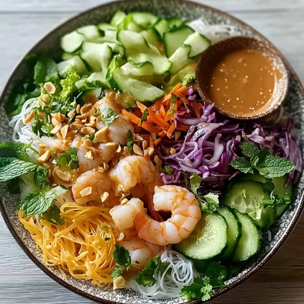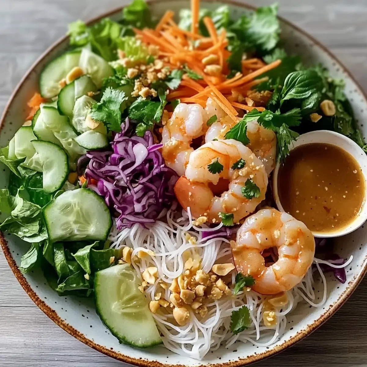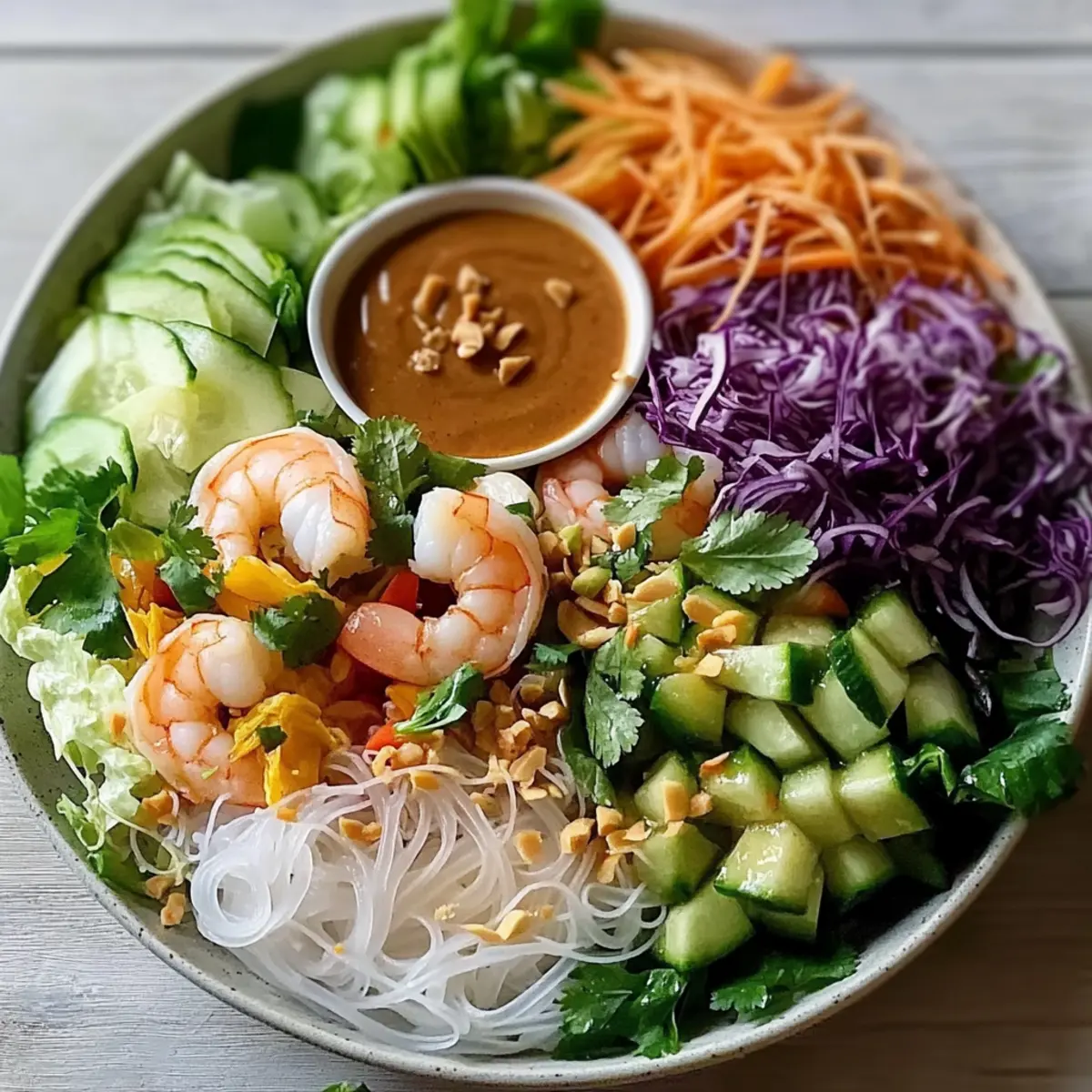 Jump to Recipe Print RecipeAs I strolled through the local market this morning, I was captivated by the stunning array of colorful vegetables just waiting to be transformed into something special. That’s when the idea for this vibrant Spring Roll Salad with Peanut Dressing hit me. This delightful dish marries crunchy veggies, cool rice noodles, and juicy shrimp, all kissed by a creamy peanut dressing infused with garlic, ginger, and a hint of lime. Best of all, it’s a breeze to whip up, making it the perfect choice for a quick lunch or a refreshing dinner on warm spring days. With customizable options to suit various dietary preferences, it’s as versatile as it is delicious. Are you ready to dive into a bowl of fresh, wholesome goodness? Why is this salad a must-try? Colorful, Fresh Ingredients: This Spring Roll Salad bursts with vibrant veggies and herbs that not only look appealing but also pack a nutritional punch. Quick Prep Time: Perfect for those busy weeknights, you can whip up this salad in just 20 minutes! Customizable Flavors: Tailor it to your taste; try swapping shrimp for grilled tofu or adding extra crunch with bell peppers. Zesty Peanut Dressing: The creamy dressing elevates the flavors, providing a delicious balance of sweet and savory. Ideal for Meal Prep: Make components in advance and simply toss them together when you’re ready for a fresh meal! Embrace the joy of homemade meals with this delightful recipe that’s ready to brighten your day! Spring Roll Salad with Peanut Dressing Ingredients • Get ready to create a refreshing masterpiece! For the Salad Rice Vermicelli – Main carbohydrate source for the salad, cook and cool to prevent sticking. Shredded Lettuce – Adds delightful crunch and bulk to your vibrant creation. Red Cabbage – Offers beautiful color and extra texture to every bite. Carrots – Imparts sweetness and crunch; bell peppers can be a fun alternative. Cucumber – Provides a refreshing crispness; zucchini works as a tasty substitute. Bean Sprouts – Contributes a fresh crunch; feel free to omit if you have none. Fresh Mint & Cilantro – Delivers aromatic freshness; parsley is a milder option if preferred. Green Onions – Adds a hint of sharpness; regular onions can be used for a subtler taste. Shrimp – Rich in flavor and protein; for a vegetarian twist, try firm tofu or tempeh. For the Dressing Peanut Butter – Acts as the creamy base; use sunflower seed butter for a nut-free option. Soy Sauce – Enhances umami depth and flavor; tamari can be used for gluten-free. Rice Vinegar – Adds a bright tang to your dressing; substitute with white wine or apple cider vinegar. Lime Juice – Brings acidity and brightness; lemon juice is a suitable alternative. Honey – Provides sweetness; maple syrup or agave nectar serve well as vegan substitutes. Garlic – Infuses depth of flavor; garlic powder is a good backup in a pinch. Ginger – Adds warmth and zing; opt for ground ginger if fresh is unavailable. Warm Water – Used to thin the dressing to your desired consistency. Sesame Oil – Imparts a nutty flavor; canola oil can be a suitable substitute. Chili Flakes – Adds a spicy kick; adjust according to your heat preference or omit for mildness. Dive into making this Spring Roll Salad with Peanut Dressing and experience the joy of fresh, delicious home-cooked food! Step‑by‑Step Instructions for Spring Roll Salad with Peanut Dressing Step 1: Cook the Rice Vermicelli Begin by cooking the rice vermicelli according to package instructions, typically around 4-6 minutes in boiling water until tender yet firm. Drain the noodles and immediately rinse them under cold water to halt the cooking process and prevent sticking. Set aside to cool while you prepare the other salad ingredients. Step 2: Prepare the Salad Base In a large mixing bowl, combine the shredded lettuce, red cabbage, julienned carrots, sliced cucumber, and bean sprouts. Toss the vegetables gently to combine for an even distribution of colors and textures. Take a moment to admire the vibrant medley as you prepare to add fresh herbs and green onions for additional flavor. Step 3: Add Fresh Herbs and Green Onions Next, incorporate the chopped fresh mint, cilantro, and sliced green onions into the bowl of vegetables. Gently fold everything together to combine, ensuring that the aromatic herbs are evenly spread throughout. This step will enhance the freshness of your Spring Roll Salad, making it even more inviting. Step 4: Combine the Protein Now, add the cooled rice vermicelli and cooked shrimp (or your choice of firm tofu for a vegetarian option) to the vibrant salad mixture. Carefully fold the ingredients together, being cautious not to break the noodles or shrimp. This will create a wonderful blend of textures throughout your Spring Roll Salad with Peanut Dressing. Step 5: Make the Peanut Dressing In a separate medium bowl, whisk together the peanut butter, soy sauce, rice vinegar, lime juice, honey, minced garlic, and grated ginger until smooth and creamy. If the dressing is too thick, gradually stir in warm water a tablespoon at a time until you reach your desired consistency. This creamy dressing brings richness to your salad. Step 6: Finish with Sesame Oil and Chili Flakes Drizzle in the sesame oil and sprinkle in the chili flakes, mixing well to incorporate these flavorful elements into your dressing. The nutty flavor from the sesame oil complements the creaminess of the peanut butter beautifully. Taste the dressing and adjust seasons if necessary, ensuring a perfect balance of flavors. Step 7: Dress the Salad Pour the prepared peanut dressing over the salad mixture. Using salad tongs or two large spoons, gently toss the salad until every ingredient is coated with the dressing. This step not only brings all the flavors together but also adds that irresistible creamy finish that makes the Spring Roll Salad truly delightful. Step 8: Serve with Garnish Transfer the dressed s
