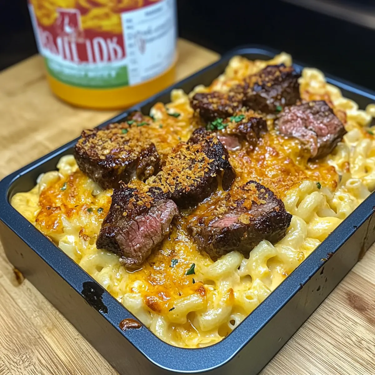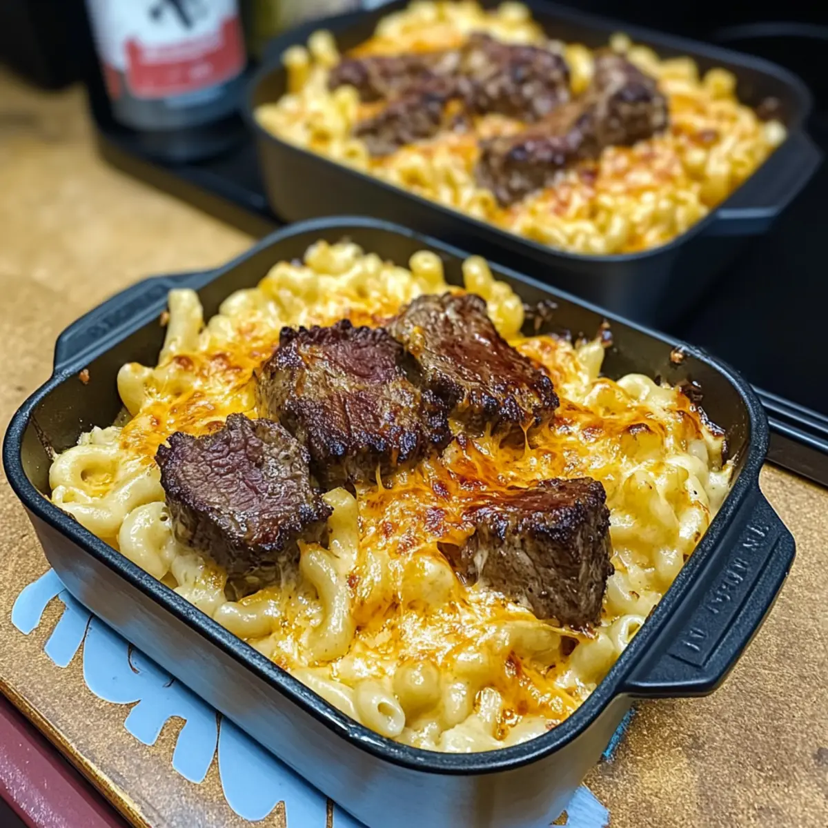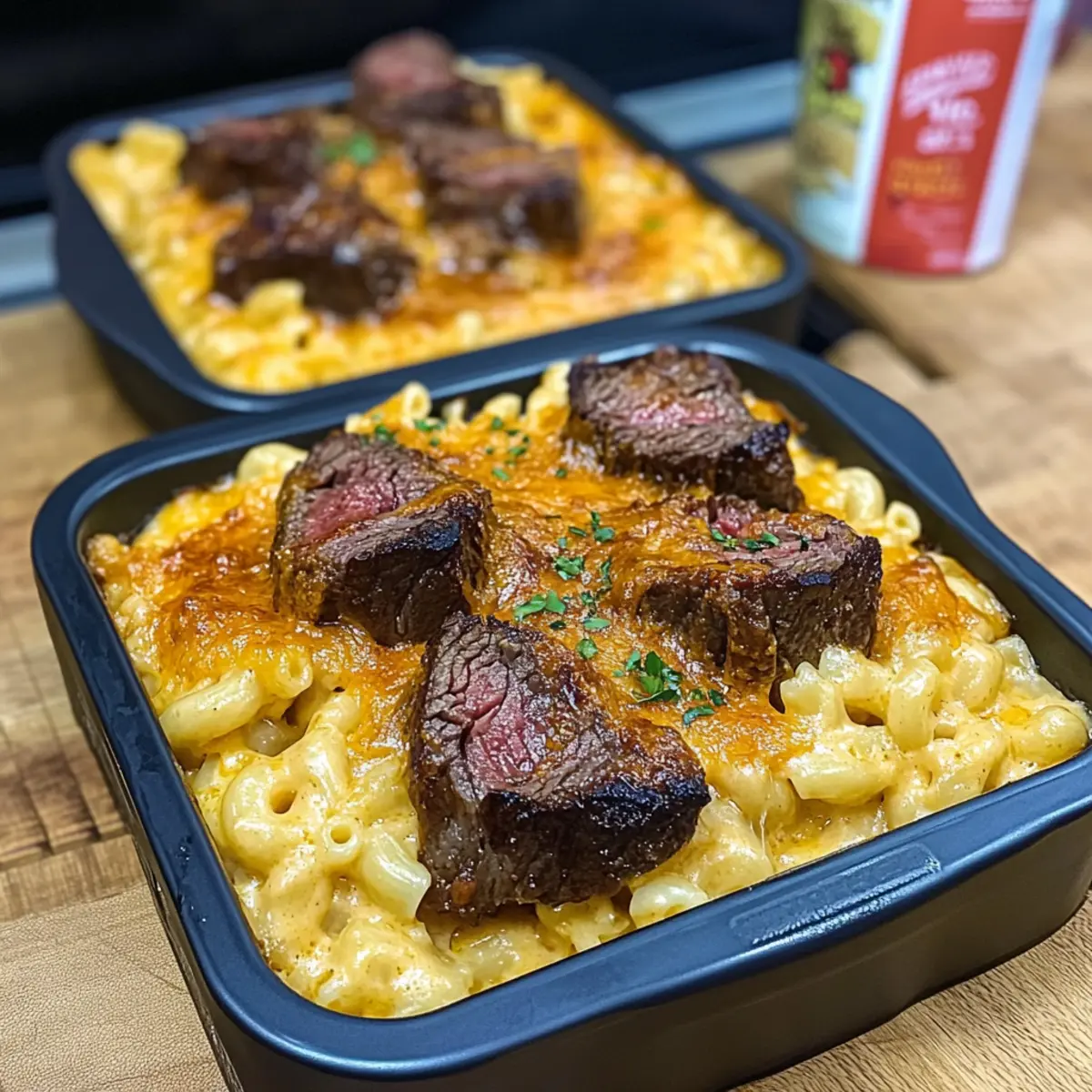 Jump to Recipe Print RecipeAs I stood in the kitchen, the alluring scent of sizzling steak filled the air, instantly transforming a regular weeknight into something extraordinary. This is the magic of Steak Bites with Mac N Cheese—where juicy steak meets creamy pasta to create an unforgettable meal that feels like a warm hug on a plate. Perfect for cozy family dinners or impressing guests, this dish is not only a hearty comfort food but also incredibly customizable. You can swap out the steak cuts based on what you have on hand, making it a versatile choice for any home chef. The delightful combination of smoky flavors and cheesy goodness will have everyone asking for seconds. Curious about how to bring this culinary gem to your table? Let’s dive into the recipe! Why Try Steak Bites with Mac N Cheese? Irresistible combination: The marriage of succulent steak bites and creamy mac and cheese creates a symphony of flavors that dances on your palate. Customize to your taste: This recipe allows you to easily swap steak cuts or add your favorite cheeses for a personal touch. Time-efficient and fun: Perfect for busy weeknights, it prepares quickly without sacrificing that rich, comforting appeal. Crowd-pleaser: Ideal for gatherings, it’s a hearty dish that everyone will adore—much like my Caramelized Banana Cheesecake, this is sure to impress! Note that leftovers can be made ahead for those crazy nights when you need satisfaction without the wait. Steak Bites with Mac N Cheese Ingredients For the Steak • NY Strip Steaks – A tender cut ideal for bite-sized pieces; try sirloin or ribeye for alternatives. • Smoked Paprika – Adds a smoky depth to the steak seasoning for extra flavor. • Garlic Powder – Enhances the overall taste; fresh garlic can intensify flavor even further. • Onion Powder – Provides a subtle sweetness that balances the seasoning. • Lite Creole Seasoning (Tony’s) – Adds a delightful kick, but feel free to substitute with other seasoning blends. • Avocado Oil – Acts as a binder for seasoning; olive oil works as a great alternative. For the Mac N Cheese • Pasta (16 oz) – The base of the dish; any pasta shape will do, but elbow macaroni is traditional. • Kosher Salt – Essential for flavoring the boiling water for the pasta. • Unsalted Butter (2/3 stick) – Forms the roux base for that creamy cheese sauce. • All-Purpose Flour (1/3 cup) – Thickens the cheese sauce; this is key to a velvety texture. • Lukewarm Whole Milk (3-4 cups) – Used for the cheese sauce; half-and-half can make it creamier. • Pepper Jack Cheese (2 slices) – Introduces spiciness and creaminess to the sauce. • Shredded Cheese Mixture (8 oz each of Gouda, Gruyere, sharp cheddar, mozzarella) – A blend that creates a rich and velvety sauce, contributing to the iconic mac and cheese flavor. • Reserved Shredded Cheese Mixture (1 1/2 cups) – Used for topping; enhances cheesiness and creates a lovely baked texture. Now that you have all the ingredients, let’s transform them into a dish that will warm your heart and satisfy your cravings. Are you ready to savor Steak Bites with Mac N Cheese? Let’s keep cooking! Step‑by‑Step Instructions for Steak Bites with Mac N Cheese Step 1: Prepare Steak Bites Cut the NY strip steaks into 1/4 to 1/2-inch cubes, ensuring uniform size for even cooking. In a mixing bowl, combine the steak pieces with smoked paprika, garlic powder, onion powder, Lite Creole seasoning, and a drizzle of avocado oil. Toss well to coat every piece of steak, then cover and refrigerate for at least 30 minutes to allow the flavors to meld. Step 2: Cook Pasta In a large pot, bring salted water to a rolling boil, then add your pasta of choice. Cook until al dente, usually about 10 to 12 minutes, stirring occasionally to prevent sticking. Once cooked, carefully drain the pasta in a colander and set aside, leaving some reserved pasta water for later if needed to adjust the cheese sauce consistency. Step 3: Make Cheese Sauce In a medium saucepan, melt the unsalted butter over medium heat. Whisk in the all-purpose flour and cook for 1–2 minutes until it forms a roux, bubbling lightly but not browning. Gradually pour in 3–4 cups of lukewarm milk, whisking continuously until the mixture thickens and coats the back of a spoon. Stir in the pepper jack and shredded cheese mixture until fully melted and smooth. Step 4: Combine Pasta and Cheese Sauce Add the drained pasta to the cheese sauce, stirring until each piece is coated in the creamy goodness. Transfer the mac and cheese into oven-safe bowls or a baking dish. Top each portion with the reserved shredded cheese mixture, allowing for a gooey, bubbly finish when baked. Step 5: Bake Preheat your oven to 350°F (175°C). Place the prepared mac and cheese in the oven and bake for 20 to 25 minutes, or until the top is golden and bubbly. For an extra crispy crust, switch to broil for the last 5 minutes, keeping a close eye to prevent burning. Step 6: Cook Steak Bites In a hot skillet over medium-high heat, add a small splash of avocado oil. Once shimmering, carefully add the marinated steak bites, ensuring not to overcrowd the pan. Sear for 3–4 minutes, turning occasionally until the steak is browned on the outside and cooked to your preferred doneness. Step 7: Serve Remove the mac and cheese from the oven, letting it cool slightly. Top each bowl of baked mac and cheese with the warm steak bites, creating a delightful presentation of flavors. Serve immediately, allowing everyone to dive into this hearty dish of Steak Bites with Mac N Cheese that promises comfort with every bite. Variations on Steak Bites with Mac N Cheese Feel free to get creative with this recipe and make it your own—each twist adds a unique layer of flavor and satisfaction! Different Cuts: Switch out NY Strip for Sirloin or Ribeye for varying flavors and tenderness. Each cut brings something special to your dish! Cheesy Varieties: