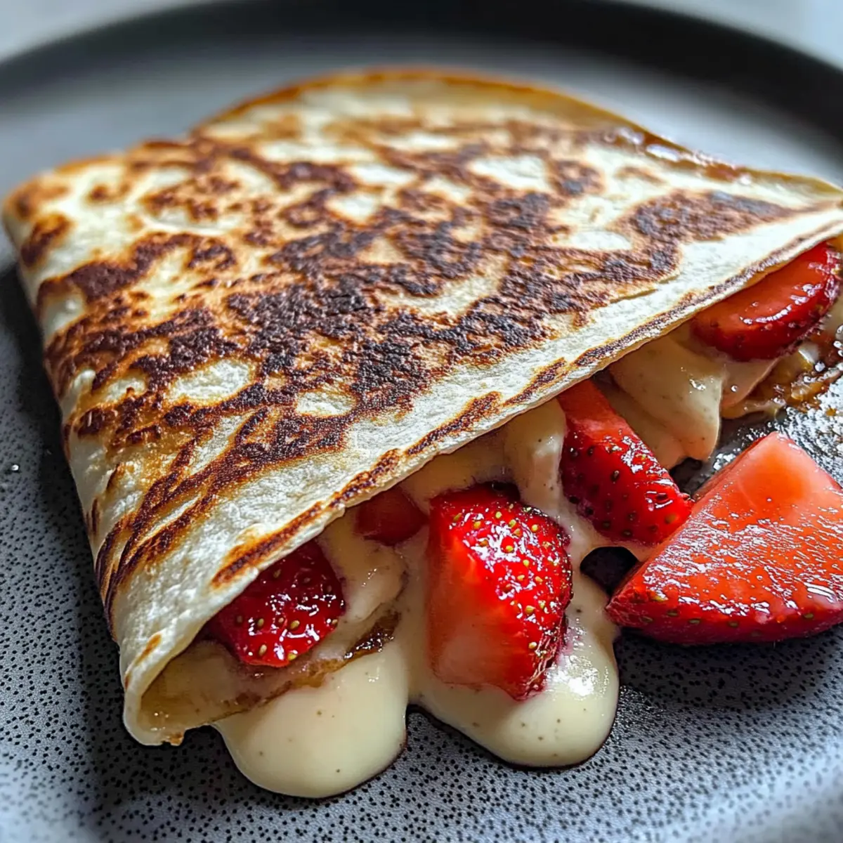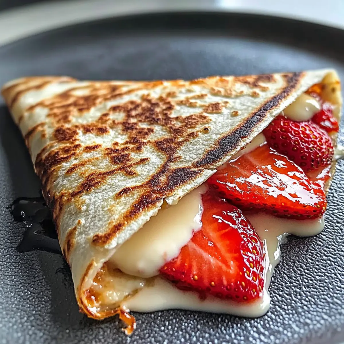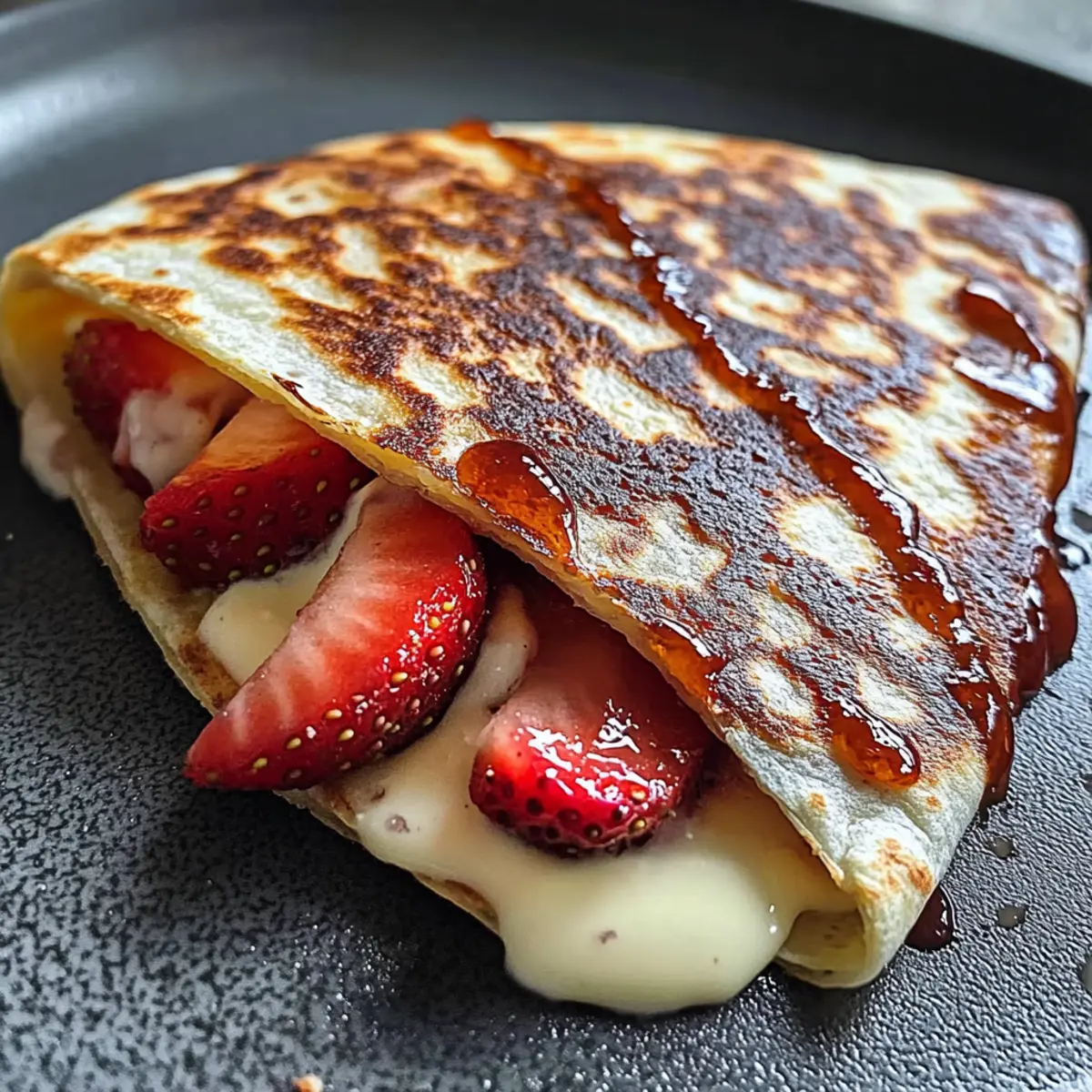Jump to Recipe Print RecipeAn unexpected twist on a classic has just landed in my kitchen: the Strawberry Cheesecake Quesadilla Dessert. Imagine that rich creaminess of cheesecake, embraced by a crispy, golden tortilla and vibrant, juicy strawberries. This delightful recipe marries the best of both worlds—there’s no oven required and it whisks together in mere minutes, making it the perfect quick dessert for those late-night sweet cravings or a fun brunch option. Not only is it simple to make, but it also adapts beautifully with various fruits; think blueberries or peaches for a seasonal spin. Ready to elevate your dessert game? Let’s dive into creating this scrumptious treat that promises to impress! Why Try This Unique Dessert Recipe? Simplicity at Its Finest: Creating the Strawberry Cheesecake Quesadilla Dessert is a breeze, requiring minimal prep and just a few ingredients. Rich, Creamy Texture: Enjoy the luscious cream cheese filling combined with fresh strawberries, wrapped in a crispy tortilla that creates a heavenly experience in every bite. Versatile Surprise: Switch up the filling easily with alternatives like blueberries or peaches, ensuring each time you make it, there’s a delightful twist. Quick Dessert Option: In just minutes, you’ll have a sweet indulgence ready, perfect for those unexpected guests or late-night cravings. Crowd-Pleasing Appeal: Serve it warm and watch as everyone savors this innovative take on dessert—pair it with a scoop of ice cream for a truly luscious treat! Looking for more fun dessert ideas? Try our Churro Cheesecake Bliss or the delightful Moist Strawberry Shortcake for added inspiration! Strawberry Cheesecake Quesadilla Ingredients • Dive into the flavor with these essentials! For the Creamy Filling Cream Cheese – Provides the rich, tangy base for the cheesecake flavor. Tip: Soften at room temperature or microwave in short bursts for easy mixing. Granulated Sugar – Sweetens the cream cheese to perfection. Substitution: For a lighter option, reduce the amount or use powdered sugar. Ground Cinnamon – Adds a warm aroma and enhances the overall flavor. Vanilla Extract – Brings depth and a hint of sweetness to the filling. For the Fruit Layer Strawberries – The star fruit of this dessert, providing freshness and a burst of flavor. Substitutions: Feel free to swap with blueberries, raspberries, or peaches for a fruity twist. For the Quesadilla Base Fajita-size Flour Tortilla – Offers a soft yet crispy texture when cooked. Note: Flour tortillas provide flexibility and hold the filling beautifully. For Cooking Unsalted Butter – Adds richness and helps caramelize the tortilla’s exterior. Substitution: If desired, a neutral oil can be used instead. For an Optional Drizzle Honey – A touch of sweetness that complements the dessert beautifully after cooking. These ingredients come together to create a truly memorable Strawberry Cheesecake Quesadilla dessert that will delight every bite! Step‑by‑Step Instructions for Strawberry Cheesecake Quesadilla Dessert Step 1: Prepare the Cream Cheese Filling In a mixing bowl, combine softened cream cheese with granulated sugar, ground cinnamon, and vanilla extract. Use a handheld mixer or a spatula to blend everything smoothly until the mixture is light and creamy, typically about 2-3 minutes. Ensure there are no lumps, as this will be the delicious filling for your Strawberry Cheesecake Quesadilla Dessert. Step 2: Slice Fresh Strawberries While the cream cheese filling is coming together, take fresh strawberries and rinse them under cool water. Pat them dry with a paper towel, then slice each strawberry evenly into thin rounds. Set the sliced strawberries aside on a plate, making sure they’re ready to layer on your quesadilla for added freshness and sweetness. Step 3: Assemble the Quesadilla Spread a generous layer of the cream cheese filling over one side of a fajita-size flour tortilla. Ensure you cover the tortilla evenly, leaving a small border around the edges. Next, layer the sliced strawberries on top of the creamy filling, distributing them across the tortilla for a delightful burst of flavor in every bite of your Strawberry Cheesecake Quesadilla Dessert. Step 4: Cook the Quesadilla In a medium skillet, melt 1-2 tablespoons of unsalted butter over medium heat. Once bubbling, sprinkle a pinch of sugar and cinnamon into the melted butter to enhance the flavor. Carefully place the assembled tortilla (cream cheese side facing up) into the skillet and cook for about 2-3 minutes, or until the bottom is light golden brown and crisp. Keep an eye on it to prevent burning. Step 5: Fold and Serve Once the bottom of the quesadilla is beautifully golden, gently fold it in half using a spatula. Remove it from the skillet and place it on a cutting board. If desired, drizzle with honey for an extra touch of sweetness. Cut it into wedges and serve immediately, enjoying the warm, creamy goodness of your Strawberry Cheesecake Quesadilla Dessert! What to Serve with Strawberry Cheesecake Quesadilla Dessert Indulging in a Strawberry Cheesecake Quesadilla Dessert calls for some delightful pairings that enhance its vibrant flavors. Vanilla Ice Cream: A classic complement, the creamy sweetness of vanilla ice cream perfectly balances the rich flavors of the quesadilla. Fresh Mint Leaves: Adds a refreshing touch, bringing a coolness that contrasts beautifully with the warm, crispy dessert. Chocolate Drizzle: Elevate your quesadilla with a decadent drizzle, enriching every bite with a luscious chocolatey flavor. For something special, consider serving this delightful dessert with a cup of freshly brewed coffee. The robust flavors cut through the sweetness, creating a harmonious finish to your meal. Whipped Cream: A dollop of fluffy whipped cream provides a light and airy texture that adds to the overall experience. Berry Compote: A warm berry compote not only enhances the fruitiness but also brings a lus