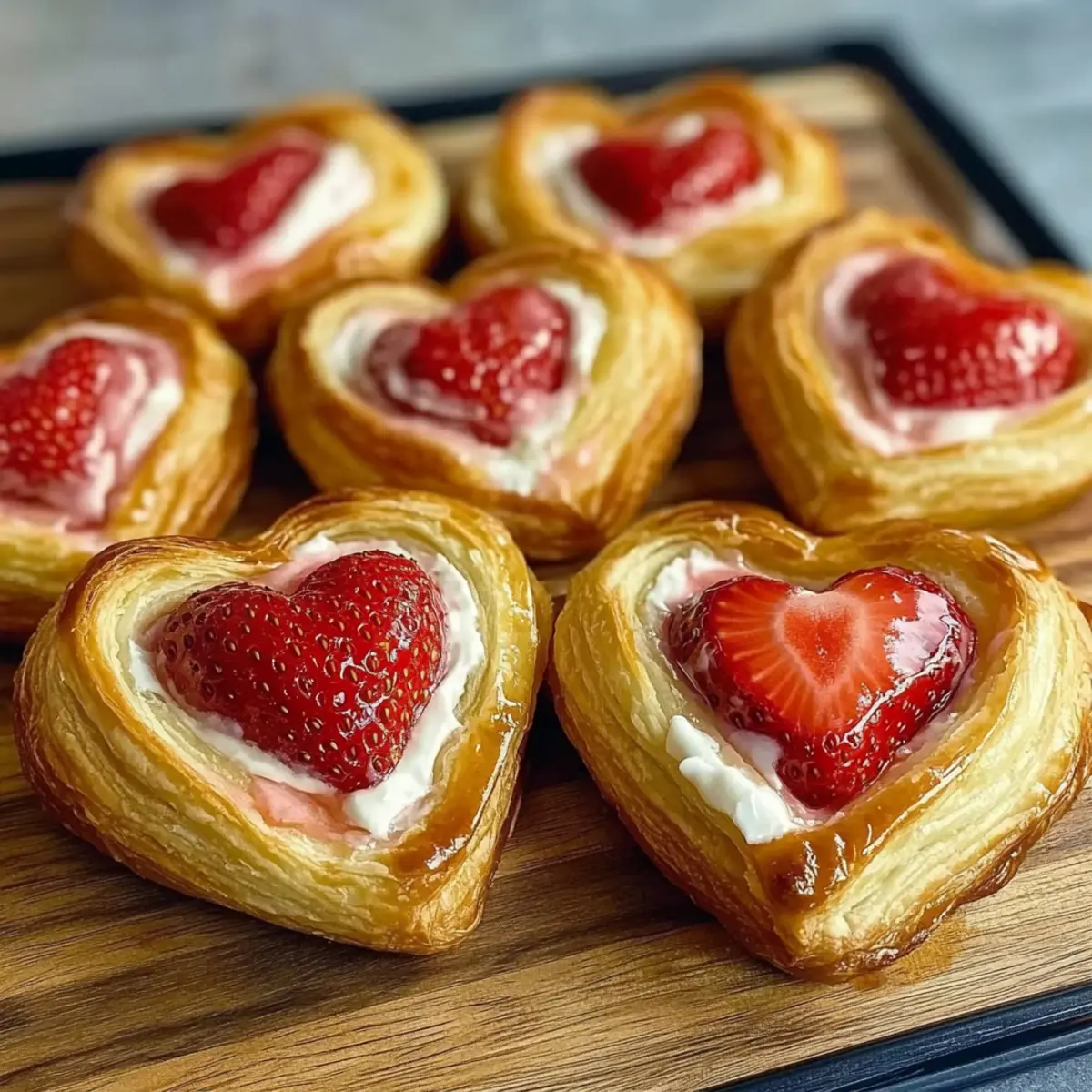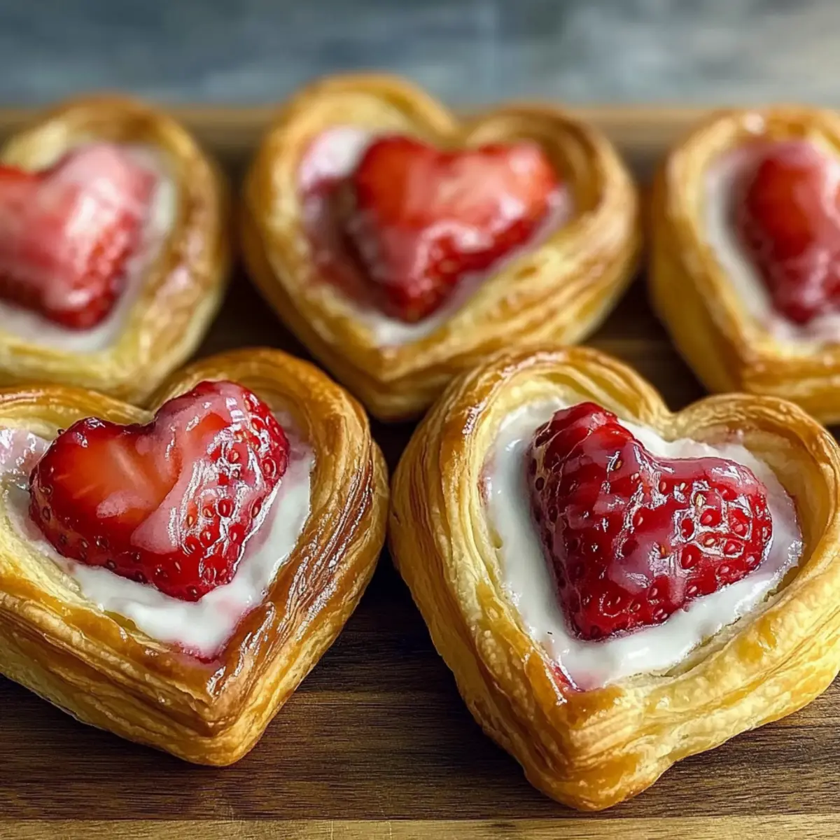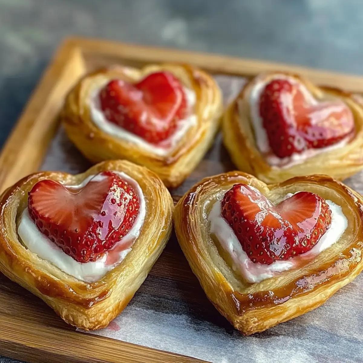 Jump to Recipe Print RecipeAs I watched the sunlight stream through my kitchen window, casting a warm glow on my countertop, I felt inspired to bake something special. Enter Strawberry Cream Cheese Heart Danishes—delicate, flaky pastries that not only elevate brunch but also make the perfect sweet surprise for Valentine’s Day. With their effortless charm and delightful combination of creamy filling and fresh strawberries, these danishes offer both a quick prep time and a sumptuous crowd-pleaser that’s bound to impress. Best of all, they can be made with simple ingredients right from your pantry. Ready to infuse your kitchen with the sweet aroma of these heart-shaped delights? Let’s get started on creating a pastry that’s sure to steal hearts! Why are Strawberry Cream Cheese Danishes special? Delightful combination of flavors: The sweet cream cheese filling paired with fresh strawberries creates an irresistible taste sensation. Simple and quick to make: With only a handful of ingredients and straightforward steps, these pastries can be whipped up in no time. Perfect for sharing: Whether it’s a brunch gathering or a romantic breakfast, these danishes are sure to impress. Versatile options: Try variations with berries or flavored extracts, making it easy to customize for every occasion. Dairy-free swap: Easily adapt the recipe with dairy-free cream cheese to cater to different dietary needs. Serve them alongside a cup of coffee or tea for an elevated experience, or check out our Moist Strawberry Shortcake for another delightful treat! Strawberry Cream Cheese Heart Danish Ingredients For the Pastry • Puff Pastry – This flaky base is essential for creating light and airy danishes; you can swap it for crescent roll dough if desired. For the Filling • Cream Cheese – A rich, tangy essence is formed through room temperature cream cheese; use dairy-free cream cheese for a vegan alternative. • White Sugar – Adds sweetness to balance the tangy cream cheese; feel free to substitute with powdered sugar for a smoother texture. • Vanilla Extract – Enhances and elevates the flavor profile of the filling. • Red Food Coloring – Optional to give your filling a vibrant hue; for a natural twist, strawberry jam can be used instead. For the Topping • Strawberries – The star of the show, fresh strawberries bring brightness and flavor; thawed, drained frozen strawberries are a suitable alternative if fresh aren’t available. • Egg – Used to create a glossy egg wash that gives the pastries their golden finish. • Cold Water – Mixed with the egg for the perfect egg wash consistency. These Strawberry Cream Cheese Heart Danishes are not only a treat for the taste buds but also give off an alluring aroma that fills your kitchen with warmth. Let’s gather these ingredients and get to baking! Step‑by‑Step Instructions for Strawberry Cream Cheese Heart Danishes Step 1: Prepare the Puff Pastry Thaw the puff pastry according to the package instructions—either 30-60 minutes at room temperature or overnight in the fridge. While it thaws, preheat your oven to 400°F (200°C) and line a baking sheet with parchment paper. This ensures a non-stick surface for your delightful Strawberry Cream Cheese Heart Danishes to bake evenly. Step 2: Make the Cream Cheese Filling In a mixing bowl, combine room-temperature cream cheese, white sugar, and vanilla extract. Use a hand mixer or whisk to beat the mixture until it’s smooth and creamy, taking care to avoid lumps. For an extra touch, you can add a few drops of red food coloring to enhance the filling’s visual appeal, making your danishes even more inviting. Step 3: Shape the Pastry Hearts On a well-floured surface, unfold the thawed puff pastry. Lightly roll it out to a thickness of about 1/4 inch, ensuring it remains cold for optimal flakiness. Using a 3-4 inch heart-shaped cutter, cut out as many hearts as you can, typically yielding around four. For a decorative touch, score a smaller heart inside each cut-out, creating a rim effect. Step 4: Fill the Hearts Position the shaped hearts on the prepared baking sheet. Spoon 1-2 tablespoons of the cream cheese filling into the center of each heart, ensuring you leave some space around the edges to prevent overfilling. Then, sprinkle diced fresh strawberries on top of the cream cheese, adding color and flavor to your Strawberry Cream Cheese Heart Danishes. Step 5: Apply the Egg Wash In a small bowl, whisk together one egg and a splash of cold water until well combined. With a pastry brush, gently apply the egg wash around the edges of each heart, creating a beautiful golden finish when baked. This may seem small, but it makes a big difference in presentation! Step 6: Bake the Danishes Place the baking sheet in the preheated oven and bake for 12-15 minutes, or until the danishes are puffed up and golden-brown. Keep an eye on them, and rotate the sheet halfway through baking for even coloration. You’ll know they’re done when they’re beautifully golden and your kitchen is filled with a sweet aroma. Step 7: Cool and Serve After baking, allow the Strawberry Cream Cheese Heart Danishes to cool for a few minutes on the pan before transferring them to a wire rack. This ensures they maintain their delightful texture. For an extra sweet touch, dust with powdered sugar or drizzle a quick glaze over the pastries once they’re slightly cooled, adding an elegant finish. Storage Tips for Strawberry Cream Cheese Heart Danishes Room Temperature: Best enjoyed fresh within 2 hours of baking to maintain optimal texture and flavor. Fridge: Store in an airtight container for up to 3 days; reheat gently in the oven at 350°F (175°C) for 5-7 minutes to revive freshness. Freezer: Unbaked danishes can be assembled and frozen for up to 2 months. Bake directly from frozen, adding an extra 5 minutes to the baking time for delicious Strawberry Cream Cheese Heart Danishes anytime! Reheating: If baked and sto