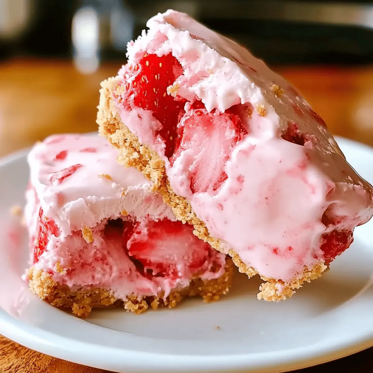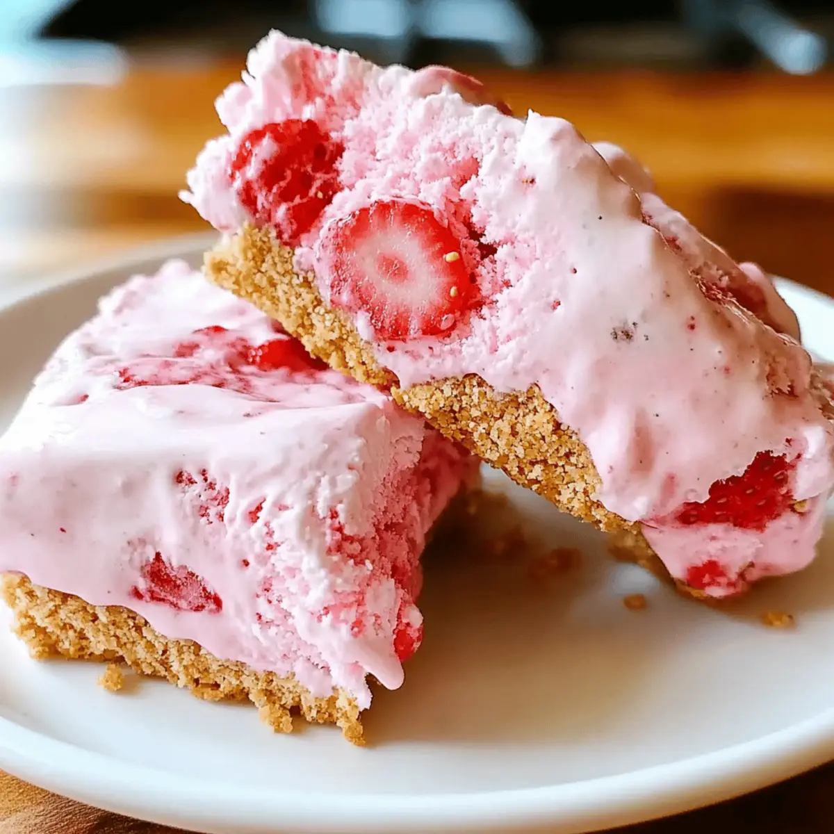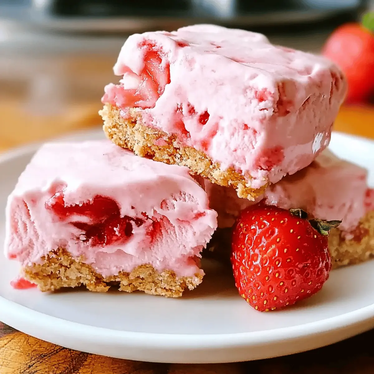 Jump to Recipe Print RecipeAs I stood in the kitchen, the sweet scent of strawberries wafted through the air, instantly transporting me to summer days filled with laughter and sunshine. This is the moment I knew—delicious Strawberry Ice Cream Bars would be the highlight of our warm-weather gatherings. Forget store-bought sweets; these homemade treats showcase real fruit and a buttery graham cracker crust that contrast beautifully in texture. Plus, they offer a quick and satisfying way to indulge without artificial flavors weighing you down. Whether you’re hosting a backyard barbecue or simply craving something refreshing, this recipe is your go-to summer indulgence. Ready to dive into a world of fruity bliss and creamy goodness? Let’s make these irresistible bars together! Why are Strawberry Ice Cream Bars a must-try? Irresistible Freshness: Enjoy the taste of ripe strawberries as they shine in every bite, unlike anything from a store shelf. Quick and Easy: With simple steps, you can create these delightful treats in no time—perfect for last-minute summer gatherings. Versatile Variations: Feel free to experiment with flavors by adding mixed berries or switching up the crust; your creativity knows no bounds! Crowd-Pleasing Treat: These bars are sure to impress! Serve them at parties or family gatherings, and watch them disappear quickly. Guilt-Free Indulgence: Made with real ingredients and no artificial flavors, you can indulge without the guilt. Plus, they can be made ahead of time, so you always have a tasty dessert ready to go! For an extra sweet treat, why not try these Cookie Ice Cream Sandwiches? Strawberry Ice Cream Bars Ingredients • For the Strawberry Compote Fresh Strawberries – Use ripe, in-season berries for the best flavor and sweetness. Sugar – Adjust this ingredient based on the sweetness of your strawberries; it balances the tartness beautifully. Water – Helps to break down strawberries during cooking, creating a luscious compote texture. • For the Crust Graham Crackers – Opt for fresh and crispy crackers for a delightful crunch; honey graham adds an extra touch of sweetness. Butter – Use real butter to bind the crust ingredients together, enhancing the overall flavor. • For the Ice Cream Layer Vanilla Ice Cream – Choose high-quality, real vanilla ice cream as it provides a rich and creamy base that complements the strawberry flavor. These Strawberry Ice Cream Bars are a delightful homemade dessert that will elevate your summer treats like never before! Step‑by‑Step Instructions for Strawberry Ice Cream Bars Step 1: Cook Strawberry Compote In a medium saucepan, combine freshly chopped strawberries, sugar, and water. Cook over medium heat for about 10 minutes until the mixture thickens slightly, stirring occasionally. Once it reaches a jam-like consistency and the strawberries break down, remove it from the heat and let it cool completely. This luscious compote will enhance the flavor of your Strawberry Ice Cream Bars. Step 2: Prepare Crust While the strawberry compote cools, prepare the crust by crushing graham crackers into fine crumbs in a mixing bowl. Add melted butter and mix until the mixture resembles wet sand. Line the bottom of an 8×8-inch baking dish with parchment paper, then press the graham cracker mixture firmly into the dish, creating an even layer. Bake at 350°F (175°C) for 8–10 minutes until lightly golden and set, then allow it to cool. Step 3: Layer Ice Cream Once the crust has cooled, take your softened vanilla ice cream and spoon it over the graham cracker crust. Using an offset spatula, gently spread the ice cream evenly to cover the entire crust. Make sure to work quickly so the ice cream stays smooth and doesn’t melt too much. This creamy layer forms the delightful base of your Strawberry Ice Cream Bars. Step 4: Add Compote & Swirl Drizzle the cooled strawberry compote generously over the ice cream layer, ensuring it covers the surface. With a butter knife or skewer, gently swirl the compote into the ice cream without overmixing—this will give your Strawberry Ice Cream Bars that beautiful marbled effect. Aim for a mix of ice cream and fruit swirls for a vibrant presentation. Step 5: Freeze Cover the dish tightly with plastic wrap or aluminum foil and place it in the freezer. Freeze for at least 4 hours, or until the bars are fully set and firm. This step is crucial to create that perfect frozen texture that makes your Strawberry Ice Cream Bars so refreshing on a warm day. Step 6: Cut Bars After the freezing time is up, remove the dish from the freezer. To cut the bars neatly, dip a sharp knife in warm water to warm the blade, which helps avoid ice cream sticking. Carefully cut into squares or bars of your desired size, wiping the knife clean between cuts for neat edges. Serve immediately or store any leftovers in the freezer. What to Serve with Strawberry Ice Cream Bars? Indulge in a mouthwatering spread that perfectly complements the delightful freshness of these homemade treats. Fresh Berries: A vibrant medley of strawberries, blueberries, and raspberries enhances the freshness and adds a lovely burst of color to your dessert table. Whipped Cream: Light and fluffy, a dollop of whipped cream invites you to take that first heavenly bite, bringing an additional layer of creaminess. Chocolate Drizzle: Adding a rich chocolate drizzle creates a delightful contrast to the strawberry bars and satisfies any chocolate lover’s craving. Mint Leaves: Fresh mint leaves provide a cooling effect and a pop of color, enhancing both the aroma and aesthetic of your dessert presentation. Lemonade: A tangy glass of homemade lemonade balances the sweetness of the bars, offering a refreshing contrast that’s perfect for summer gatherings. Teas: Offer a selection of herbal or iced teas as a soothing beverage option; their warm flavors will harmonize beautifully with the fruity sweetness of the bars. Your summer gatherings will shi