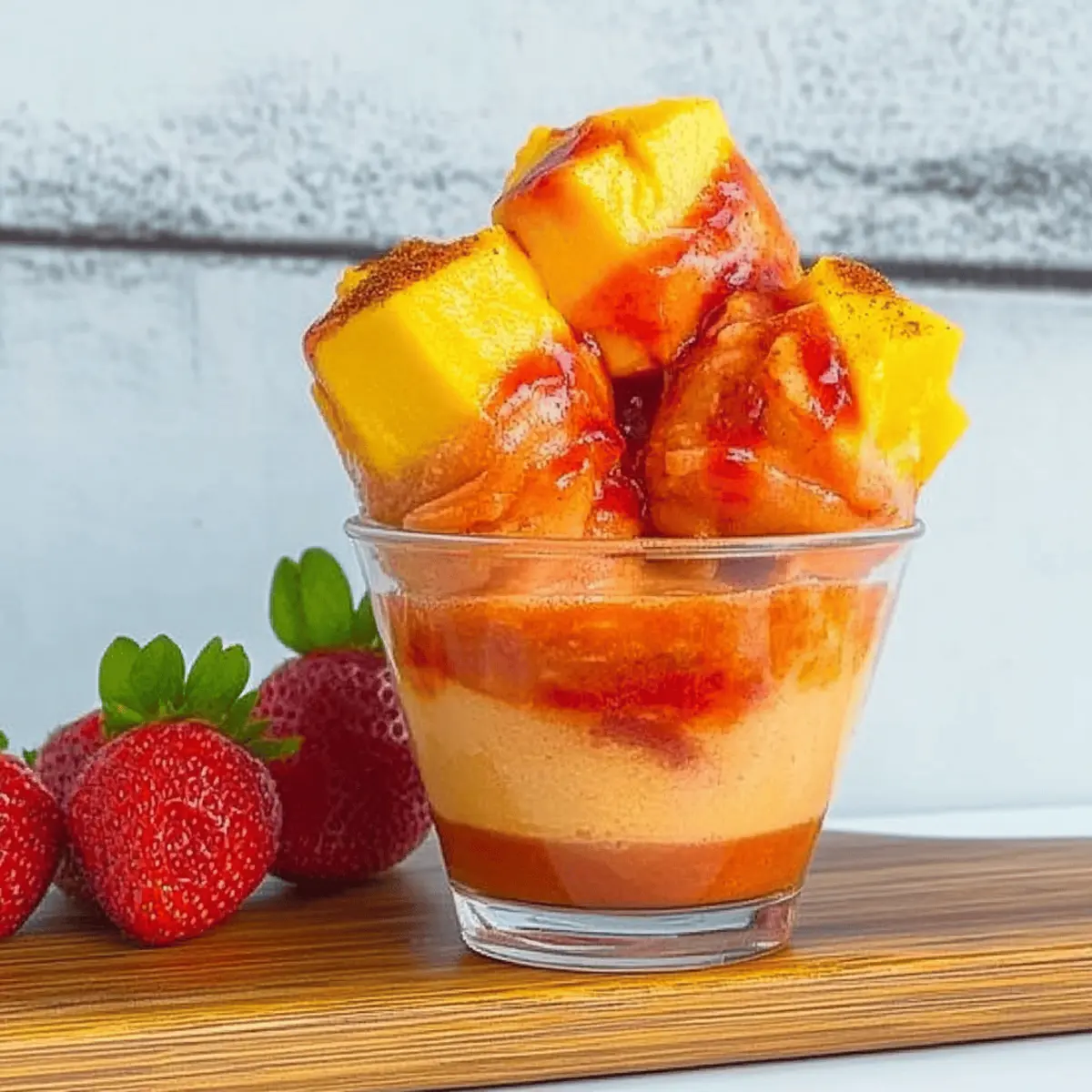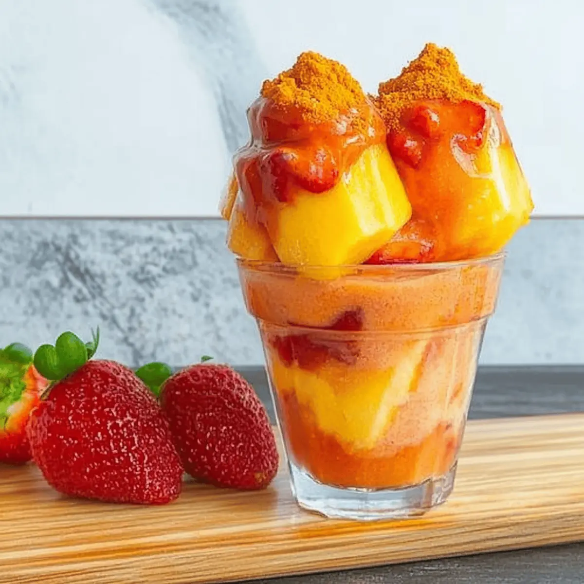 Drizzle chamoy sauce generously over the top of each glass, allowing it to create a lovely artistic pattern. The tangy and spicy notes of chamoy enhance the sweetness of the fruit below. For an authentic touch, sprinkle a dash of Tajin seasoning atop the chamoy for a delightful kick.