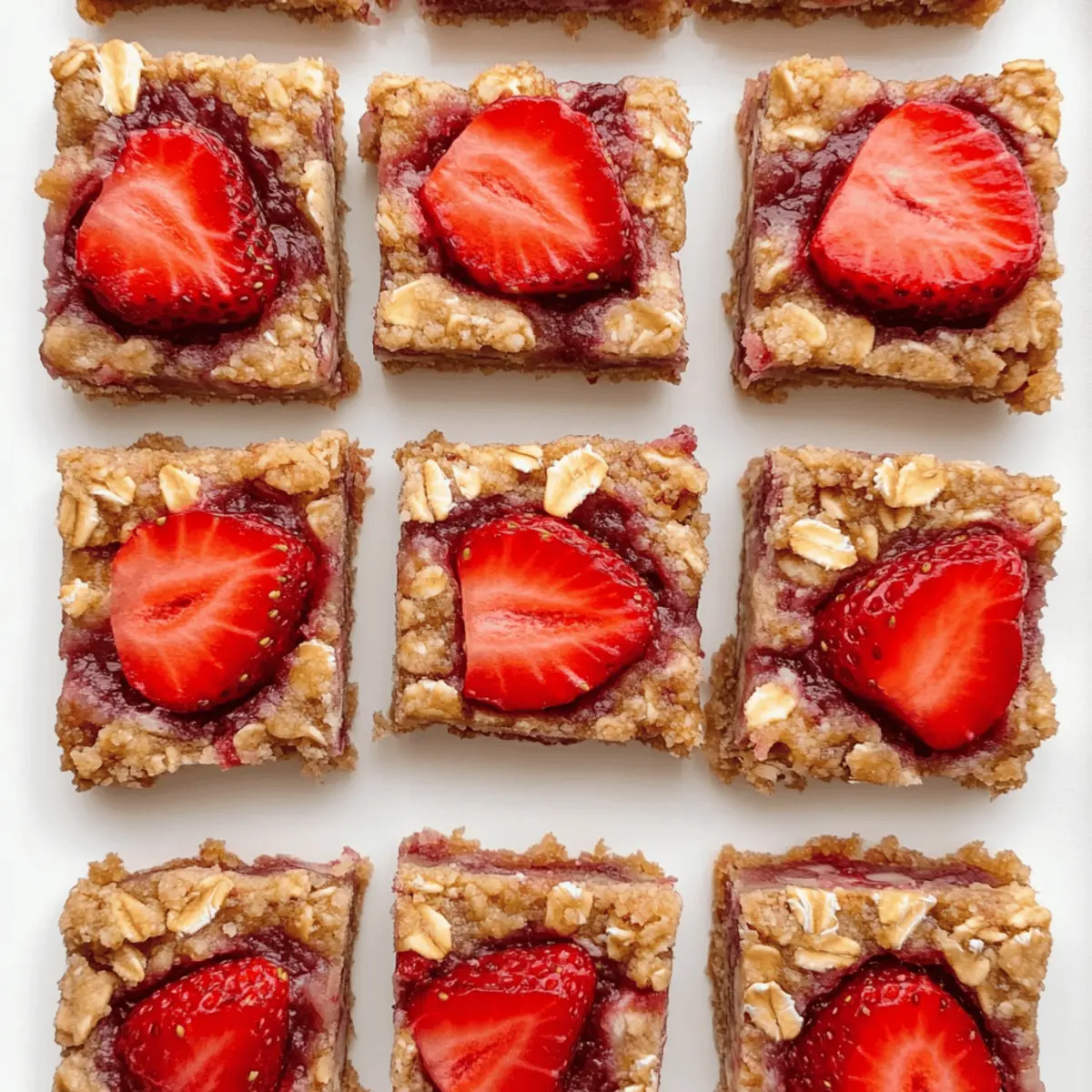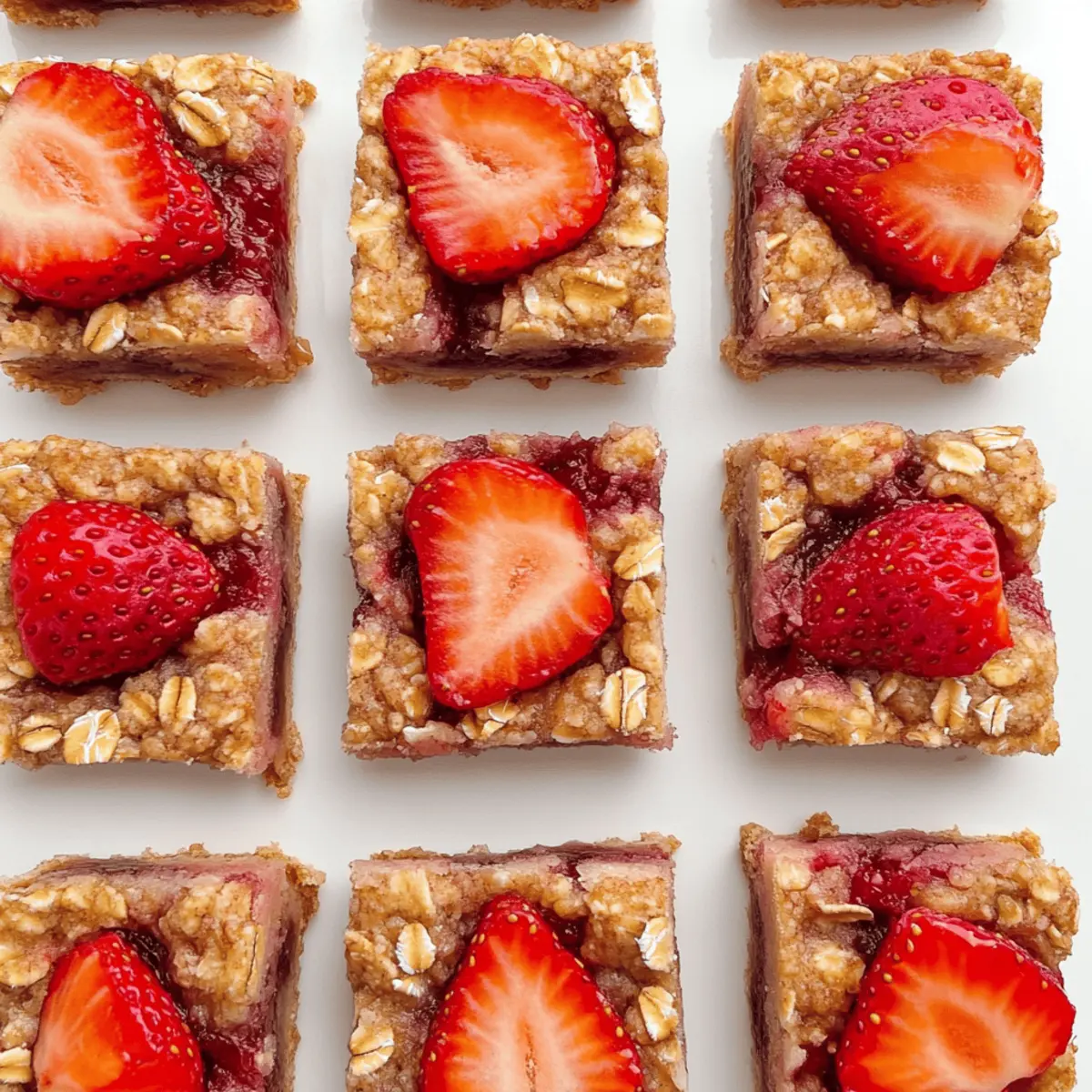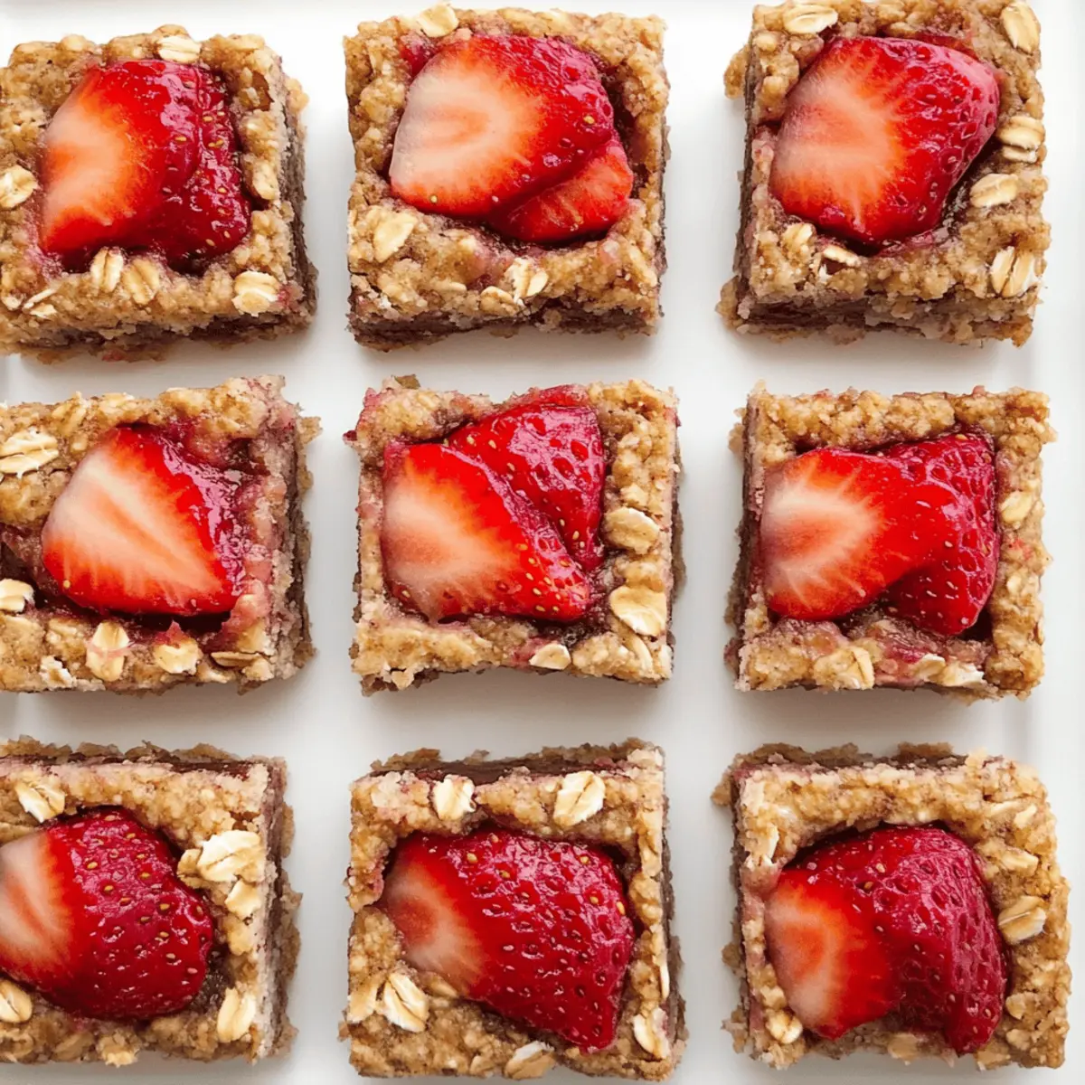 Jump to Recipe Print RecipeAs the sun rises and the aroma of fresh-cut strawberries fills the kitchen, I’m reminded of the joy of creating something wholesome. This is where my Healthy Strawberry Oatmeal Bars come in—a delightful, chewy snack that’s not only quick to whip up but also offers a guilt-free indulgence for those of us looking to ditch fast food in favor of homemade goodness. With their soft topping and buttery oat crumble, these bars easily fit into gluten-free and low-calorie diets, making them a versatile choice for breakfast or a midday treat. Plus, they’re a clever way to sneak some nutrition into your day without sacrificing taste. Curious to discover how to bring these delightful bars to life? Let’s dive into the recipe! Why Are Strawberry Oatmeal Bars Amazing? Healthy, Guilt-Free Treat: These Strawberry Oatmeal Bars are a nourishing choice, packed with the sweet taste of strawberries without the sugar rush of store-bought snacks. Quick to Make: Whipping up these bars is a breeze—they’re ready in under an hour! Vegan Variations: Easily customize the recipe with dairy-free substitutions using coconut oil for richness and enjoy a vegan-friendly snack. Perfect for Meal Prep: These bars are ideal for busy days; prep them ahead of time for a grab-and-go breakfast or afternoon pick-me-up. Nutrient-Rich: With each bar clocking in at around 100 calories and high in fiber, they keep you satisfied while still offering that homemade goodness you crave. For more delicious options, check out my Moist Strawberry Shortcake or Strawberry Cake Refreshingly recipes! Strawberry Oatmeal Bars Ingredients • Whip up these delightful Strawberry Oatmeal Bars with these simple, nourishing ingredients. For the Oat Base Quick Oats/Rolled Oats – Provides a chewy texture and sturdy base; avoid instant oats for best results. Flour (Spelt, White, or Oat) – Adds structure; almond flour can be a tasty substitute for a crumblier bar, just be cautious with coconut flour as it tends to dry out. Ground Cinnamon – Infuses warmth and flavor into the bars; no need for substitutions here. Baking Powder – Essential for giving the bars a little lift and guaranteeing the right texture. Salt – Enhances flavor; optional but recommended for balance. For Sweetness Sugar or Xylitol – Adds sweetness while keeping the bars lower in sugar compared to traditional snacks; brown sugar will make the bars softer whereas xylitol is a great sugar-free alternative. Pure Maple Syrup or Sweetener – A delicious addition to the filling that can be substituted with any liquid sweetener on hand. For Moisture Oil or Butter – Contributes necessary moisture and richness; using coconut oil or any neutral oil is also a fantastic option for a dairy-free treat. For the Filling Diced Strawberries – The star of the show! Fresh or thawed frozen berries bring sweetness and moisture; steer clear of freeze-dried varieties for this recipe. Cornstarch or Arrowroot – Thickens the strawberry filling, creating a beautiful texture; no immediate substitutes available here. Feel inspired to create your own batch of Strawberry Oatmeal Bars that promise deliciousness in every bite! Step‑by‑Step Instructions for Strawberry Oatmeal Bars Step 1: Preheat and Prepare Preheat your oven to 350°F (175°C) and grab an 8-inch baking pan. Grease the pan lightly or line it with parchment paper to prevent sticking. This ensures the Strawberry Oatmeal Bars can easily be lifted out after baking, giving you a perfect presentation for cutting. Step 2: Mix Dry Ingredients In a large mixing bowl, combine the quick oats, your choice of flour, ground cinnamon, salt, baking powder, and sugar. Stir the mixture well until everything is evenly distributed and the dry ingredients are thoroughly mixed. This step sets the flavorful base for your bars while making them nutritious and delicious. Step 3: Incorporate Wet Ingredients Pour in the oil or melted butter, and mix until just combined, creating a crumbly yet cohesive dough. You’ll be left with two-thirds of this mixture to form the base of your Strawberry Oatmeal Bars. The dough should look rich and slightly sticky, ready to press into the pan. Step 4: Press Oat Mixture into Pan Using your hands or a spatula, firmly press the two-thirds of the oat mixture evenly into the bottom of the prepared baking pan. Ensure a nice, compact layer forms, as this will serve as the sturdy foundation for your fruit filling. Aim for an even thickness for consistent baking. Step 5: Prepare Strawberry Filling In a separate bowl, mix the diced strawberries with cornstarch and maple syrup. Toss until the strawberries are well-coated, allowing the cornstarch to thicken the mixture during baking. The vibrant color and sweet aroma of fresh strawberries will brighten your filling, making these bars irresistible. Step 6: Assemble the Bars Evenly spread the strawberry filling over the pressed oat base in the pan. Next, take the reserved oat mixture and sprinkle it over the strawberry layer, pressing down firmly to ensure it adheres. This deliciously chewy layer is key to achieving the perfect balance of flavor and texture in your Strawberry Oatmeal Bars. Step 7: Bake to Perfection Place the pan in the preheated oven and bake for 45 minutes, or until the topping turns a lovely golden brown. Keep an eye on the bars near the end of baking; they should be fragrant and slightly firm to the touch, indicating they are ready to come out of the oven. Step 8: Cool and Chill Once baked, remove the bars from the oven and let them cool in the pan for at least 15 minutes. Then, transfer them to the refrigerator to chill for about 1 hour. This cooldown period helps the Strawberry Oatmeal Bars firm up and makes them easier to cut into perfect squares or rectangles. Storage Tips for Strawberry Oatmeal Bars Room Temperature: Keep Strawberry Oatmeal Bars in an airtight container at room temperature for up to 3 days. Enjoy them fresh a