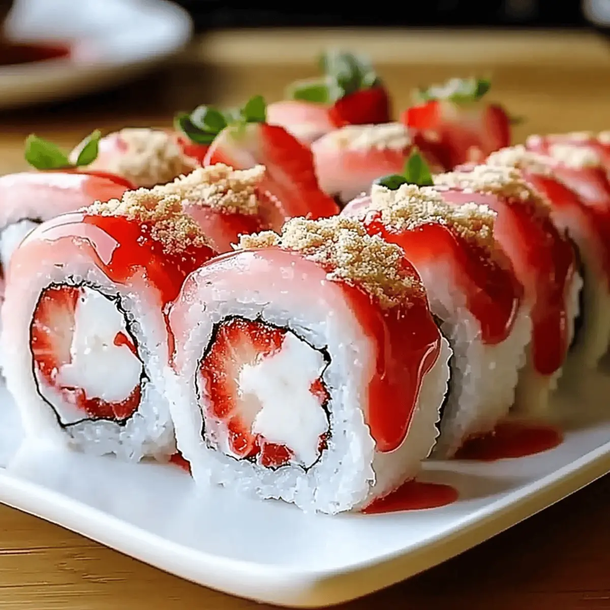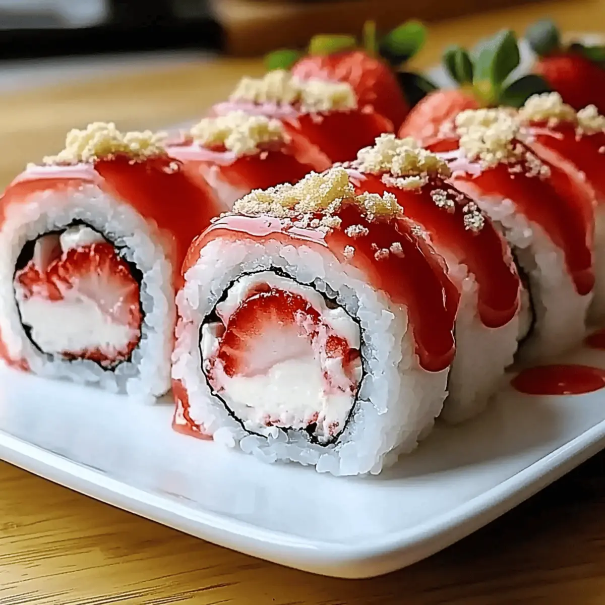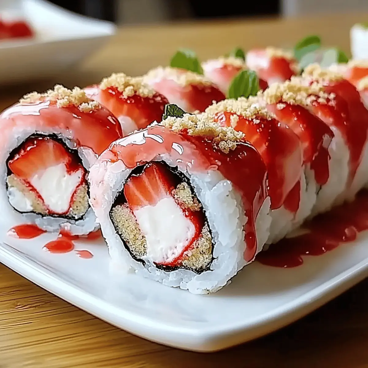 Jump to Recipe Print RecipeAs I arranged the vibrant slices of my freshly made Strawberry Shortcake Sushi Roll, the light scent of whipped cream and sweet strawberries wafted through the air, instantly brightening my kitchen. This creative dessert reinterprets the beloved flavors of strawberry shortcake and transforms them into an exciting no-bake sushi roll that’s not only visually stunning but also incredibly easy to make. Perfect for gatherings or a sweet indulgence on a cozy evening, this Strawberry Shortcake Sushi Roll Dessert is sure to be a crowd-pleaser. With a few simple ingredients and minimal prep time, I guarantee you’ll impress your friends and family with this fun twist on a classic favorite. Ready to roll into the world of whimsical desserts? Let’s dive in! Why is this dessert a must-try? Whimsical and fun: The Strawberry Shortcake Sushi Roll reinvents a classic favorite, making dessert exciting and visually captivating. No-bake convenience: Whip this up in no time with minimal effort—perfect for those busy days when you crave something sweet without the fuss. Crowd-pleaser: Impress your guests with these charming pinwheels that are both light and delicious; they’ll think you spent hours in the kitchen! Versatile: Feel free to substitute strawberries with other fresh fruits like blueberries or raspberries for a delightful twist, catering to various tastes. Creative presentation: Serve on a sushi board or tiered platter, making it a beautiful centerpiece for any gathering, just like your favorite Moist Strawberry Shortcake or Strawberry Cake Refreshingly. Strawberry Shortcake Sushi Roll Dessert Ingredients For the Sponge Cake Sponge Cake – This provides the base for your strawberry shortcake sushi roll; you can choose between store-bought or homemade, just ensure it’s fully cooled. For the Cheesecake Filling Cream Cheese – Essential for creaminess; mascarpone cheese makes a terrific substitute for a unique twist. Powdered Sugar – Sweetens your filling; this ingredient is crucial and doesn’t have a substitute. Vanilla Extract – Enhances flavor; consider using vanilla bean paste for a richer essence. Whipped Cream – This lightens your filling; flavored whipped cream can add a fun surprise! For the Strawberry Layer Strawberry Preserves – Adds sweetness and a lovely fruity layer; you can swap it for raspberry preserves for a different flavor profile. Diced Fresh Strawberries – These lend freshness and texture; frozen strawberries are an option if properly thawed and drained. Optional Topping Melted White Chocolate – Drizzle this over your rolls for added sweetness; feel free to use dark or milk chocolate if you prefer. Embrace the art of dessert-making with this delightful Strawberry Shortcake Sushi Roll Dessert — it’s sure to enchant your taste buds and your kitchen! Step‑by‑Step Instructions for Strawberry Shortcake Sushi Roll Dessert Step 1: Prepare the Sponge Cake Begin by baking the sponge cake in a jelly roll pan, following package instructions if using store-bought, or your favorite recipe. Allow it to cool completely at room temperature until firm, as this will help maintain the shape of your Strawberry Shortcake Sushi Roll when you roll it. Step 2: Make the Cheesecake Filling In a mixing bowl, beat together the softened cream cheese, powdered sugar, and vanilla extract until the mixture is smooth and creamy, about 3-4 minutes. Gently fold in the whipped cream until combined, creating a light and airy filling that perfectly complements the sponge cake. Step 3: Assemble the Sushi Roll Spread a generous layer of strawberry preserves evenly over the cooled sponge cake, ensuring every corner is covered. Next, spoon the cream cheese filling over the preserves, spreading it smoothly to create an even layer, preparing to wrap your Strawberry Shortcake Sushi Roll layers together. Step 4: Add Fresh Strawberries Sprinkle diced fresh strawberries over the cream cheese filling, allowing their sweetness and texture to shine through. This step injects brightness into your dessert, enhancing its visual appeal and flavor profile as you prepare for the rolling process. Step 5: Roll the Cake With the help of parchment paper, carefully lift one short end of the sponge cake and start rolling it tightly toward the opposite end, creating a log shape. Ensure the roll is snug but not too tight to avoid tearing the sponge, resulting in a beautiful Strawberry Shortcake Sushi Roll. Step 6: Chill the Roll Wrap the rolled cake in plastic wrap and place it in the refrigerator to chill for 20-30 minutes. This helps the filling set and makes slicing easier, ensuring you achieve tidy pinwheels packed with flavor when you cut your Sushi Roll dessert. Step 7: Slice into Pinwheels Using a sharp knife, slice the chilled roll into 1-inch thick pinwheels. Wipe the knife with a damp cloth between cuts to maintain clean edges, revealing the delightful layers of your Strawberry Shortcake Sushi Roll for an inviting presentation. Step 8: Serve and Garnish Arrange the sliced pinwheels on a platter, showcasing their vibrant colors. For an extra touch of elegance, drizzle melted white chocolate over the rolls and garnish with fresh mint or a dollop of whipped cream, creating an enticing look for your guests. Expert Tips for Strawberry Shortcake Sushi Roll Cool Completely: Ensure your sponge cake is fully cooled before filling; a warm cake can melt the cream cheese mixture, making rolling difficult. Avoid Overfilling: Be cautious not to overload the cake with cream cheese filling or preserves; this can lead to messy rolling and squished pinwheels. Chill for Clean Cuts: Always chill the rolled cake for optimal firmness, making it easier to slice and achieving beautiful, clean edges for your Strawberry Shortcake Sushi Roll dessert. Use a Sharp Knife: A sharp knife is your best friend—this prevents squashing your lovely layers during slicing, ensuring they maintain their appetizin