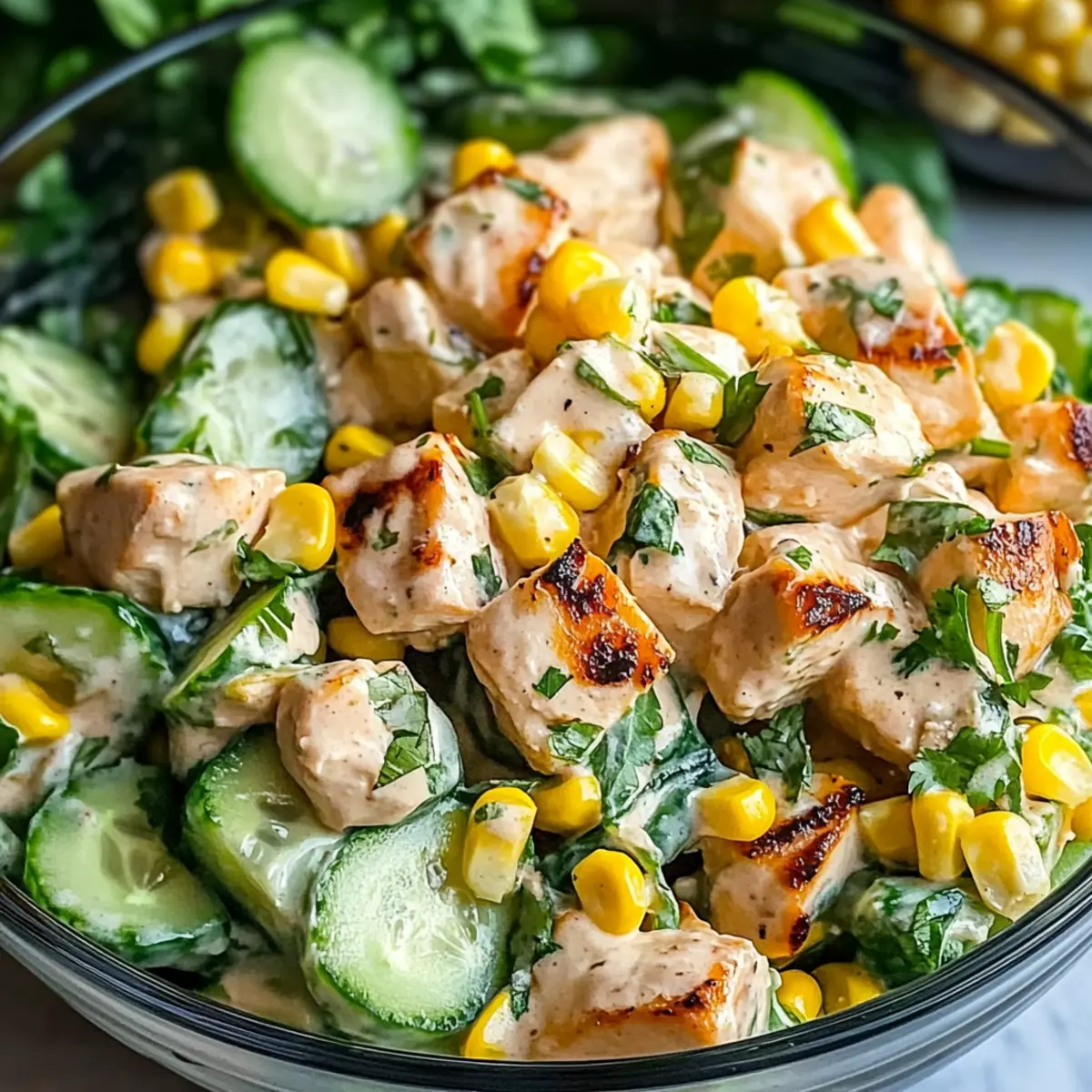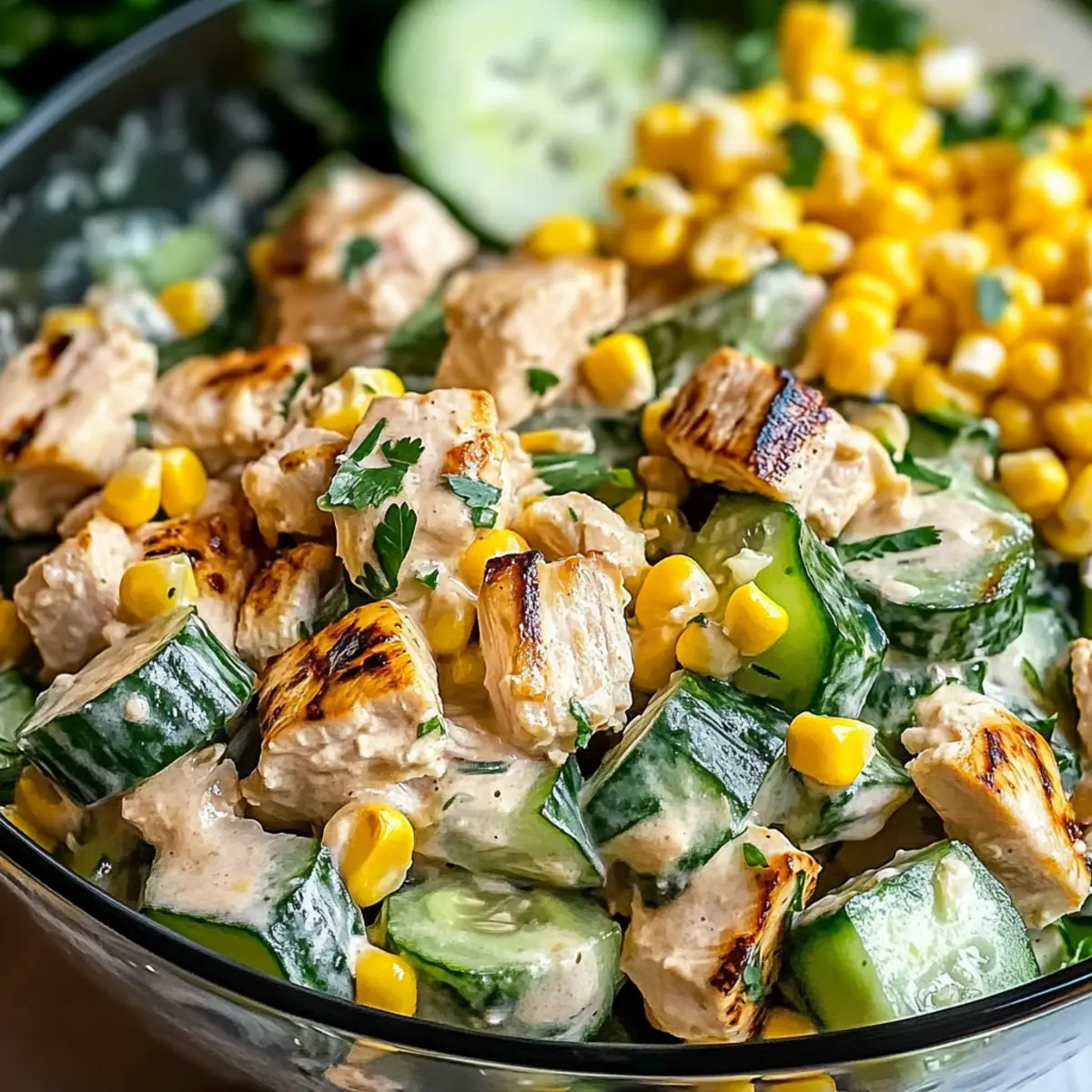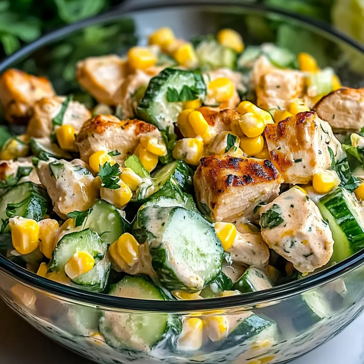 Jump to Recipe Print RecipeAs the sun shines brighter and summer vibes fill the air, I find myself craving something fresh and vibrant—like this Street Corn Creamy Cucumber Chicken Salad! Picture perfectly grilled chicken mingling with sweet, juicy corn and the crisp crunch of cucumber, all enveloped in a creamy dressing that screams outdoor gatherings. This dish isn’t just easy to whip up; it also scores big points for being gluten-free and full of seasonal goodness. Whether you’re hosting a backyard barbecue or simply enjoying a sunny afternoon on the patio, this quickly prepared salad will not only satisfy your taste buds but also impress your guests with its delightful medley of textures and flavors. Are you ready to elevate your summer salads this season? Why is this salad a must-try? Light and Refreshing: This irresistible salad is perfect for warm summer days, bursting with flavors that awaken the taste buds. Quick to Prepare: With minimal prep time, you can whip it up in no time—ideal for those busy summer afternoons. Versatile Base: The recipe can easily adapt to your preferences; swap in shrimp, tofu, or black beans for a twist! Crowd-Pleasing Dish: Whether served at barbecues or picnics, it’s guaranteed to impress guests alongside other favorites like Mexican Street Corn. Health-Conscious Choice: Naturally gluten-free and protein-packed, it’s as nourishing as it is delectable. Crispy Texture: The fresh cucumbers maintain their crunch, complementing the creamy dressing beautifully for a delightful experience in every bite. Street Corn Creamy Cucumber Chicken Salad Ingredients For the Salad Grilled or Roasted Chicken (2 cups) – Adds protein and heartiness; use rotisserie chicken for convenience. Sweet Corn (1 cup) – Provides sweetness and a burst of flavor; canned corn works too, just ensure it’s drained well. Cucumber (1 large) – Offers a refreshing crunch; diced, or use zucchini for a fun twist. Red Onion (½ cup) – Adds sharpness and color; shallots make a milder choice if desired. For the Dressing Mayonnaise (½ cup) – Provides creaminess; consider Greek yogurt for a lighter option. Greek Yogurt (2 tablespoons) – Enhances creaminess with a tangy twist; adjust to your taste. Lime Juice (1 tablespoon) – Balances flavors with acidity; fresh lime juice is highly recommended. Cilantro (1 tablespoon) – Adds a fresh, herbal note; feel free to omit if you’re not a fan. Smoked Paprika (1 teaspoon) – Introduces a smoky depth of flavor; use regular paprika as an alternative. Salt (1 teaspoon, to taste) & Black Pepper (½ teaspoon) – Enhances overall flavor; adjust according to your preference. Optional Crumbled Feta Cheese – For additional creaminess and a salty finish; can be left out for a dairy-free version. This Street Corn Creamy Cucumber Chicken Salad is not only a vibrant summer dish but a delightful fusion of textures and flavors that you’ll want to enjoy all season long! Step‑by‑Step Instructions for Street Corn Creamy Cucumber Chicken Salad Step 1: Cook the Chicken Begin by grilling or roasting your chicken until it reaches an internal temperature of 165°F, about 15-20 minutes, depending on thickness. For added flavor, season the chicken lightly with salt and pepper. Once cooked, allow it to rest for a few minutes before dicing into bite-sized pieces, ensuring a juicy addition to your Street Corn Creamy Cucumber Chicken Salad. Step 2: Prepare the Corn If using fresh corn, grill the ears over medium heat for 10-12 minutes, turning occasionally until lightly charred and tender. Once ready, let it cool before slicing the kernels off the cob. If using canned corn, simply drain it well and pat it dry with a paper towel. This sweet corn will add a delightful pop of flavor and sweetness to your salad. Step 3: Chop the Fresh Vegetables While the corn cools, dice your large cucumber into small cubes for that refreshing crunch. Next, finely chop the red onion to contribute a sharpness that balances the other ingredients. Ensure even pieces for consistency in your Street Corn Creamy Cucumber Chicken Salad, enhancing both flavor and texture with every bite. Step 4: Make the Dressing In a large mixing bowl, combine the mayonnaise and Greek yogurt, stirring until smooth and creamy. Add freshly squeezed lime juice, cilantro, smoked paprika, salt, and black pepper. Mix thoroughly to create a balanced dressing that harmonizes the components of your salad, bringing zest and richness to light summer fare. Step 5: Combine the Ingredients Add the diced chicken, prepared corn, cucumber, and red onion to the mixing bowl. Gently fold in the creamy dressing, making sure all ingredients are well-coated without overmixing, as this keeps the vegetables crisp and fresh in your Street Corn Creamy Cucumber Chicken Salad. Step 6: Adjust Seasoning and Optional Ingredients Taste your salad and adjust the seasoning with additional salt and pepper as needed. If desired, fold in crumbled feta cheese for extra creaminess and flavor. This step is crucial to perfecting your dish, ensuring that every bite is as delicious as possible while remaining light and refreshing. Step 7: Serve or Chill Serve your Street Corn Creamy Cucumber Chicken Salad immediately for a fresh taste, or chill it in the refrigerator for 30 minutes to enhance flavor melding. This salad can be enjoyed cold or at room temperature, making it a versatile and perfect dish for summer picnics or parties. How to Store and Freeze Street Corn Creamy Cucumber Chicken Salad Fridge: Store leftover salad in an airtight container in the refrigerator for up to 3 days. This keeps the flavors fresh, though the cucumbers may lose some crunch. Freezer: It’s best not to freeze this salad due to the creamy dressing and fresh vegetables, which do not retain their texture after thawing. Reheating: If you prefer to serve the salad warm, gently heat the cooked chicken before adding it to the salad. Avoid reheating the enti