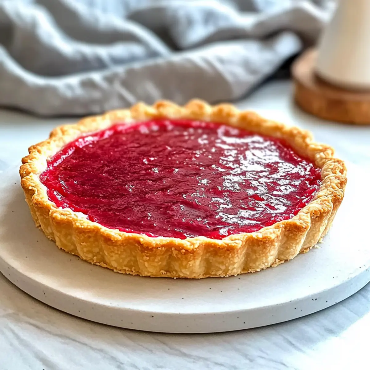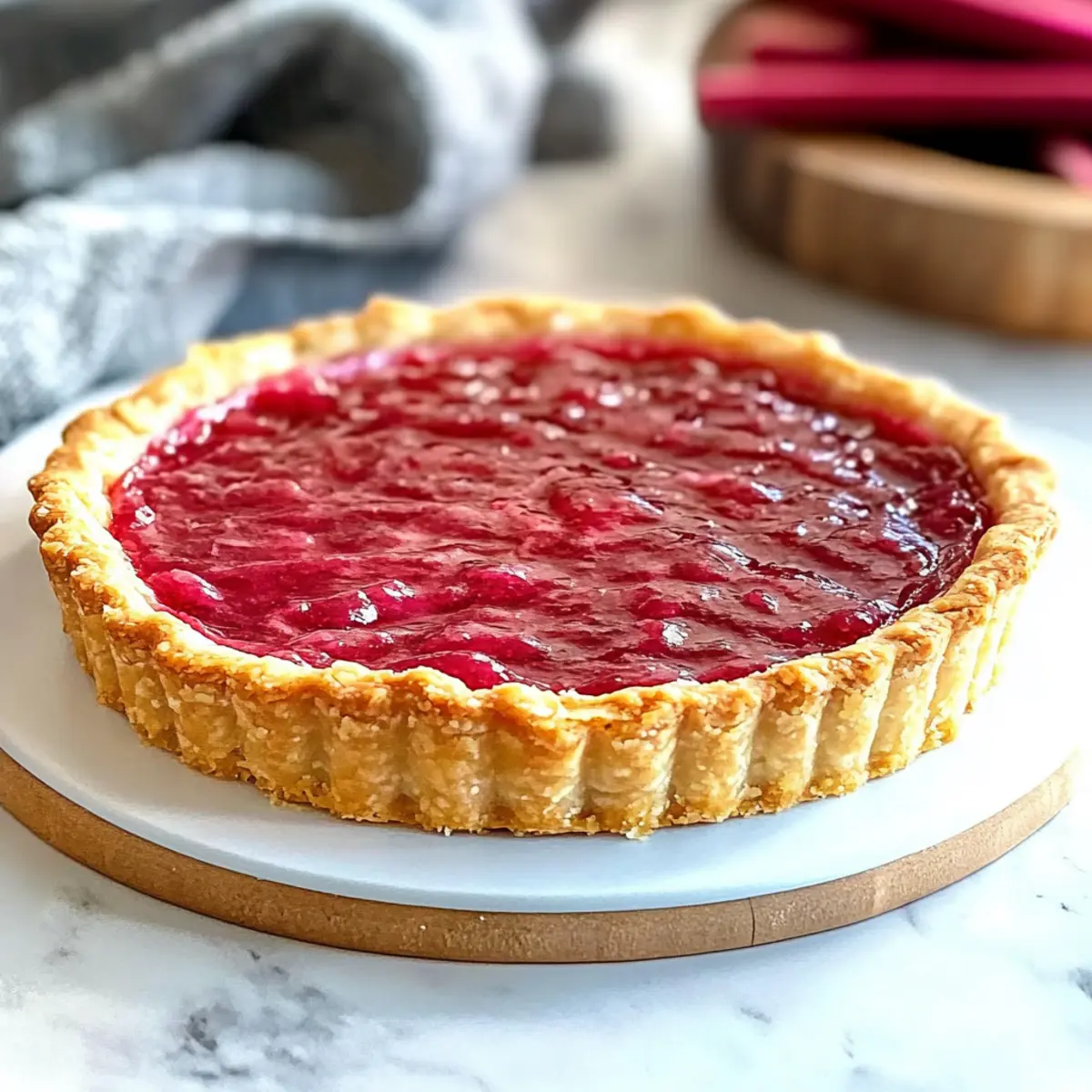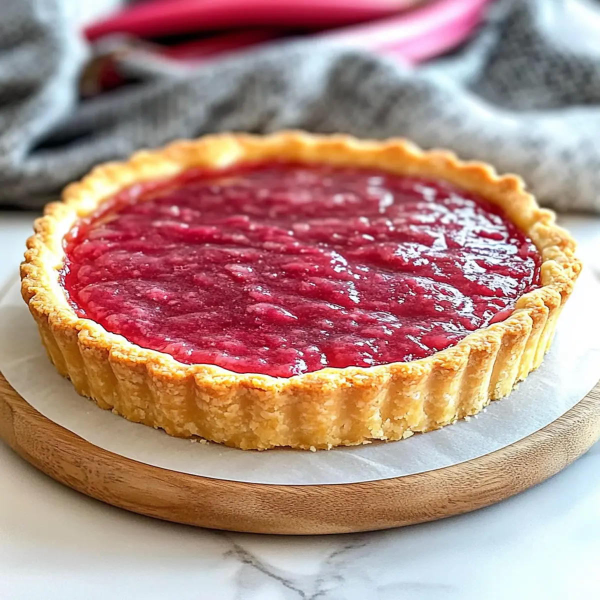 Jump to Recipe Print RecipeSpring is here, and with it comes the vibrant gift of fresh rhubarb! As I sliced into the bright pink stalks, I felt a spark of excitement for this Sweet Rhubarb Custard Tart. Perfectly blending the tartness of rhubarb and the creaminess of custard, this delightful dessert is a true celebration of the season. With a buttery, crisp pastry shell and a luscious filling, it makes for an impressive centerpiece at your next gathering or a comforting treat during a quiet afternoon. Not only is it a visual delight, but it’s also quick to prepare, ensuring you won’t spend hours in the kitchen. So, are you ready to elevate your dessert game and get your slice of spring? Why is This Tart a Must-Try? Bursting with Freshness: The use of seasonal rhubarb transforms an ordinary dessert into a springtime celebration, boasting vibrant flavors that dance on your palate. Elegant Appearance: Each slice showcases a beautiful visual contrast, with ruby-red rhubarb compote atop a silky custard, making it a stunning centerpiece for any gathering. Quick and Easy: Despite its impressive look, this tart is surprisingly simple to prepare, allowing you to enjoy homemade goodness without the stress. Versatile Delight: Serve it warm with a scoop of ice cream or chilled alongside your favorite tea, like Earl Grey, turning any occasion into something special. Crowd-Pleaser: Whether at a family gathering or an afternoon tea, this creamy tangy tart is sure to satisfy guests and leave them asking for seconds! Sweet Rhubarb Custard Tart Ingredients For the Tart Crust • Fresh Rhubarb – Adds tartness and visual appeal; opt for bright pink to red stalks for best results. • Butter – Provides richness and tender texture in the pastry dough; ensure it’s very soft for easy blending. • Confectioner’s Sugar – Sweetens the pastry and helps create a tender crust; granulated sugar can also be used as a substitute. • Eggs – Bind the ingredients in both the pastry and custard; be sure to use fresh, large eggs for optimal results. • Almond Meal – Gives a hint of nuttiness and texture to the pastry; can be swapped with ground hazelnuts or oat flour. • Plain Flour – Defines the dough’s structure; for a gluten-free version, consider using a gluten-free flour mix. For the Custard Filling • Milk – Acts as the creamy base for the custard; whole milk is preferred, but almond milk is a great non-dairy alternative. • Vanilla Extract – Enhances the flavor profile of both the custard and the pastry, making it more decadent. • Sugar – Sweetens the custard; substitute with coconut sugar for a unique flavor twist. • Cornstarch – Thickens the custard, ensuring a smooth texture, which is essential for this Sweet Rhubarb Custard Tart. For the Rhubarb Compote • Lemon Juice and Peels – Provide acidity and brightness to balance the rhubarb’s tartness, elevating the overall flavor. • Cinnamon and Star Anise – These spices enhance the flavor of the poached rhubarb; though optional, they add wonderful depth and warmth. With these carefully selected ingredients, you’re well on your way to crafting a delightful Sweet Rhubarb Custard Tart that embodies the essence of spring! Enjoy the process and the delicious result. Step‑by‑Step Instructions for Sweet Rhubarb Custard Tart Step 1: Prepare the Pastry Start by creaming together 125g of soft butter and 50g of confectioner’s sugar in a mixing bowl until light and fluffy, which should take about 3 minutes. Add one egg and beat until well incorporated. Gradually mix in 150g of almond meal and 200g of plain flour until a cohesive dough forms. Shape it into a disk, wrap in plastic wrap, and refrigerate for at least 1 hour. Step 2: Preheat the Oven While the dough chills, preheat your oven to 160°C (325°F). This ensures your Sweet Rhubarb Custard Tart crust bakes evenly and achieves that perfect golden color. Gathering your baking equipment now, such as a tart pan and parchment paper, will help streamline the process once the pastry is ready. Step 3: Blind Bake the Crust Remove the chilled pastry from the refrigerator and roll it out on a lightly floured surface to fit your tart pan. Carefully transfer the pastry into the pan, pressing it into the edges. Prick the bottom with a fork to prevent bubbling. Freeze the crust for 20 minutes, then line it with parchment paper and fill with baking weights. Bake for 20-30 minutes or until golden and set. Step 4: Make the Custard While the crust is baking, prepare the custard filling. In a saucepan, warm 500ml of whole milk with a splash of vanilla extract over medium heat until just hot. In a separate bowl, whisk together 2 eggs, 100g of sugar, and 40g of cornstarch until smooth. Gradually pour the hot milk into the egg mixture, whisking constantly to temper the eggs. Return this mixture to the saucepan and cook over low heat, stirring until thickened, about 5-7 minutes. Step 5: Prepare the Rhubarb Compote In another saucepan, combine 300g of chopped fresh rhubarb, 50g of sugar, the juice and zest of one lemon, and optional spices like cinnamon and star anise. Simmer gently over medium heat for 5-10 minutes, or until the rhubarb is tender but not mushy. Use a fork to mash the compote slightly, creating a chunky texture that will pair beautifully with the custard. Step 6: Assemble the Tart Once the crust has cooled and the custard has thickened, carefully pour the custard into the baked tart shell, smoothing the top with a spatula. Swirl the prepared rhubarb compote on top, creating a lovely marbled effect. Chill the assembled Sweet Rhubarb Custard Tart in the refrigerator for at least 30 minutes before serving to allow the flavors to meld and the custard to set properly. Make Ahead Options Preparing this Sweet Rhubarb Custard Tart ahead of time is a fantastic way to save time and streamline your baking process! You can bake the pastry shell up to 24 hours in advance; simply let it cool