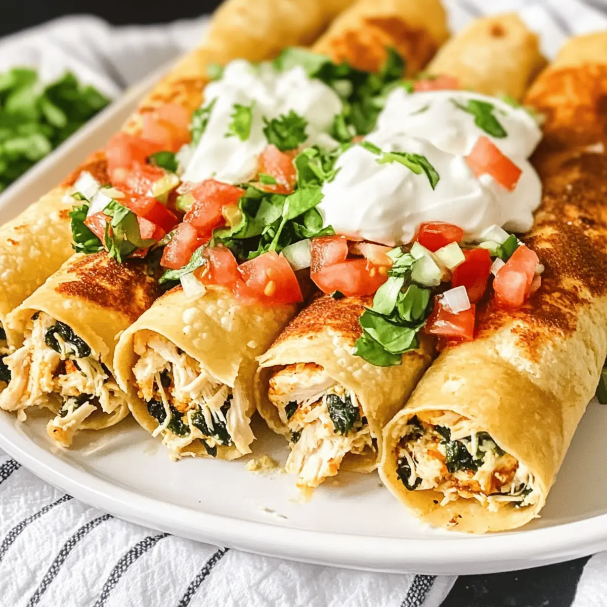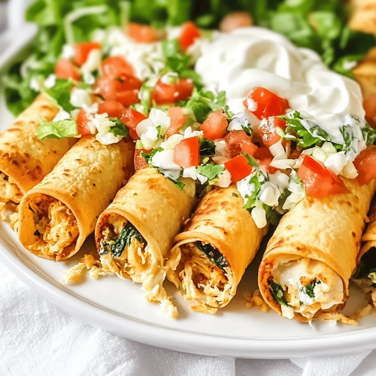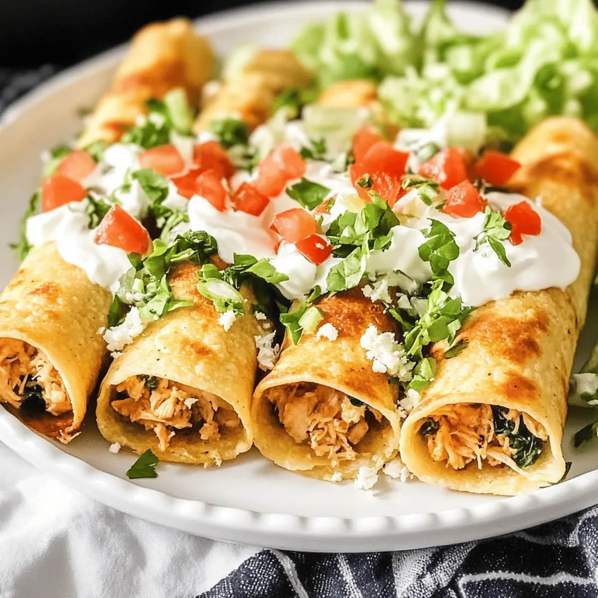 Jump to Recipe Print RecipeThe aroma of sizzling tortillas wafting through the kitchen can take me back to sunny afternoons spent with friends, all hovering around a platter of crisp taquitos. These Quick & Crispy Chicken Taquitos are not just a delightful handheld snack; they’re the kind of family-friendly recipe that transforms any gathering into a fiesta. With only 15 minutes of prep time, you’ll be biting into golden, crunchy shells that hold a creamy, flavorful filling of chicken, cream cheese, and spinach. Not only are they quick to whip up, but they also lend themselves to endless variations, making dinner an exciting adventure for both kids and adults. Whether you’re crafting a cozy weeknight meal or an appetizer for a party, these taquitos will surely become a hit. Have you ever wondered how easy it is to customize a classic dish while keeping it scrumptious? Why Are These Taquitos So Irresistible? Crispy Texture: The golden-brown exterior provides a satisfying crunch that contrasts beautifully with the creamy filling. Quick Preparation: With just 15 minutes of prep, you can whip up these delightful bites, making them a go-to for busy weeknights. Customizable Flavors: The flexibility of ingredients allows you to swap chicken for beef or pork and experiment with different cheeses or salsas for a unique taste every time. Family-Friendly: These taquitos are a hit with both kids and adults, making them the ultimate comfort food for any gathering. Make Ahead: Prepare your filling in advance and enjoy the convenience of quick meals—just freeze or bake them for later. Ready to get started? Check out this family-friendly recipe that will make your weeknight dinners deliciously exciting! Taquitos Ingredients For the Filling Shredded Cooked Chicken – This is the heart of your taquitos, making them satisfying and rich in flavor. Cream Cheese – Adds a delicious creaminess; consider swapping it with cottage cheese for a lighter option. Baby Spinach – Provides fresh nutrition; feel free to use kale or collard greens if preferred. Shredded Colby Jack Cheese – Gives that melty texture; you can swap in a Mexican blend or your favorite cheese. Salsa – This packs a punch of flavor; both store-bought and homemade salsas work wonderfully. Sour Cream – For extra creaminess; can be substituted with Greek yogurt for a tangy twist. Salt & Pepper – Essential seasonings to enhance all the flavors. For the Tortillas Corn Tortillas – Ideal for rolling and provides that classic taquito taste; flour tortillas can be used as an alternative. Optional Toppings Shredded Lettuce – Adds a nice crunch and freshness. Chopped Tomatoes – A burst of juicy texture that pairs perfectly with your taquitos. Pico de Gallo – A fresh salsa that complements the filled taquitos beautifully. Additional Sour Cream – For a creamy dip that elevates every bite. Embrace the joy of creating these taquitos that are not just a meal, but a chance to bring everyone together at the table! Step‑by‑Step Instructions for Quick & Crispy Chicken Taquitos Step 1: Heat the Oil In a large saucepan or skillet, pour in enough vegetable or canola oil to create a shallow layer about ½ inch deep. Heat the oil over medium heat until it reaches 350°F; you can test the temperature by dropping a small piece of tortilla in—it should sizzle immediately. Keep an eye on the oil, as this will be key to achieving crispy taquitos. Step 2: Mix the Filling While the oil is heating, combine the shredded cooked chicken, cream cheese, chopped spinach, and shredded Colby Jack cheese in a large mixing bowl. Add salsa, sour cream, salt, and pepper to taste. Mix everything together until it forms a cohesive and creamy filling that’s bursting with flavor—this will be the heart of your taquitos. Step 3: Prepare the Tortillas Warm the corn tortillas slightly in the microwave by wrapping them in a damp paper towel for about 15-30 seconds; this will help to prevent them from cracking when rolled. Lay each warmed tortilla flat and place a few tablespoons of the creamy chicken filling in the center. Roll them tightly, sealing the edges with the seam side down. Step 4: Fry the Taquitos Once the oil is heated, carefully place the rolled taquitos seam-side down into the hot oil, ensuring not to overcrowd the pan. Fry each taquito for 2-3 minutes until they are golden brown and crispy on one side, then gently flip them over to cook the other side. The sizzling sound will let you know they are cooking perfectly! Step 5: Drain and Serve Using tongs, carefully remove the crispy taquitos and place them on a plate lined with paper towels to drain any excess oil. Once drained, arrange them on a serving platter. Serve your Quick & Crispy Chicken Taquitos warm, adorned with toppings like shredded lettuce, chopped tomatoes, sour cream, or Pico de Gallo for a delicious finish. How to Store and Freeze Taquitos Fridge: Keep leftover taquitos in an airtight container for up to 3 days. To maintain their crunch, reheat in the oven rather than the microwave. Freezer: Freeze the taquitos in a single layer on a baking sheet before transferring them to a freezer-safe bag. They can be stored for up to 3 months. Reheating: For quick reheating, air fry frozen taquitos at 375°F for about 10-12 minutes or bake them in the oven at 400°F for 15-20 minutes until crispy. Make-Ahead: Prepare the filling up to 24 hours in advance and refrigerate. Assemble the taquitos just before frying or baking for maximum freshness. What to Serve with Quick & Crispy Chicken Taquitos Enhance your taquito experience with these delicious side dishes and accompaniments that will elevate your meal. Fresh Guacamole: Creamy and rich, this dip adds a wonderful contrast to the crispy taquitos, bringing a burst of flavor with every bite. Its vibrant green color makes your plate look more inviting! Tangy Salsa Verde: This salsa’s zesty flavor complements the savory chicken filling beautiful