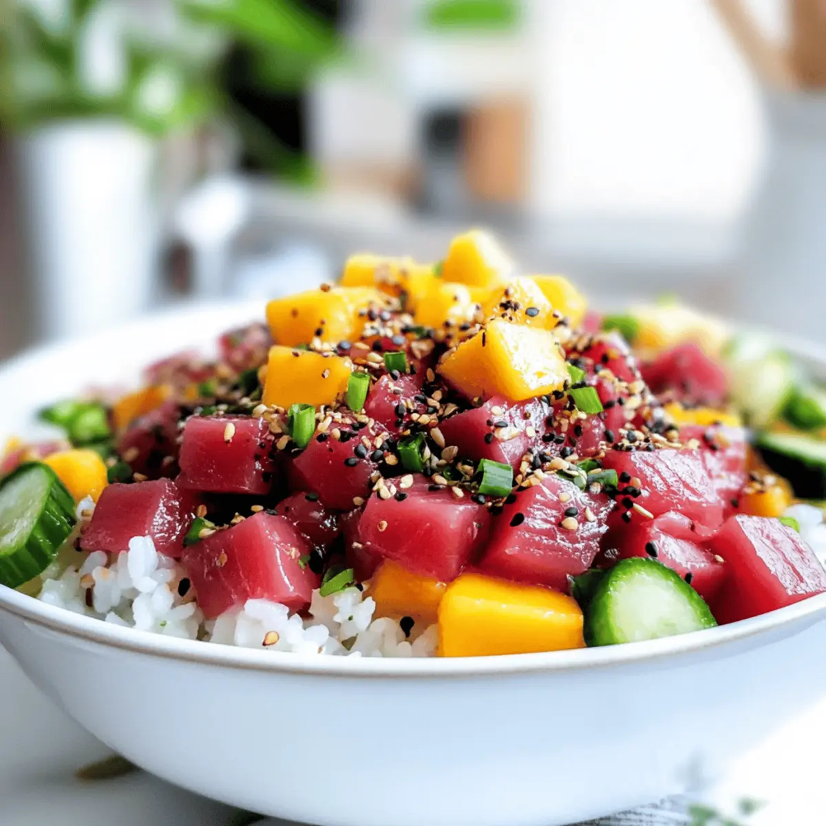 These Tuna Poke Bowls are a fantastic choice for meal prep, allowing you to enjoy fresh flavors even on your busiest days! You can prepare the sushi rice up to 24 hours in advance; just store it in an airtight container in the refrigerator to maintain its texture. Additionally, you can dice the vegetables—such as mango, cucumber, and bell pepper—up to 3 days ahead. Keep them in a sealed container in the fridge to preserve their crispness and avoid browning. When you’re ready to assemble your Tuna Poke Bowl, simply marinate the sashimi-grade tuna for 15 minutes before serving, and layer everything together for a quick, nourishing meal that tastes just as delicious as when made fresh!