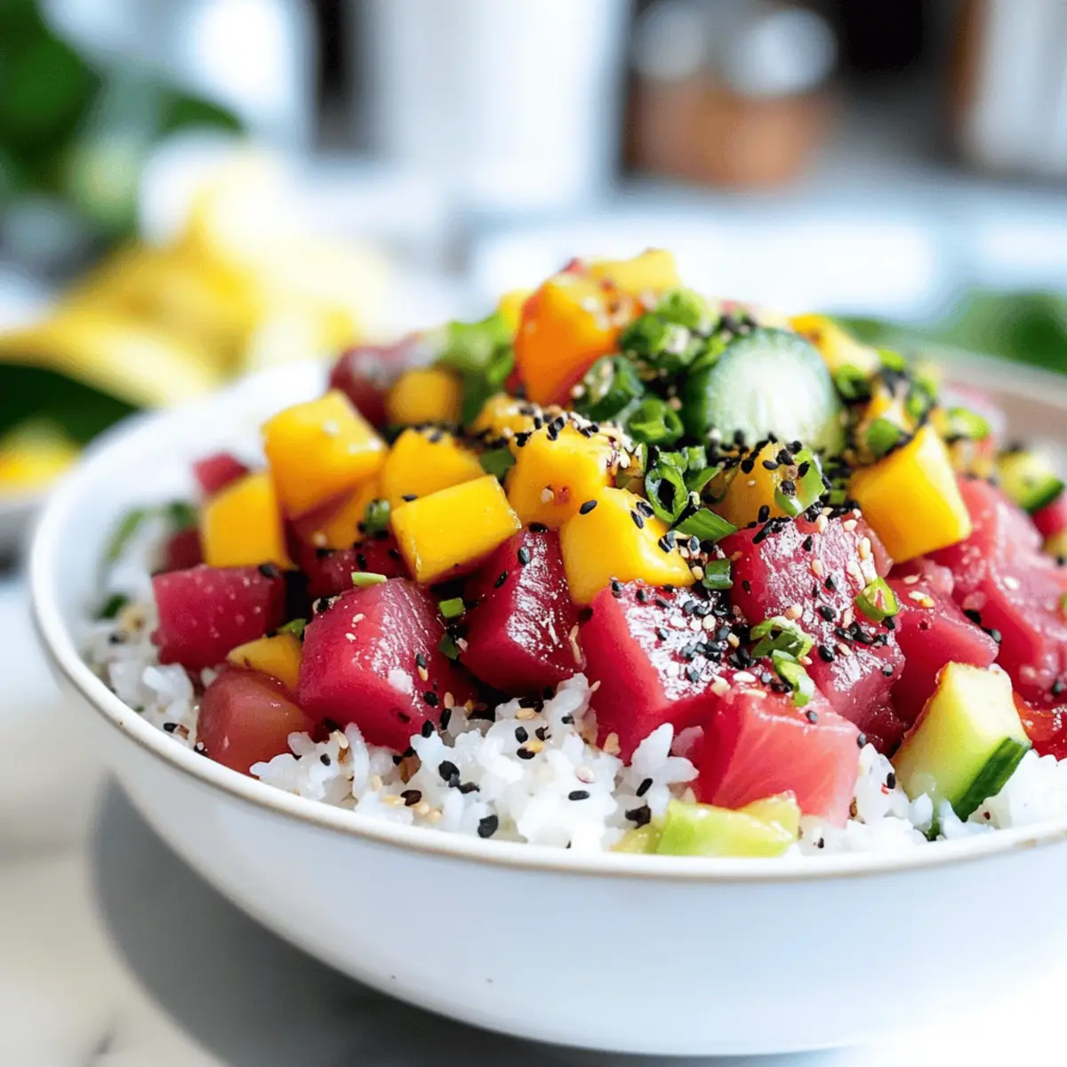 5. In serving dishes, layer sushi rice, marinated tuna, and mango cucumber salad. Garnish with optional toppings.