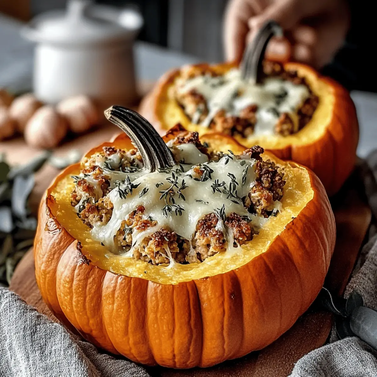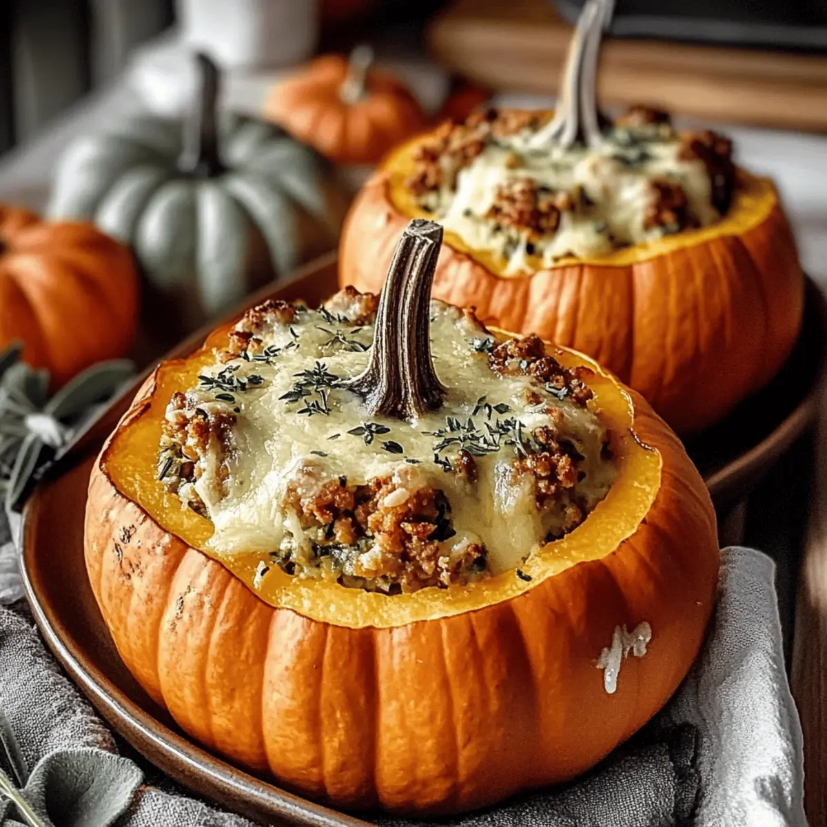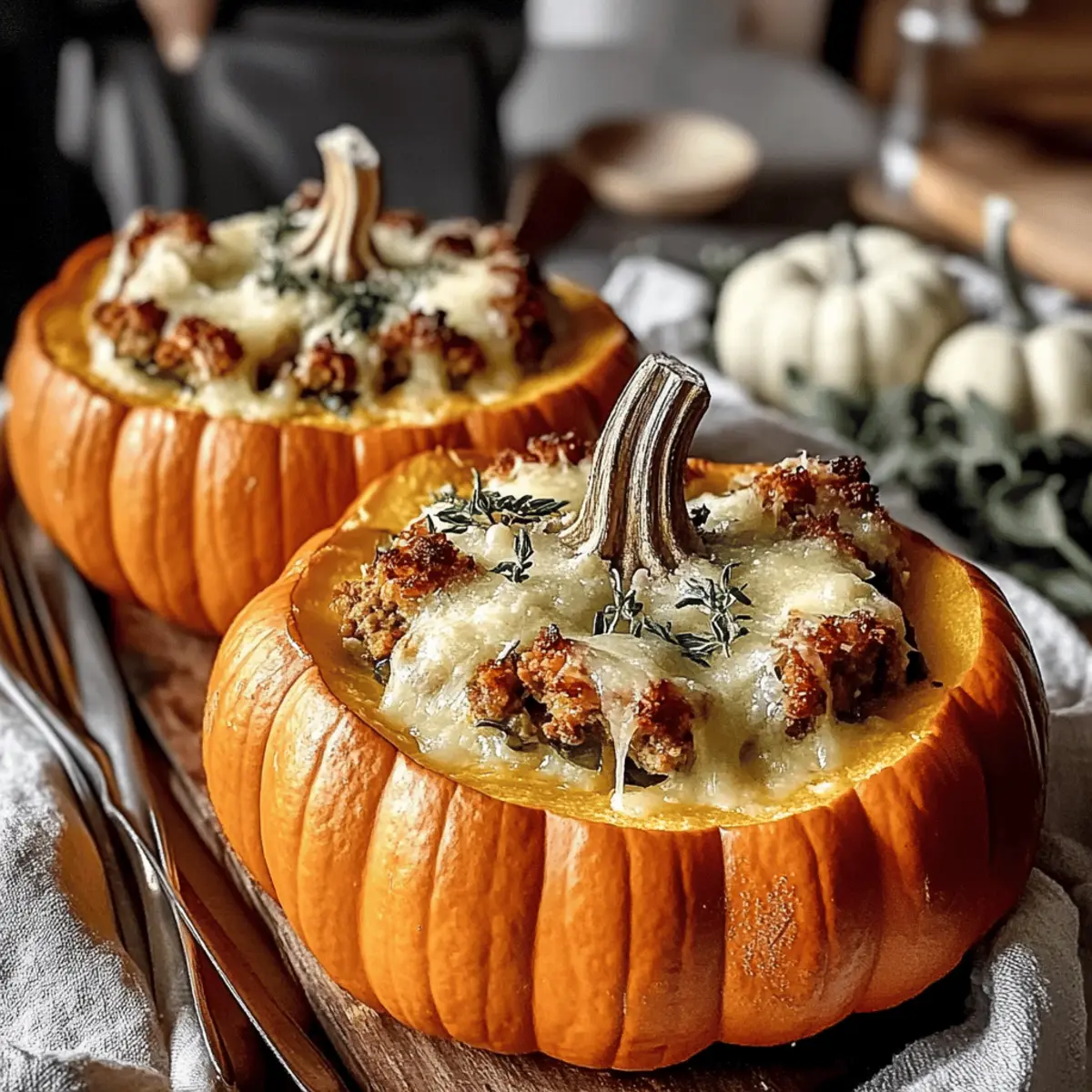 Jump to Recipe Print RecipeAs the crisp autumn air fills my kitchen, an unexpected aroma dances through the room, transporting me straight to a cozy Thanksgiving gathering. These Turkey Sage Stuffed Pumpkins are not just a dish; they’re a celebration of the season’s rich harvest. The delightful pairing of roasted pumpkins with savory turkey and aromatic sage creates a stunning centerpiece that’s as comforting as it is delicious. With quick prep time and a one-pot cleanup, these beauties allow you to focus on what really matters—making memories with loved ones around the table. And for those who prefer a plant-based option, I’ve got you covered with easy vegetarian substitutions. How will you personalize your stuffed pumpkins this fall? Why Choose Turkey Sage Stuffed Pumpkins? Heartwarming Comfort: These Turkey Sage Stuffed Pumpkins combine the sweetness of roasted pumpkin with the savory blend of flavorful turkey and herbs, creating a dish that truly warms the soul. Versatile Options: Whether you want to stick to the comforting original or explore vegetarian variations by swapping turkey for mushrooms or lentils, this recipe easily adapts to your preferences. Time-Saving Delight: With straightforward preparation, you can whip these up with minimal fuss, leaving you more time to relax or enjoy seasonal activities with friends and family. Gorgeous Presentation: Served in their natural pumpkin bowls, these stuffed treasures will impress your guests and elevate any dining table setting. They are perfect alongside a simple green salad or even paired with the tartness of cranberry sauce. Easy Cleanup: Forget complicated cookware; for effortless cleanup, this one-pot wonder helps keep your kitchen blissfully mess-free after a delicious feast. Get ready to bring joy to your fall gatherings with these delightful stuffed pumpkins! Turkey Sage Stuffed Pumpkins Ingredients For the Pumpkins • Small Sugar Pumpkins – These are perfect for serving, ideally around 6-8 inches in diameter for the best presentation. • Olive Oil – Adds moisture and flavor; you can use melted butter for a richer alternative. • Salt & Black Pepper – Essential for enhancing the natural flavors; feel free to adjust based on your taste. For the Filling • Ground Turkey – The main protein that gives heartiness to your stuffed pumpkins; swap it with mushrooms or lentils for a vegetarian version. • Onion – This adds a layer of sweetness to the stuffing; shallots can work well as a replacement. • Garlic – Infuses the filling with aromatic flavor; a must-have in any savory dish! • Celery & Carrots – Contribute both texture and sweetness; bell peppers or zucchini are great substitutes if needed. • Dried Cranberries – Provides a sweet-tart contrast in every bite; if unavailable, raisins or chopped dates are excellent alternatives. • Fresh Sage & Parsley – Key ingredients that elevate the dish with fresh aromas; dried herbs can be used if fresh isn’t at hand. • Dried Thyme & Rosemary – These herbs enhance the savory aspect of the stuffing; dried varieties can be used as a substitution. • Ground Nutmeg – Introduces warmth and depth; just a pinch goes a long way in flavor. • Chicken Broth – Adds moisture and taste; swap for vegetable broth for a vegetarian-friendly dish. • Cooked Wild Rice (or Brown Rice) – Provides heartiness and fiber; quinoa serves as a great alternative. • Grated Parmesan Cheese (optional) – For a creamy finish to your stuffing; feel free to omit for a dairy-free option. These Turkey Sage Stuffed Pumpkins will surely impress your family and friends, both in taste and presentation! Step‑by‑Step Instructions for Turkey Sage Stuffed Pumpkins Step 1: Preheat the Oven Begin by preheating your oven to 375°F (190°C). This temperature will perfectly roast your small sugar pumpkins, ensuring they become tender and flavorful. While the oven warms up, gather your ingredients and equipment, including a cutting board, knife, and a lined baking sheet. Step 2: Prepare the Pumpkins Wash the pumpkins thoroughly to remove any dirt. Next, carefully cut off the tops and scoop out the seeds using a spoon. Aim for a hollow interior that’s ready to be filled. Set the tops aside, as they’ll serve as cute lids later. You’ll want the pumpkin’s flesh to glisten with freshness as you prepare to season them. Step 3: Season the Pumpkins Drizzle a generous amount of olive oil inside each pumpkin and sprinkle with salt and black pepper, ensuring to coat the insides evenly. This step enhances the flavor profile of your Turkey Sage Stuffed Pumpkins, allowing the natural sweetness of the pumpkin to shine through. Step 4: Bake the Pumpkins Place the prepared pumpkins, cut side up, on the lined baking sheet. Slide them into your preheated oven and bake for 30-40 minutes, or until they are slightly softened but still retain their shape. Look for a tender skin that’s easy to pierce with a fork but not fully collapsed. Step 5: Cook the Turkey Filling In a skillet, heat a splash of olive oil over medium heat. Add the ground turkey and brown it thoroughly, breaking it up with a spatula. Once the turkey is cooked through with no pink visible, drain any excess grease to keep your stuffing deliciously light. Step 6: Sauté the Veggies To your skillet of ground turkey, add chopped onion, minced garlic, diced celery, and carrots. Sauté the mixture until the vegetables have softened, about 5-7 minutes. The aroma will start filling your kitchen, and the onions should become translucent by this stage, adding depth to your filling. Step 7: Mix in the Flavorful Ingredients Stir in the dried cranberries, fresh sage, parsley, dried thyme, rosemary, and a pinch of ground nutmeg. Combine everything well and allow the mixture to cook briefly for 2-3 minutes, letting the herbs release their aromatic flavors and infuse the stuffing with warmth. Step 8: Add Broth and Rice Pour in the chicken bro