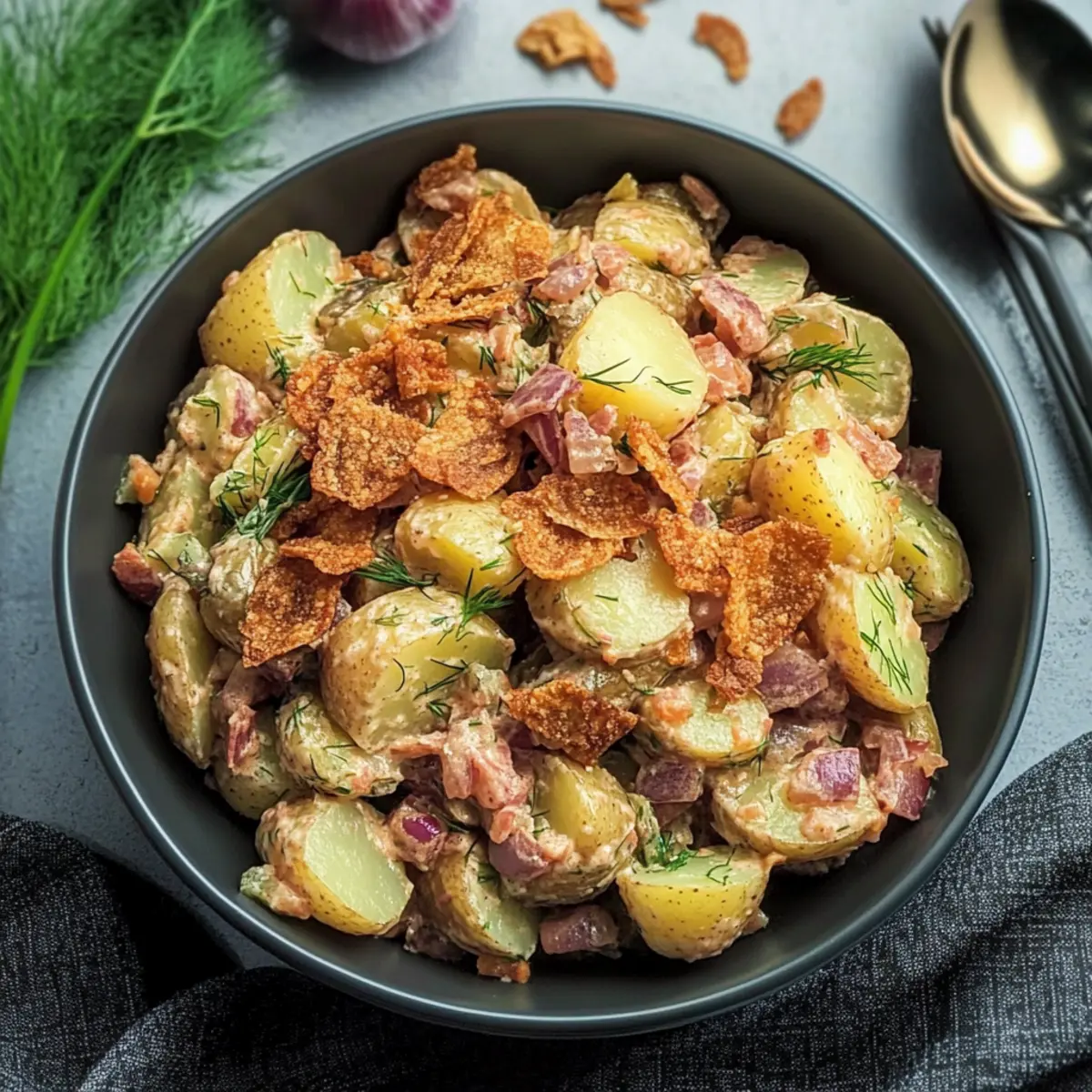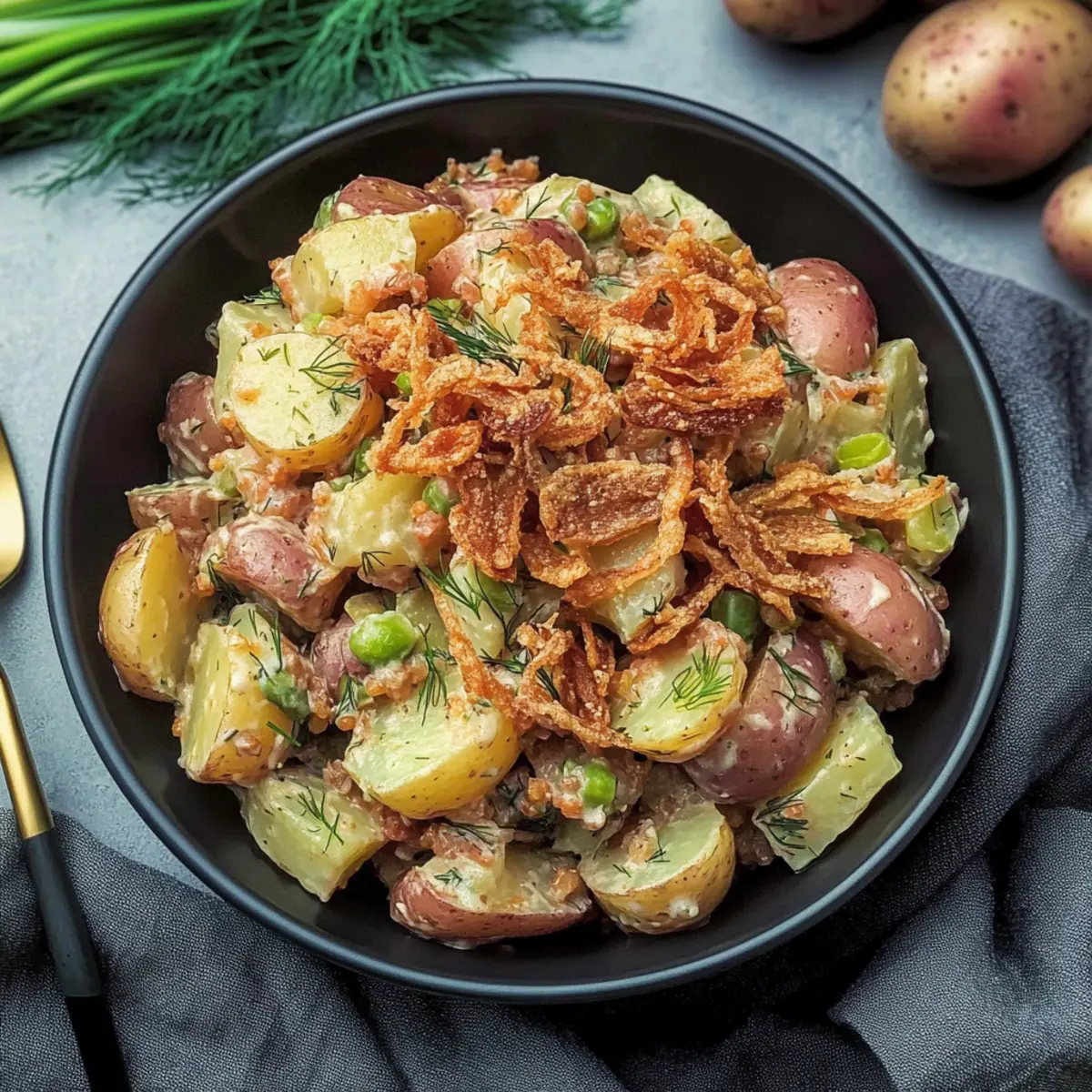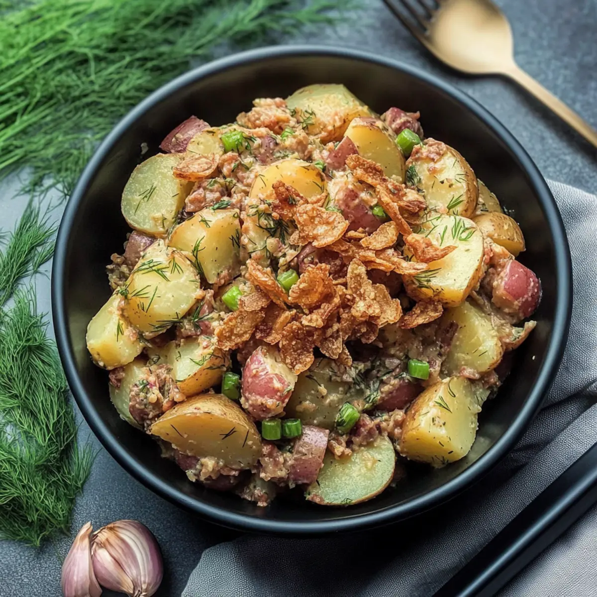 Jump to Recipe Print RecipeAs the chilly breeze swirls through my kitchen, it brings with it a yearning for comforting, hearty dishes, and nothing fits that bill quite like Vegan German Potato Salad. This plant-based delight is a twist on a beloved classic, featuring tender baby potatoes dressed in a tangy vinaigrette, fresh dill, and a dash of smoky flavor that warms you from the inside out. Not only is this recipe a fantastic alternative to those traditional mayo-laden salads, but it’s also incredibly quick to whip up and perfect for any gathering. Whether served warm or at room temperature, it makes a memorable side dish to pair with your favorite vegan main courses. Ready to discover the magic of this creamy yet light dish? Let’s dive into the recipe! Why is Vegan German Potato Salad Awesome? Unique Twist: This recipe redefines classic potato salad by swapping mayonnaise for a vibrant vinaigrette, catering to vegan palettes without skimping on flavor. Quick and Easy: With simple ingredients and fast preparation, it’s perfect for those busy weeknights or impromptu gatherings. Hearty Yet Light: The creamy texture of baby red potatoes contrasts beautifully with the tangy dressing, offering a satisfying side that’s not too heavy. Crowd-Pleaser: Whether you’re entertaining family or friends, this dish appeals to everyone, proving that vegan meals can be popular too—just like a refreshing Tomato Salad Refreshing or a light Watermelon Cucumber Salad. Versatile Option: Pair it effortlessly with grilled tofu or vegan sausages for a wholesome meal, making it as adaptable as your favorite Sweet Pepper Salad. Vegan German Potato Salad Ingredients For the Salad • Baby Red Potatoes – The main component providing structure and creaminess; any waxy potatoes work as a substitute. • Salt – Enhances flavor during boiling; essential for perfect potatoes. • Red Onion – Adds a mild sweetness and depth; you can use shallots for a milder taste. • Olive Oil – Used to sauté onions and in the dressing for richness; any light cooking oil can replace it. • Red Wine Vinegar – Provides tanginess to the dressing; apple cider vinegar is a great alternative. • Maple Syrup – Adds natural sweetness that balances the flavors; honey works too but isn’t vegan. • Dijon Mustard – Gives depth and tang to the dressing; whole-grain mustard can offer a different texture. • Green Onions – For garnish; they add a fresh, vibrant taste to the salad. • Fresh Dill – Brings herbaceous notes; if out of fresh dill, swap for 2 teaspoons of dried dill. • Crispy Fried Onions – Provides a crunchy texture; can be omitted if a softer salad is preferred. • Hickory Smoked Sea Salt – Enhances the flavor with a smoky taste; using regular sea salt will work too. • Black Pepper – For seasoning to taste; freshly cracked is recommended for best flavor. For Serving • Fresh Herbs – Sprinkle additional herbs for color and taste; parsley or chives can be delightful substitutes. • Vegan Sausages – Serve alongside for a hearty meal; a satisfying combination that pleases everyone. Now that you have all the ingredients handy, you’re ready to create a Vegan German Potato Salad that will be a hit at your table! Step‑by‑Step Instructions for Vegan German Potato Salad Step 1: Boil the Potatoes Begin by bringing a large pot of salted water to a boil over high heat. Add in your baby red potatoes, ensuring they are submerged. Cook them for about 10 minutes or until fork-tender but not mushy—this will ensure they hold their shape in the Vegan German Potato Salad. Step 2: Slice the Potatoes Once the potatoes are cooked, carefully drain them in a colander and let them cool for a few minutes. After they are cool enough to handle, slice each potato into ½-inch thick rounds. Aim for uniform slices to ensure consistent texture throughout the salad. Step 3: Sauté the Onions In a medium skillet, heat 2 tablespoons of olive oil over medium heat. Add the sliced red onions and sauté for about 3 minutes, stirring frequently, until the onions become soft and translucent. The vibrant color will deepen, which is a sign they are perfectly cooked. Step 4: Prepare the Dressing To the skillet, add ¼ cup of red wine vinegar and 1 tablespoon of maple syrup, stirring to combine. Let this simmer for about 2 minutes, allowing the flavors to meld together before removing the skillet from the heat. The dressing should have a lovely, fragrant aroma. Step 5: Mix in the Mustard Next, whisk in an additional 2 tablespoons of olive oil and 2 teaspoons of Dijon mustard into the warm dressing until well combined. This will add a delightful tang to the Vegan German Potato Salad, enhancing the overall flavor. Step 6: Combine Potatoes and Dressing In a large bowl, gently toss the potato slices with the warm dressing, taking care not to break the potatoes. The warmth will help the flavors penetrate the potatoes, transforming them into flavorful bites. You can now fold in diced green onions, chopped fresh dill, and any crispy fried onions you desire. Step 7: Season and Serve Finally, season your Vegan German Potato Salad with salt and freshly cracked black pepper to taste. Serve the salad warm or let it cool to room temperature for the best flavor experience. This comforting side dish pairs wonderfully with your favorite vegan mains! What to Serve with Vegan German Potato Salad As you embark on the journey of crafting a delightful feast, consider these perfect pairings that elevate your meal to new heights. Grilled Tofu: This hearty protein option complements the tangy notes of the salad, adding a satisfying texture and flavor contrast. Vegan Sausages: Juicy and bursting with flavor, sausages are an ideal match, bringing richness that beautifully balances the lighter elements of the potato salad. Roasted Brussels Sprouts: These tender yet crispy gems provide a delightful crunch and earthy flavors, harmonizing wonderfully w
