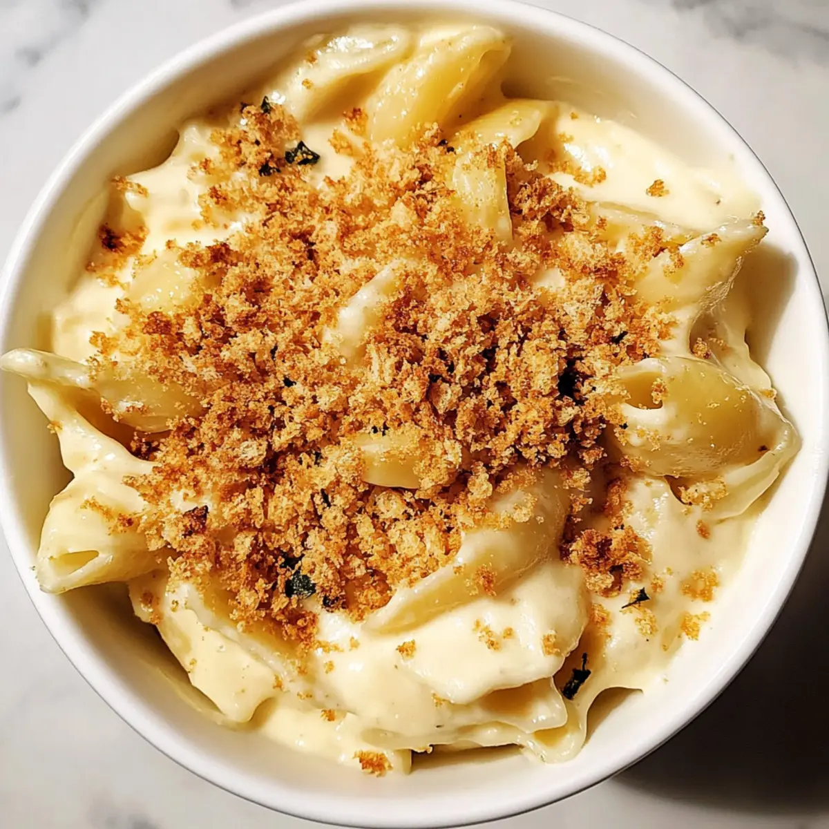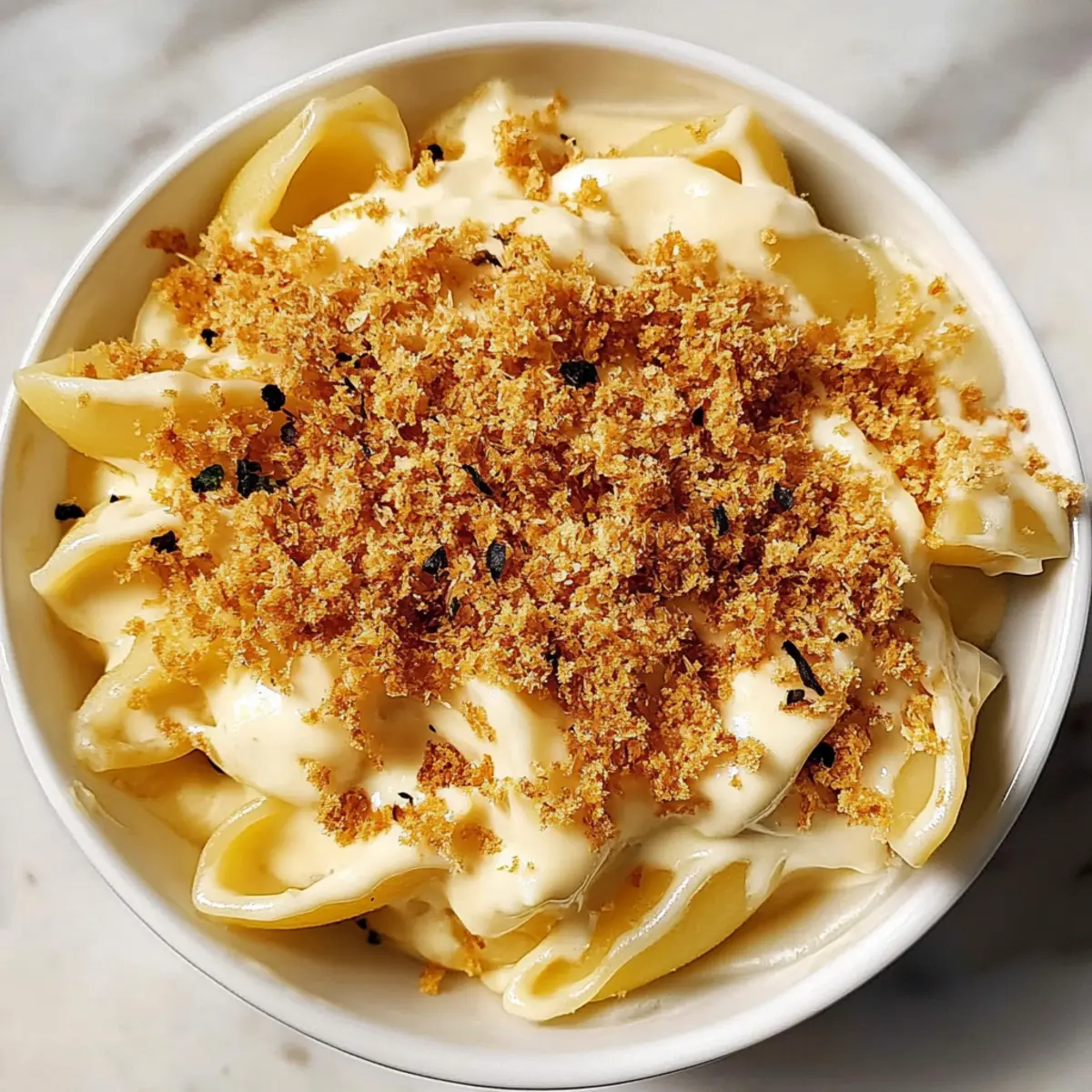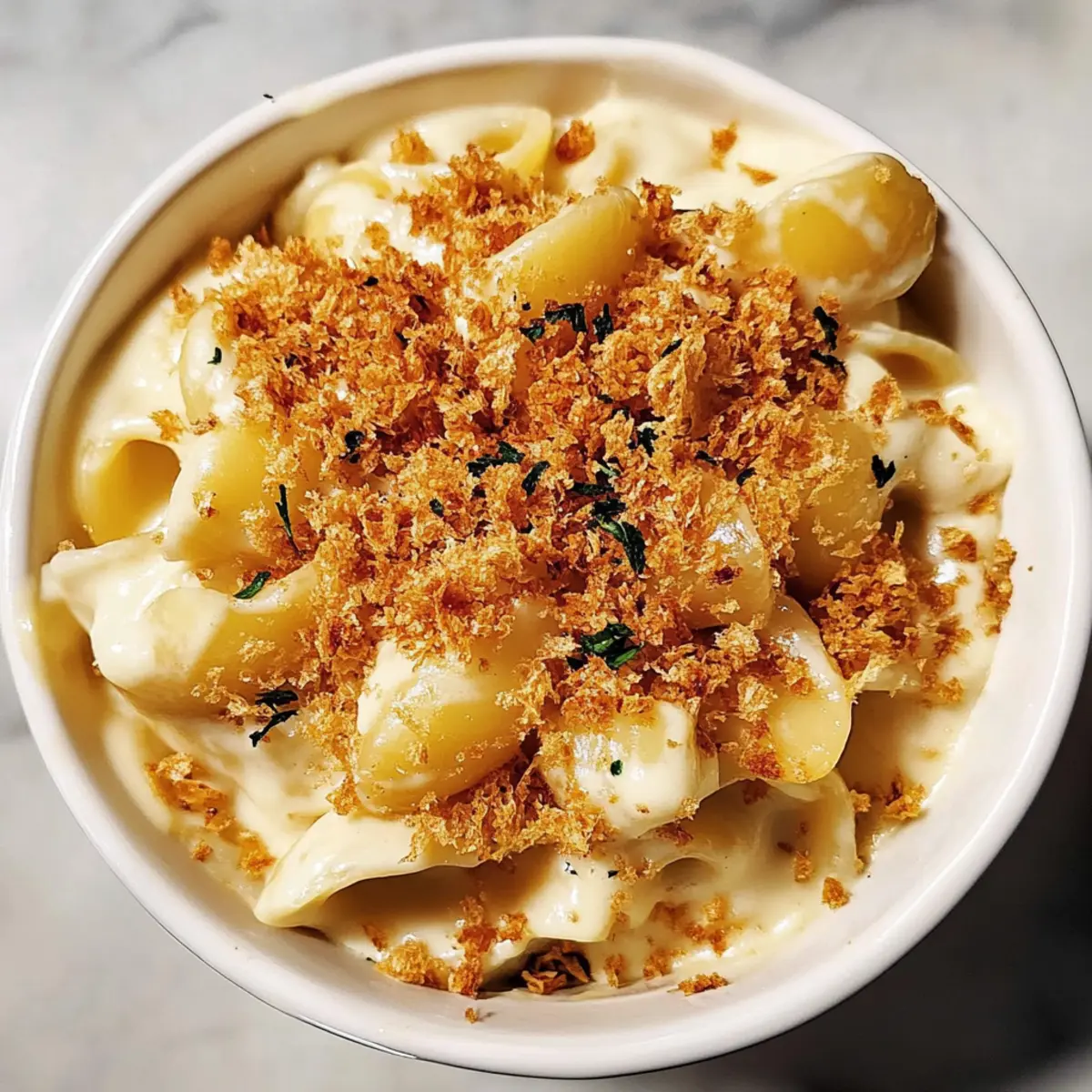 Jump to Recipe Print RecipeAs I stirred the pot, a wave of nostalgia washed over me, reminding me of cozy family dinners filled with laughter and warmth. This Creamy Vegan Mac & Cheese with Sauerkraut is my heartfelt tribute to those comforting moments, and it’s a game-changer for anyone longing for a dairy-free indulgence without sacrificing flavor. The secret ingredient, sauerkraut, adds a tangy twist that elevates this classic dish to new heights, making it not only delicious but also a fun conversation starter. Plus, it comes together quickly for those busy weeknights, making it a crowd-pleaser that’s perfect for your next get-together. Curious how such a creamy delight can be completely vegan? Let’s dive in! Why is Vegan Mac & Cheese Amazing? Delicious Dairy-Free Comfort: This recipe brings the classic comfort of mac & cheese to your table without any dairy, making it perfect for vegans or those with lactose intolerance. Unique Twist: The addition of sauerkraut introduces an unexpected tangy depth that sets this dish apart from any traditional version. Speedy Preparation: Whip this up in no time, ideal for busy weeknights or last-minute gatherings. Nutritional Powerhouse: With ingredients like cashews and nutritional yeast, you’re not just serving comfort but also a boost of plant-based protein and healthy fats. Versatile Options: Customize it by adding veggies, trying different pasta shapes, or experimenting with spices like smoked paprika for even more flavor! Try serving it alongside a refreshing salad for a complete meal. Vegan Mac & Cheese Ingredients • Here’s everything you need for this delightful dish! For the Cheese Sauce Extra virgin olive oil – Adds richness and flavor; substitute with avocado oil for a different profile. Raw cashews – Creates the creamy base for the cheese sauce; soaked cashews can be replaced with silken tofu if nut-free. Russet potato – Contributes to the creaminess of the sauce; sweet potatoes can be used for added sweetness. Water – Used for blending the sauce; vegetable broth can enhance the flavor. Sauerkraut – Adds a unique umami and tangy flavor to the cheese sauce; swap for pickled green olives for a different flavor. Nutritional yeast – Provides a cheesy flavor; if unavailable, use a vegan cheese blend. White wine vinegar – Adds brightness; apple cider vinegar can be a suitable substitute. Ground mustard – Provides tanginess; Dijon mustard is a good alternative. Ground cumin – Adds warmth; omit for a less spicy flavor. Kosher salt – Enhances flavors; adjust to taste. Freshly ground black pepper – Adds spice and warmth; use white pepper for a milder flavor. For the Pasta & Topping Medium shells – The pasta base for the dish; substitute with gluten-free pasta for a gluten-free option. Panko bread crumbs – Provides a crunchy topping; use regular bread crumbs if preferred. Fresh thyme leaves – Introduces earthy notes; dried thyme can be used as an alternative (1 tsp). Refined coconut oil or vegetable oil – Adds moisture and depth; any neutral oil can be used. White onion – Offers sweetness and aromatic flavors; yellow onion is a good substitute. Medium yellow pepper – Adds sweetness and color; red bell pepper can be used for a sweeter flavor. Hot sauce (such as Cholula) – Offers a kick of heat; omit if spice is not desired. Get ready to create a creamy vegan mac & cheese that’s sure to delight any crowd! Step‑by‑Step Instructions for Creamy Vegan Mac & Cheese with a Tangy Twist Step 1: Boil Pasta Begin by bringing a large pot of salted water to a boil over high heat. Add the medium shells and cook for about 8-10 minutes until they are al dente, stirring occasionally. Once cooked, drain the pasta and set it aside, allowing the steam to escape so it doesn’t get soggy. Step 2: Prepare Sauce Base In a medium saucepan, heat 2 tablespoons of extra virgin olive oil over medium heat. Add finely chopped white onion and diced yellow pepper to the pan, sautéing for about 5-7 minutes until they soften and become translucent. This aromatic base will add depth to your Vegan Mac & Cheese. Step 3: Make Cheese Sauce Transfer the sautéed vegetables into a high-speed blender. To the blender, add soaked raw cashews, chopped russet potato, and 1 cup of water. Include sauerkraut, nutritional yeast, white wine vinegar, ground mustard, ground cumin, kosher salt, and freshly ground black pepper. Blend on high for about 1-2 minutes until the mixture is completely smooth and creamy. Step 4: Combine Pasta & Sauce Once your cheese sauce is blended to a velvety consistency, incorporate the drained pasta into the blender. Pulse gently to mix everything together, ensuring that the medium shells are evenly coated with the creamy cheese sauce. The result should be a luscious, rich mixture that embodies the flavors of Vegan Mac & Cheese. Step 5: Prepare Topping In a skillet, heat 2 tablespoons of olive oil over medium-low heat. Add panko bread crumbs and fresh thyme leaves, stirring constantly for about 3-5 minutes until the crumbs turn golden brown and crispy. This crunchy topping brings a delightful texture contrast to your vegan dish. Step 6: Serve Transfer the creamy Vegan Mac & Cheese to a serving dish and generously sprinkle the toasted breadcrumb topping over the surface. For an extra touch, add a sprinkle of fresh thyme leaves. Serve this comforting dish hot, and bask in the satisfaction of a delicious, homemade meal that everyone will love! Vegan Mac & Cheese Variations Feel free to get creative and customize this dish to suit your taste buds and dietary preferences! Dairy-Free: Substitute cashews with silken tofu for a nut-free, creamy base. This swap keeps the richness while catering to various dietary needs. Gluten-Free: Use gluten-free pasta for a celiac-friendly option. Enjoy the same texture and flavor without gluten worries! Veggie Boost: Toss in steamed broccoli or spinach for a pop of color and nutrition. Th