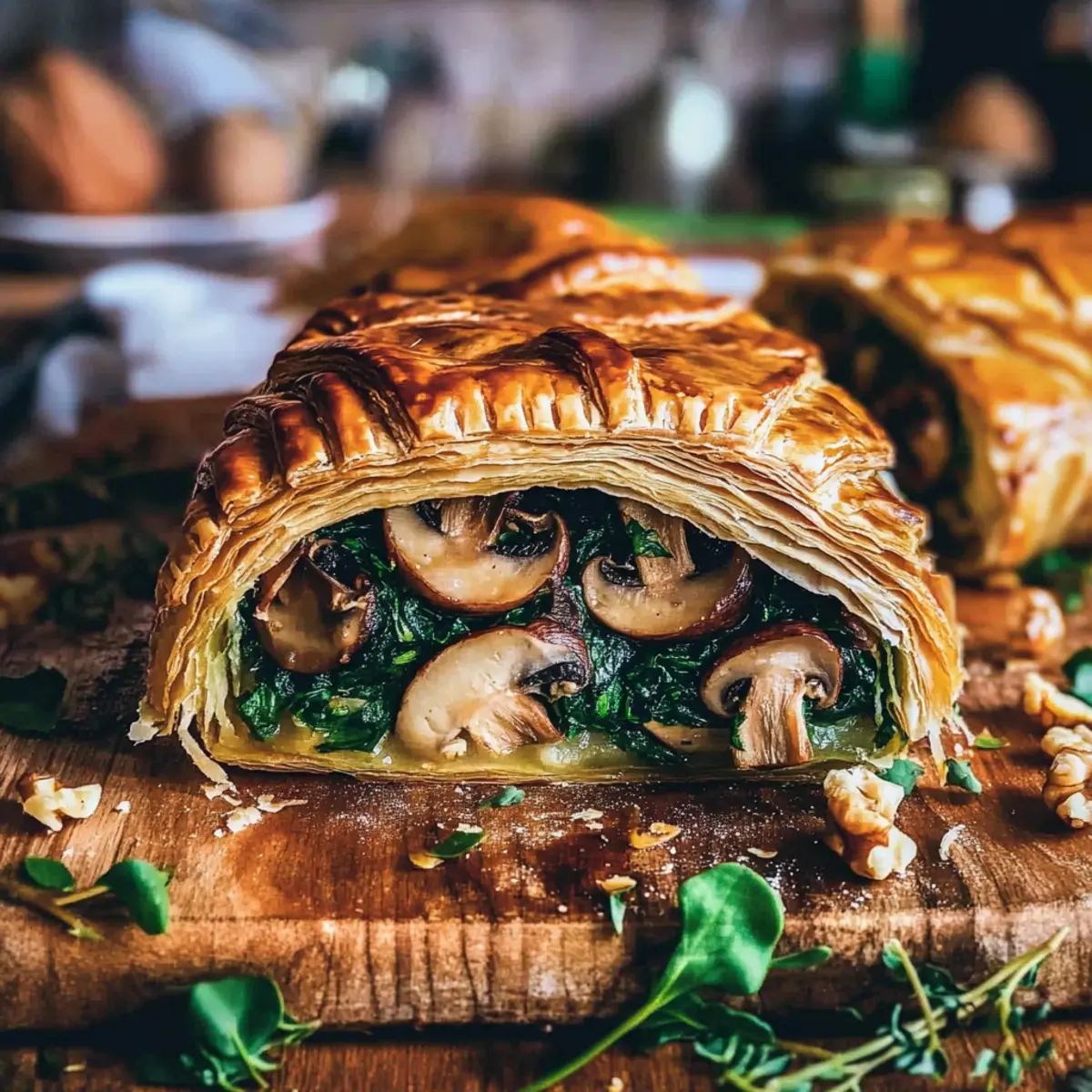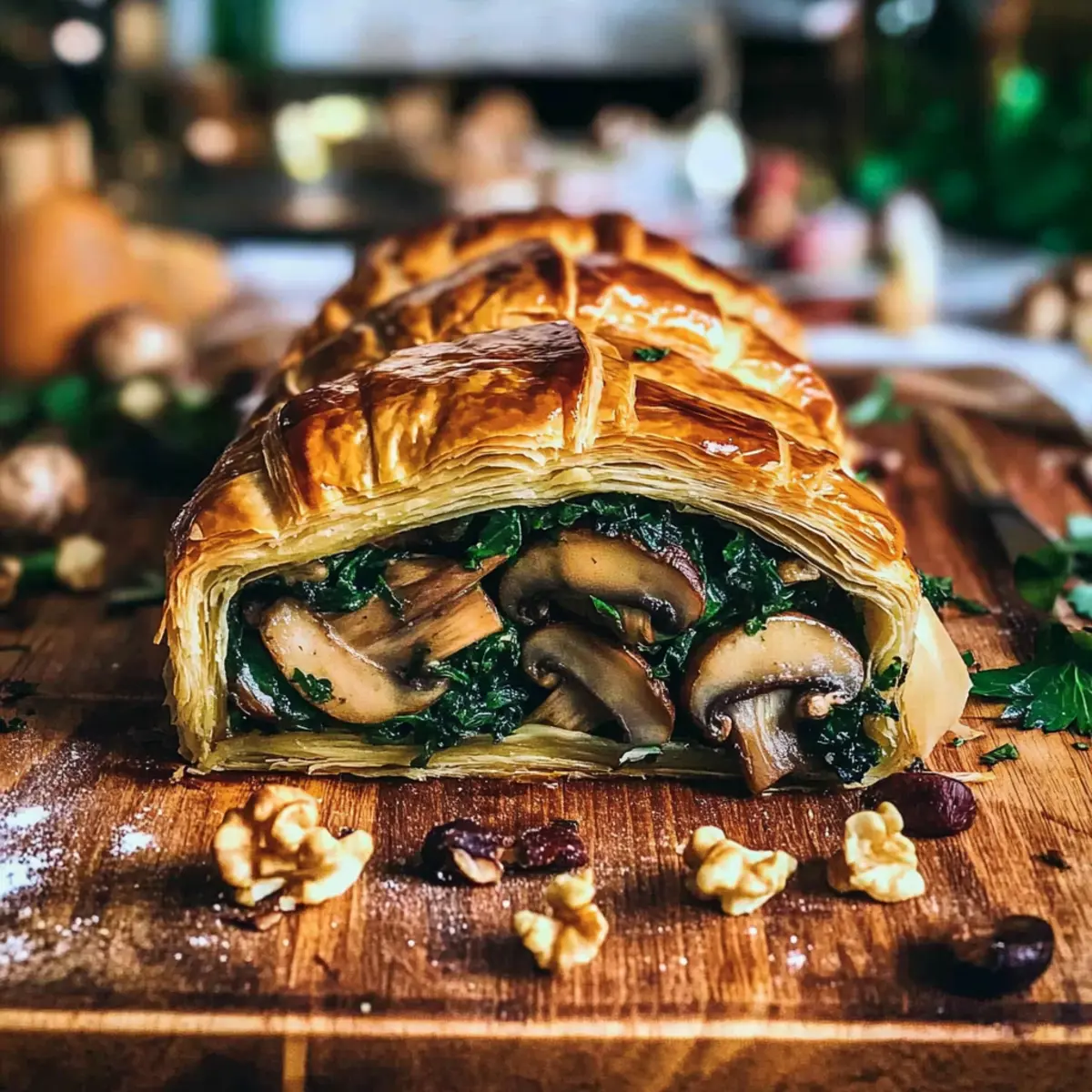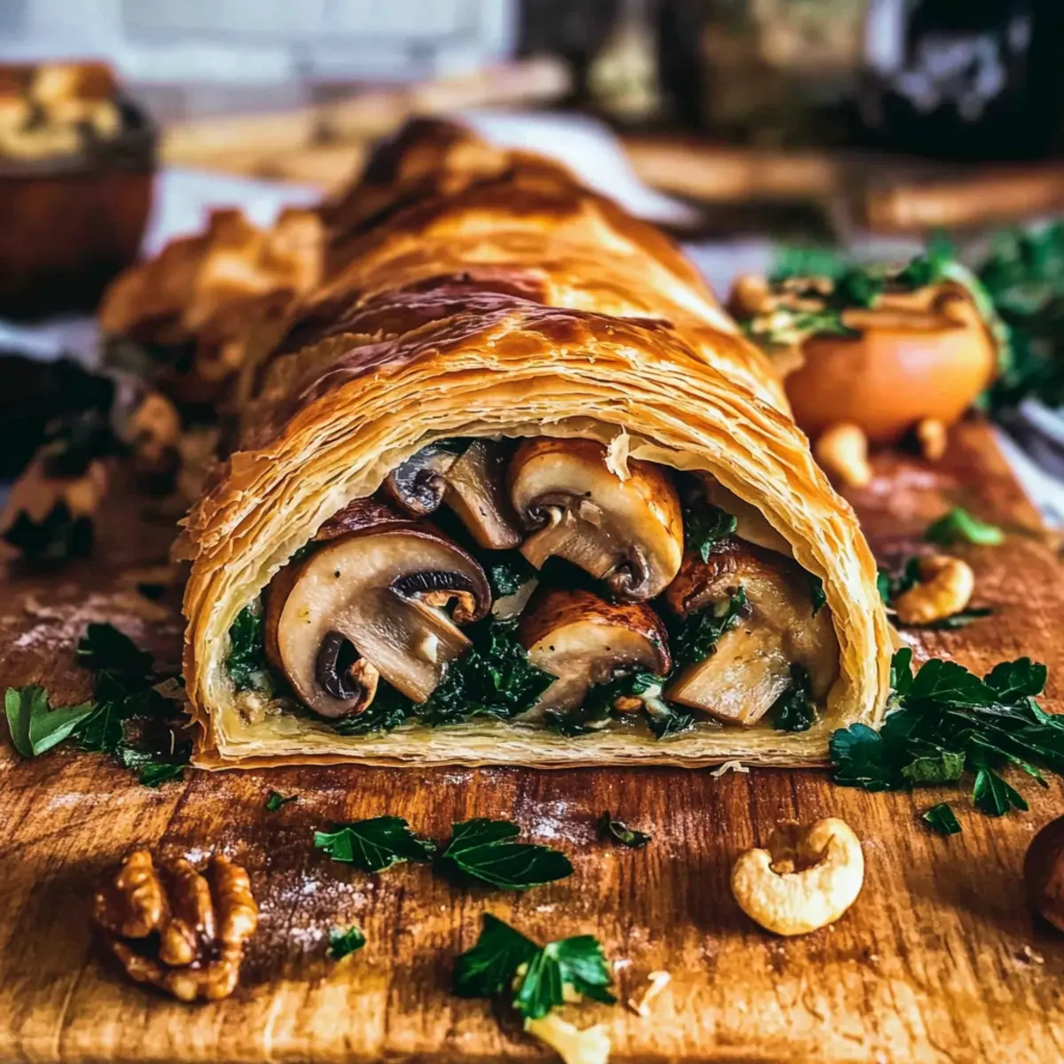 Jump to Recipe Print RecipeAs I placed my latest creation in the oven, the delightful aroma of sautéed mushrooms and garlic filled the kitchen, transporting me to a cozy winter evening. Think of a classic holiday gathering, but with a twist—this Vegan Mushroom Wellington is here to steal the show! With its flaky puff pastry packed with a savory blend of umami-rich mushrooms, caramelized onions, and warm spices, this dish is not only easy to prepare but also a perfect centerpiece for any festive feast. Customizable to your taste, it accommodates various diets while ensuring that everyone—vegan or not—will be reaching for seconds. Ready to impress your guests? Let’s dive into this heartwarming recipe that’s guaranteed to elevate your holiday dinner! Why is Mushroom Wellington so irresistible? Flavor Explosion: This dish bursts with umami-rich flavors from mushrooms, caramelized onions, and garlic, making every bite a celebration of taste. Versatile Delight: Customize the filling with spinach, nuts, or even your favorite vegan cheese, ensuring it caters to your personal preferences and dietary needs. Perfect for Gatherings: Serving this Wellington at your next holiday or family dinner will leave everyone impressed—it truly acts as a showstopper on the table. Easy Preparation: You don’t need to be a pro chef; this recipe is designed for simplicity, allowing even novice cooks to shine. Satisfying Comfort: With its flaky pastry and hearty filling, it’s the ultimate comfort food, sure to please both vegans and meat-lovers alike. Check out our serving suggestions for ideas on pairing this dish with creamy mushroom sauce or vegan gravy! Mushroom Wellington Ingredients For the Filling • Mushrooms – A robust, meaty texture that serves as the main ingredient; use 1 ½ lbs (750 g) for best results. • Cooked Rice – Acts as a binder and adds bulk; you can use lentils or more mushrooms as a substitute. (⅔ cup or 125 g) • Olive Oil – Enhances flavor while sautéing; 1-2 tbsp is ideal. • Onion – Adds sweetness and depth; be sure to sauté until translucent. (1 large, peeled and chopped) • Garlic – Provides a fragrant, umami boost; 4 cloves will do the trick. • Baby Spinach – Optional for added nutrition and color; try ⅔ cup (150 g). • Mustard – Introduces a tangy depth of flavor; use 2 tbsp. • Salt and Pepper – Essential for seasoning; don’t skimp on this! • Thyme – Delivers aromatic goodness; include about 4 twigs. • Walnuts or Pecans – Optional, but they add lovely texture and richness; use ¾ cup (100 g) chopped. • Vegan Parmesan or Dairy-free Cheese – For a creamy touch; ½ cup (60 g) optional. • Fine Oats – Helps to bind moisture; can be added in 2-3 tbsp if desired. For the Pastry and Coating • Vegan Puff Pastry – Essential for the structure of your Wellington; use 1 sheet. • Plant-based Milk – For brushing on the pastry to achieve that gorgeous golden color; 2-3 tbsp, soy milk recommended. • Turmeric – Optional, adds a lovely yellow hue to the egg wash. With such an array of ingredients at hand, creating this Mushroom Wellington will not only bring joy to your kitchen but surely delight everyone at your festive gathering! Step‑by‑Step Instructions for Vegan Mushroom Wellington Step 1: Prepare the Filling Begin by finely chopping 1 ½ lbs of mushrooms and setting them aside. Heat 1-2 tablespoons of olive oil in a skillet over medium heat. Sauté 1 large chopped onion until it turns translucent, about 3 minutes. Add the chopped mushrooms and season with salt, pepper, and 4 twigs of thyme, frying for an additional 5 minutes until the mushrooms are golden. Drain any excess moisture for an optimal filling texture. Step 2: Cook Spinach In the same skillet, briefly sauté 4 minced garlic cloves in the leftover oil for 30 seconds until fragrant. Add ⅔ cup of baby spinach and stir for 2-3 minutes until wilted. Ensure to drain excess moisture by placing the cooked spinach in a fine mesh sieve or on a paper towel. This step will help keep your Vegan Mushroom Wellington from becoming soggy. Step 3: Combine Ingredients In a large bowl, mix the cooked mushrooms and onions, sautéed spinach, ⅔ cup of cooked rice, and optional ¾ cup of chopped walnuts or pecans. Stir in 2 tablespoons of mustard, the optional ½ cup of vegan cheese, and add 2-3 tablespoons of fine oats if desired. Adjust the seasoning with more salt and pepper to taste, ensuring a well-rounded flavor for your Mushroom Wellington filling. Step 4: Chill Filling Once combined, tightly wrap the filling mixture in aluminum foil and place it in the refrigerator for about 30 minutes to cool. This chilling step enhances the flavors and makes the filling easier to handle, preventing a soggy Vegan Mushroom Wellington when you go to assemble it. Step 5: Assemble Wellington Preheat your oven to 390°F (200°C). On a lightly floured surface, carefully roll out a sheet of vegan puff pastry to your desired thickness. Place the cooled filling mixture along the center of the pastry, then fold the sides over to enclose the filling, pinching to seal. Transfer your Wellington seam-side down onto a parchment-lined baking tray, ready for baking. Step 6: Bake Before baking, use a sharp knife to cut several slits into the top of the pastry for steam to escape. Brush the top with 2-3 tablespoons of plant-based milk mixed with a pinch of turmeric for a beautiful golden color. Place the tray in the oven and bake for 20-25 minutes or until the pastry is golden and flaky. The Vegan Mushroom Wellington will fill your kitchen with mouthwatering aromas as it cooks! Make Ahead Options These Vegan Mushroom Wellington preparations are perfect for busy home cooks looking to save time without compromising flavor! You can prepare the filling up to 3 days in advance by sautéing the mushrooms, onions, and spinach, then combining them with the other ingredients as described in the recipe. Once mix