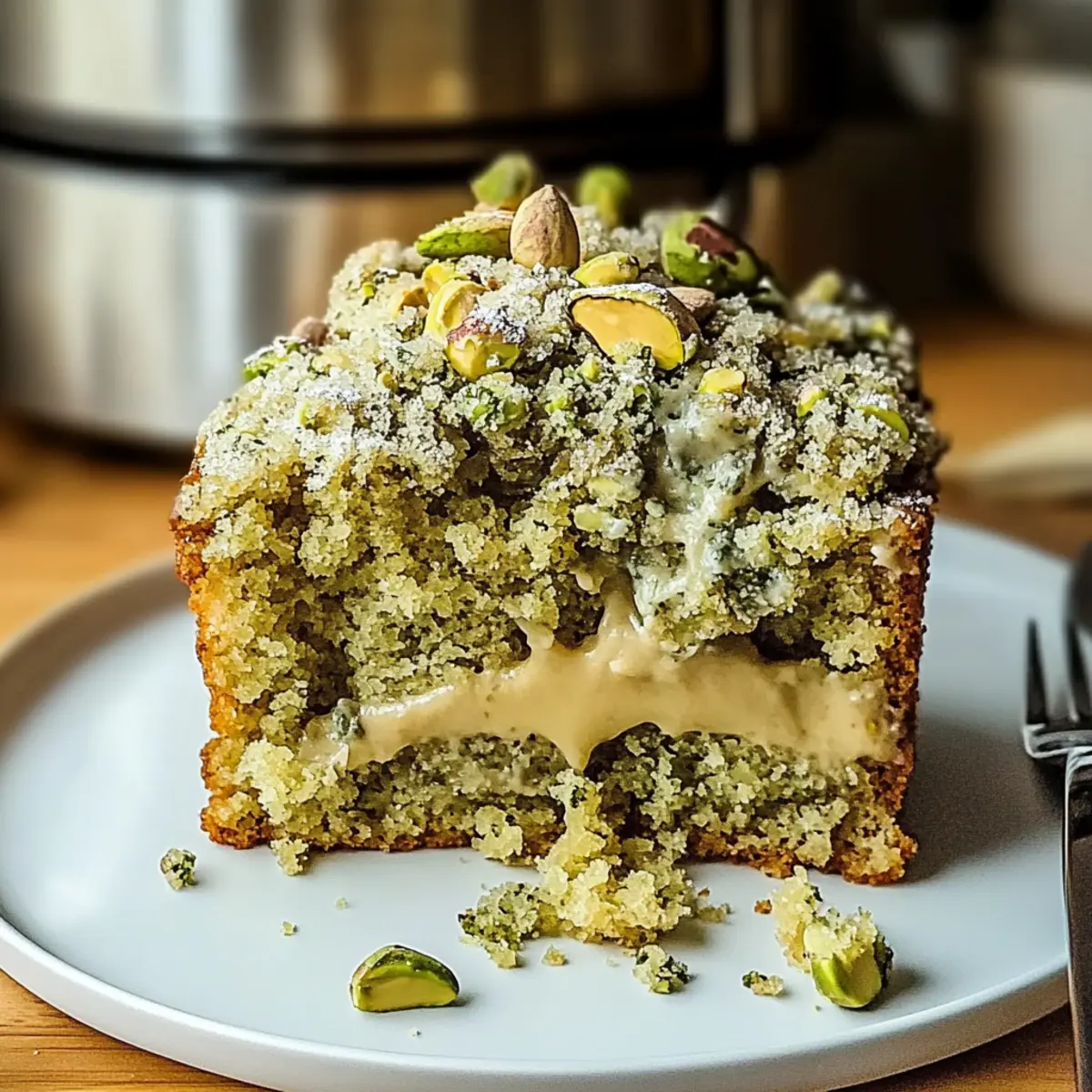 Jump to Recipe Print RecipeIt was an ordinary afternoon when I stumbled upon a charming little café nestled in the heart of the city, filled with the warm aroma of coffee and freshly baked goods. That’s where I discovered the remarkable Vegan Pistachio Coffee Cake, a delightful blend of nutty flavors and rich coffee, all while being completely plant-based. This cake is a game changer—perfect for those seeking a delicious, dairy-free dessert that doesn’t compromise on taste. Not only does it come together in just a breeze, but it also impresses with its beautiful golden crust and tender crumb. Whether you’re a seasoned vegan or just starting on your plant-based journey, this cake is sure to be a hit at your next gathering. Ready to whip up a slice of heaven? Let’s dive into the recipe! Why Make Vegan Pistachio Coffee Cake? Deliciousness Guaranteed: This Vegan Pistachio Coffee Cake brings a unique twist to traditional coffee cakes, with nutty pistachios and aromatic cardamom creating a delightful flavor profile. Easy to Prepare: With just a few simple ingredients, it’s simple enough for beginners to tackle while impressing seasoned home bakers alike! Guilt-Free Indulgence: Enjoy a mouthwatering treat that’s vegan, dairy-free, and egg-free, meaning everyone can savor this sweet pleasure without the heaviness. Versatile Occasion Fit: Whether it’s for brunch, dessert, or a cozy afternoon snack, this cake is perfect for any gathering and pairs wonderfully with a cup of tea or coffee. Consider serving it alongside a slice of Moist Strawberry Shortcake for an extra dessert option! Storage Friendly: This cake keeps well, making it a great option to bake ahead of time and keep in the freezer for those unexpected cravings. Simply thaw and enjoy! Vegan Pistachio Coffee Cake Ingredients Get ready to bake your taste buds happy! For the Cake Flour – Provides structure; you can use all-purpose flour or a gluten-free blend for a lighter option. Baking Soda & Baking Powder – Helps the cake rise; ensure they’re fresh for the best results! Salt – Enhances the other flavors, bringing out the deliciousness of the pistachios. Ground Pistachios – Adds nuttiness and texture; opt for fresh ground for optimal flavor. Vegan Yogurt – Replaces eggs, adding moisture and richness to the cake. Non-Dairy Milk (e.g., almond milk) – Contributes creaminess to the batter, making it lush and delightful. Oil – Adds moisture and helps create that tender crumb we all love. Apple Cider Vinegar – Reacts with baking soda for leavening; substitute with lemon juice if needed. Coffee – Provides depth of flavor and complements the nuttiness; feel free to skip for a caffeine-free version. Cardamom – Adds warmth and a lovely aromatic spice, elevating the overall flavor experience. For the Optional Glaze Powdered Sugar – Sweetens the cake’s top; it creates a lovely finish and can be sprinkled on right before serving. This Vegan Pistachio Coffee Cake is an indulgent yet guilt-free dessert that everyone will appreciate! Step‑by‑Step Instructions for Vegan Pistachio Coffee Cake Step 1: Preheat and Prepare Begin by preheating your oven to 350°F (175°C). While it’s warming up, grease a 9-inch round baking pan with a light coating of oil or line it with parchment paper for easy removal later. This preparation is key to ensuring your Vegan Pistachio Coffee Cake releases smoothly and has a beautiful golden crust. Step 2: Combine Dry Ingredients In a large mixing bowl, whisk together the all-purpose flour, baking powder, baking soda, salt, and ground pistachios until fully combined. This step will ensure the leavening agents are evenly distributed throughout the flour mixture. Set this aside while you gather the wet ingredients, creating a nice foundation for your cake. Step 3: Mix Wet Ingredients In a separate bowl, mix the vegan yogurt, non-dairy milk, oil, apple cider vinegar, and coffee until smooth and well combined. The liquid mixture should be creamy and slightly frothy, signaling that the vinegar is activating the baking soda. This combination adds the moisture needed for your cake while enhancing the flavor profile of the Vegan Pistachio Coffee Cake. Step 4: Blend Dry and Wet Ingredients Gradually add the dry ingredients into the wet mixture, folding gently until just combined. Be careful not to overmix; aim for a few flour streaks left in the batter, as this will help maintain a light and tender crumb. The batter should be thick but pourable, signaling it’s ready to be transferred to the prepared pan. Step 5: Pour and Sprinkle Pour the prepared batter into the greased baking pan, smoothing the top with a spatula for an even surface. For a delightful crunch, sprinkle additional ground pistachios on top of the batter before baking. This will add texture and boost the nutty flavor, making your Vegan Pistachio Coffee Cake even more irresistible. Step 6: Bake the Cake Place the baking pan in the preheated oven and bake for approximately 50 minutes. To check for doneness, insert a toothpick into the center; it should come out clean or with a few moist crumbs. The cake will be a lovely golden brown on top, indicating that it’s baked to perfection and ready to be enjoyed. Step 7: Cool and Slice Once baked, remove the cake from the oven and allow it to cool in the pan for about 10 minutes. Afterward, carefully transfer it to a wire rack to cool completely. This cooling process is essential for achieving the right texture; slicing into the cake before it’s fully cooled can lead to crumbling. Once cool, slice and serve your delightful Vegan Pistachio Coffee Cake. Helpful Tricks for Vegan Pistachio Coffee Cake • Room Temperature Ingredients: Using room temperature ingredients allows for better mixing and a fluffier texture in your Vegan Pistachio Coffee Cake. • Avoid Overmixing: Gently fold the wet and dry ingredients together until just combined. Overmixing can create a dense cake—no on
