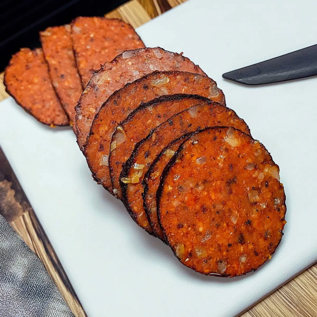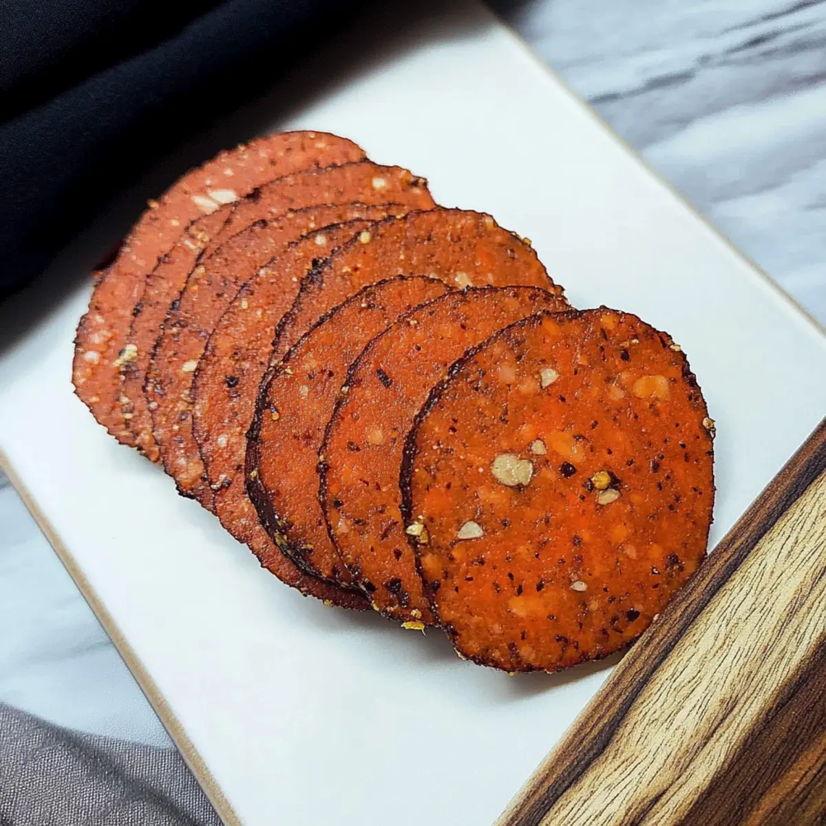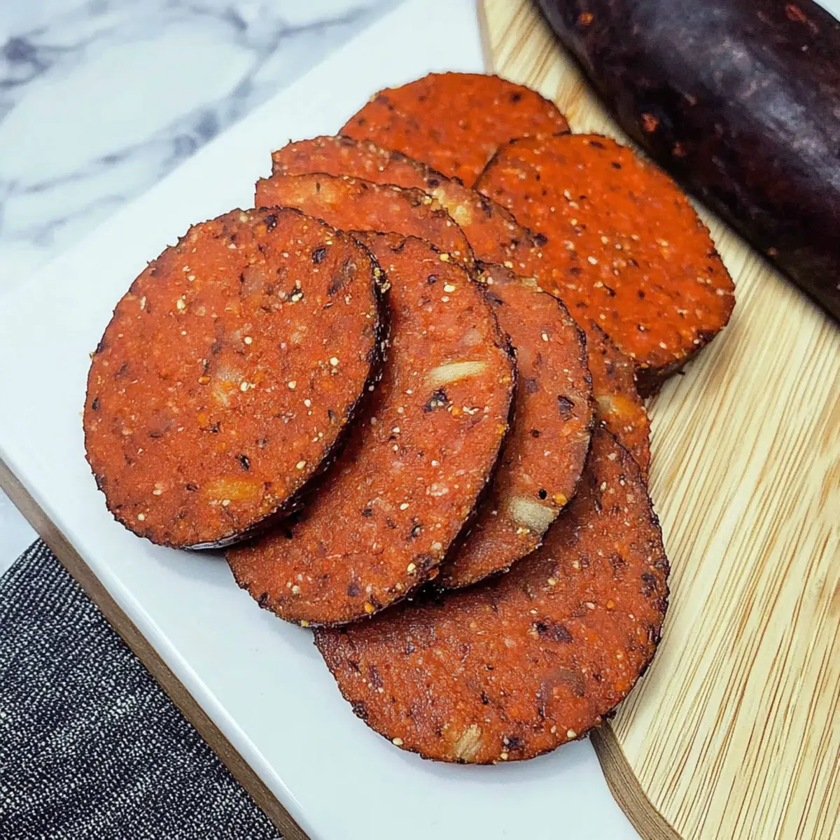 Jump to Recipe Print RecipeAs the aroma of savory spices wafts through my kitchen, I can’t help but feel like I’m conjuring up a culinary magic trick. This Delicious Vegan Salami made with Vital Wheat Gluten is a revelation that will impress even the staunchest meat lovers. With a wonderfully chewy texture that’s astonishingly close to traditional salami, this recipe is not only flavorful but also incredibly easy to whip up. Perfect for adding to sandwiches or serving on a charming charcuterie board, you’ll find that this crowd-pleaser is sure to wow your guests. Plus, it’s a fantastic way to elevate your plant-based meals while keeping the deliciousness front and center. Are you ready to dive into this delightful meat alternative? Why is vegan salami so irresistible? Savory flavors: This vegan salami is infused with a rich blend of spices, making each bite an explosion of taste that even meat lovers will savor. Easy preparation: With a straightforward method, you can create homemade goodness without hours in the kitchen. Meat-like texture: The use of vital wheat gluten gives an amazingly chewy texture that rivals traditional salami, perfect for those cozy sandwiches or charcuterie boards. Customization: Feel free to play around with the ingredients—add your favorite herbs or switch up the heat level for a unique twist! Crowd-pleaser: As an impressive snack or appetizer, this vegan salami is sure to impress your guests at any gathering. If you’re looking for more effortless vegan ideas, check out our other plant-based recipes for inspiration! Vegan Salami Ingredients • Here’s everything you need to create your delicious vegan salami! For the Salami Mixture Vital Wheat Gluten – The main ingredient for a chewy, meat-like texture; no gluten-free substitute available. Cornstarch – Helps create a tender texture; can be omitted if necessary. Onion Powder – Adds depth of flavor; can substitute with garlic powder or shallot powder. Garlic Powder – Enhances savory notes; fresh garlic can be used for a stronger flavor. Vegetable Stock – Provides moisture and umami; swap with water if necessary. Toasted Sesame Oil – Contributes a rich, nutty flavor; regular sesame oil works too. Nutritional Yeast – Adds cheesy flavor and enhances nutrition; can be omitted if unavailable. Smoked Paprika – Provides a wonderful smokiness; sweet or hot paprika can be substituted based on your preference. Red Pepper Flakes – Adds a bit of heat; adjust amount or substitute with black pepper for less spice. Soy Sauce – Supplies saltiness and umami; tamari can be used for a gluten-free option. Tomato Paste – Offers rich depth of flavor; ketchup can be used in a pinch. Maple Syrup – Sweetens and balances flavors; agave syrup can be used as an alternative. Liquid Smoke – Imparts a smoky flavor; can be omitted for a milder taste. Dijon Mustard – Provides tanginess; yellow mustard could be substituted if needed. Pickled Beet Slices – Adds color and subtly sweet flavor; cooked beets can be used if pickled ones aren’t available. Salt and Ground Black Pepper – Enhance overall flavor; adjust according to taste. Enjoy crafting this flavorful vegan salami that truly stands out as a delectable plant-based treat! Step‑by‑Step Instructions for Vegan Salami Step 1: Prepare White Fat Mixture In a large mixing bowl, combine vital wheat gluten, cornstarch, onion powder, and garlic powder. Gradually pour in vegetable stock and toasted sesame oil, mixing until the ingredients come together. Knead the mixture for about 1 minute until it’s elastic and smooth, then cut it into small, even strips to incorporate into your vegan salami later. Step 2: Prepare Salami Mixture In a separate bowl, whisk together vital wheat gluten, nutritional yeast, smoked paprika, onion powder, garlic powder, and red pepper flakes. In a blender, combine sesame oil, soy sauce, tomato paste, maple syrup, liquid smoke, Dijon mustard, pickled beet slices, salt, and ground black pepper, blending until smooth. Fold this wet mixture into the dry ingredients and knead briefly to incorporate. Step 3: Assemble Salami Shape the combined dough into a log, ensuring it has a uniform thickness. Take the prepared white fat strips and gently fold them into the dough, ensuring they are evenly distributed. If desired, roll the log in ground black pepper for an aromatic kick. This step adds a unique texture and appearance to your homemade vegan salami. Step 4: Wrap & Steam Carefully wrap the salami log tightly in parchment paper, followed by aluminum foil to prevent water from seeping in. Set up a steaming pot and steam the wrapped salami over medium heat for 40 minutes. The salami should feel firm to the touch when fully cooked, emitting a delicious aroma that promises a savory taste. Step 5: Cool & Slice Once steaming is complete, remove the salami from the pot and let it cool at room temperature for about 30 minutes. For best results, refrigerate it until fully chilled before slicing. Aim for thin, even slices that reveal the delightful texture and rich flavors of your homemade vegan salami, perfect for sandwiches or charcuterie boards. Expert Tips for Vegan Salami Avoid Tough Texture: Don’t over-knead the dough; just a minute is enough to maintain a chewy consistency. Wrap Tightly: Ensure the salami is wrapped securely in parchment and foil for even steaming and to keep its shape. Weight It Down: To achieve a denser texture, consider placing a weight on the wrapped salami while it cools. Flavor Balance: Adjust seasoning according to your taste—if you prefer a spicier kick, increase the amount of red pepper flakes in your vegan salami. Cool Before Slicing: Allow the salami to chill completely in the fridge for easier slicing and enhancing the flavors! Storage Tips for Vegan Salami Fridge: Store your vegan salami in an airtight container in the refrigerator for up to 1 week to keep it fresh and flavorful. Freezer: For longe
