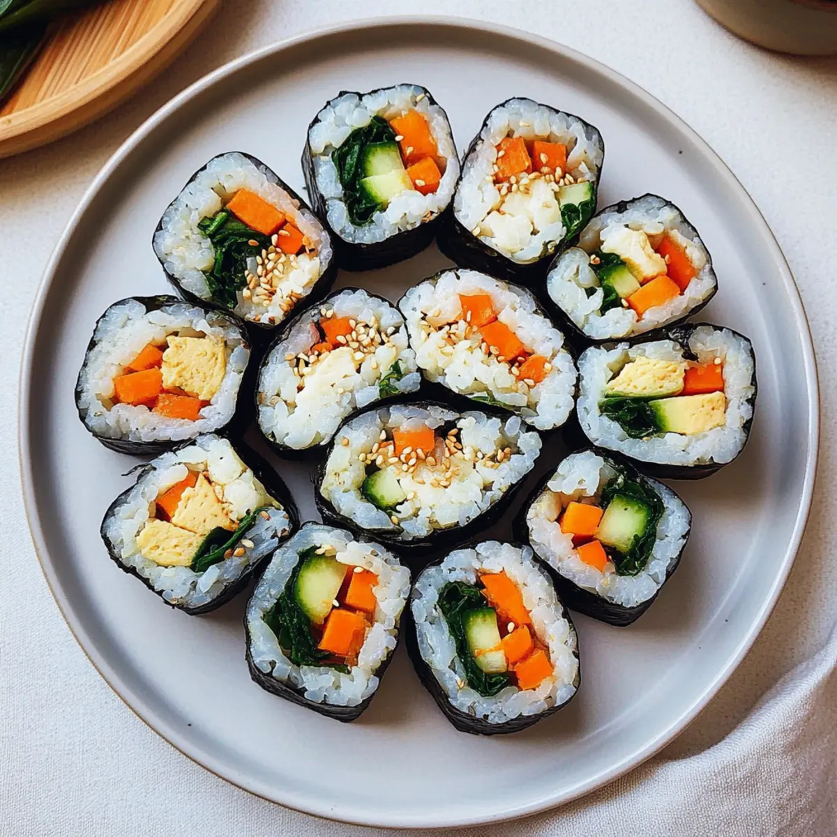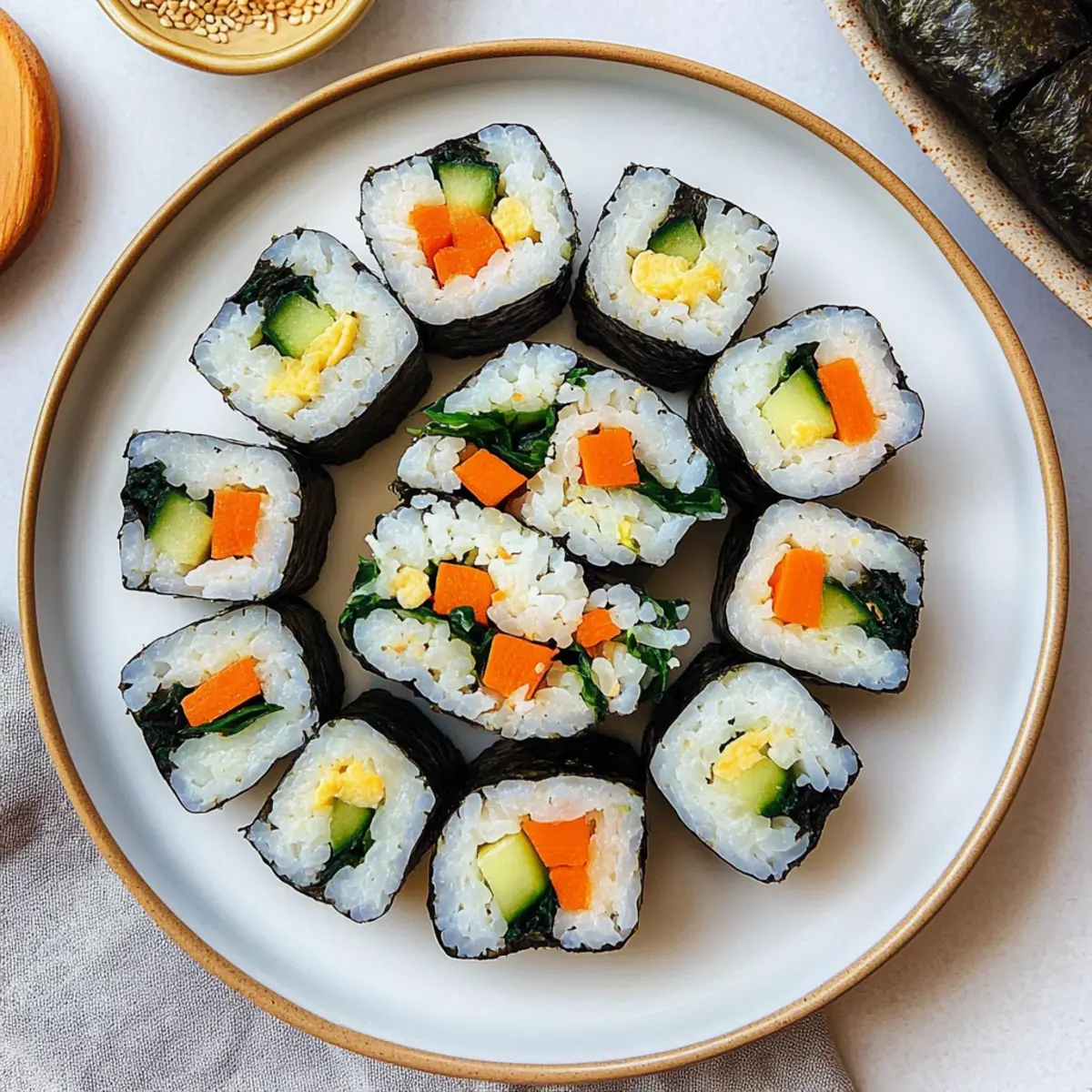 Jump to Recipe Print RecipeAs I rummaged through my fridge one afternoon, I had a mini crisis. Leftover veggies stared back at me, and my usual quick-fix meals just weren’t cutting it anymore. That’s when I remembered the joy of making vegetable gimbap, those delightful Korean rice rolls that are not only beautifully wrapped but also wonderfully customizable! With this recipe for Customizable Vegetable Gimbap Rolls, you’ll discover how to turn your odds and ends into a vibrant, nutritious snack that’s both quick to assemble and full of flavor. These rolls are perfect for meal prep, a fun way to eat your greens, and a fantastic way to impress family or friends with your culinary skills. Are you ready to put those unloved veggies to good use? Let’s roll! Why is Gimbap the Perfect Snack? Delightful Crunch: Each bite of these vegetable gimbap rolls delivers a satisfying texture that’s as fun to eat as it is nutritious. Customizable: Tailor the fillings to fit your preferences or what you have on hand. Whether it’s bell peppers or zucchini, you can make these rolls your own! Quick and Easy: With just a few simple steps, you can assemble a batch in no time—perfect for busy weeknights or last-minute snacks. Packed with Flavor: The combination of sesame oil, fresh veggies, and nori creates a burst of umami that’s incredibly tempting, keeping you coming back for more. Nutrient-Rich: Thanks to the variety of colorful veggies, this gimbap is not only delicious but also high in fiber and vitamins, making it a guilt-free indulgence. Great for Sharing: Roll up a tray of gimbap for your next gathering—they’re not just a meal; they’re a fun experience everyone can enjoy together! For more wholesome options, check out my recipes for Crock Pot Vegetable and Mediterranean Vegetable Casserole. Vegetable Gimbap Ingredients For the Rice • Short-Grain Rice – Use this type for the perfect sticky consistency that helps the rolls hold together. • Sesame Oil – Essential for an authentic flavor profile and adds a lovely sheen to the rice. • Salt – Just a pinch enhances the natural flavors of the rice. For the Fillings • Carrot – Slice into thin strips to add a crunchy sweetness. • Swiss Chard Stems – Provides a nice color and can be swapped for other crunchy veggies. • Cucumber (Persian) – Offers a refreshing crunch; cut lengthwise for easy rolling. • Spinach – Sauté until lightly wilted for a lush, nutrient-packed layer. • Egg (Plant-based option or regular) – Adds protein and richness; can be omitted or substituted with tofu for a plant-based version. For the Wrap • Nori (Seaweed) – The essential wrap for your gimbap; choose high-quality sheets for the best results. For Serving • Sesame Seeds (for garnish) – A nutty touch that enhances the overall flavor—definitely worth it! With these vibrant ingredients in hand, you’re ready to create a delicious Vegetable Gimbap that’s both wholesome and satisfying! Step‑by‑Step Instructions for Customizable Vegetable Gimbap Rolls Step 1: Cook the Rice Begin by rinsing 1 cup of short-grain rice under cold water until the water runs clear, then cook it in a rice cooker according to the manufacturer’s instructions. Once cooked, transfer the rice to a large bowl, drizzle with 2 tablespoons of sesame oil, and add a pinch of salt. Gently mix to combine and keep the rice warm as you prepare the fillings for your vegetable gimbap. Step 2: Prepare the Fillings While the rice cools, prepare your filling ingredients. Peel and julienne 1 medium carrot and cut the Swiss chard stems into long strips for added crunch. Slice a Persian cucumber lengthwise into quarters. If using, beat 1 egg and cook it in a nonstick skillet over medium heat, scrambling gently until set, then cut into thin strips to add richness to your gimbap. Step 3: Sauté the Vegetables Heat 1 tablespoon of olive oil in a skillet over medium heat. Add the julienned carrots and sauté for about 2-3 minutes until they are tender yet still have a bit of crunch. Remove the carrots and add the spinach to the skillet, cooking just until wilted, about 1-2 minutes. Drain any excess moisture before arranging your fillings for the vegetable gimbap assembly. Step 4: Assemble the Gimbap Lay a sheet of nori shiny side down on a bamboo sushi mat. Using wet hands, spread a thin layer of warm rice over approximately 80% of the nori, leaving about an inch at the top free for sealing. Align your prepared fillings—carrots, Swiss chard, cucumber, spinach, and egg—along the edge closest to you, creating a colorful line that runs the length of the rice. Step 5: Roll the Gimbap Starting from the filled edge closest to you, carefully lift the mat and begin rolling the gimbap away from you, tucking the filling in tightly as you go. Apply gentle pressure to ensure the roll is compact without squishing the ingredients. Continue rolling until you reach the exposed edge of the nori; dampen it slightly to help it seal securely. Step 6: Finish and Serve Once rolled, rub the outside of the gimbap with a drizzle of sesame oil for added flavor and sheen. Using a sharp, wet knife, slice the roll into 8-10 equal pieces for the perfect serving size. Garnish each piece with a sprinkling of sesame seeds, and serve your delicious vegetable gimbap with soy sauce or gochujang for a delightful dipping experience. Expert Tips for Vegetable Gimbap Sticky Rice: Ensure the rice is cooked properly; it should be sticky enough to hold the rolls together without falling apart. Adjust water levels if needed. Cutting Technique: Use a sharp knife to slice your gimbap, and always wet the knife before cutting to prevent sticking and create clean edges. Fresh Ingredients: For the best flavor in your vegetable gimbap, use fresh vegetables. Avoid overcooked fillings which can become mushy and lose their crunch. Nori Quality: Choose high-quality nori sheets for a better flavor and texture. Lightly toas