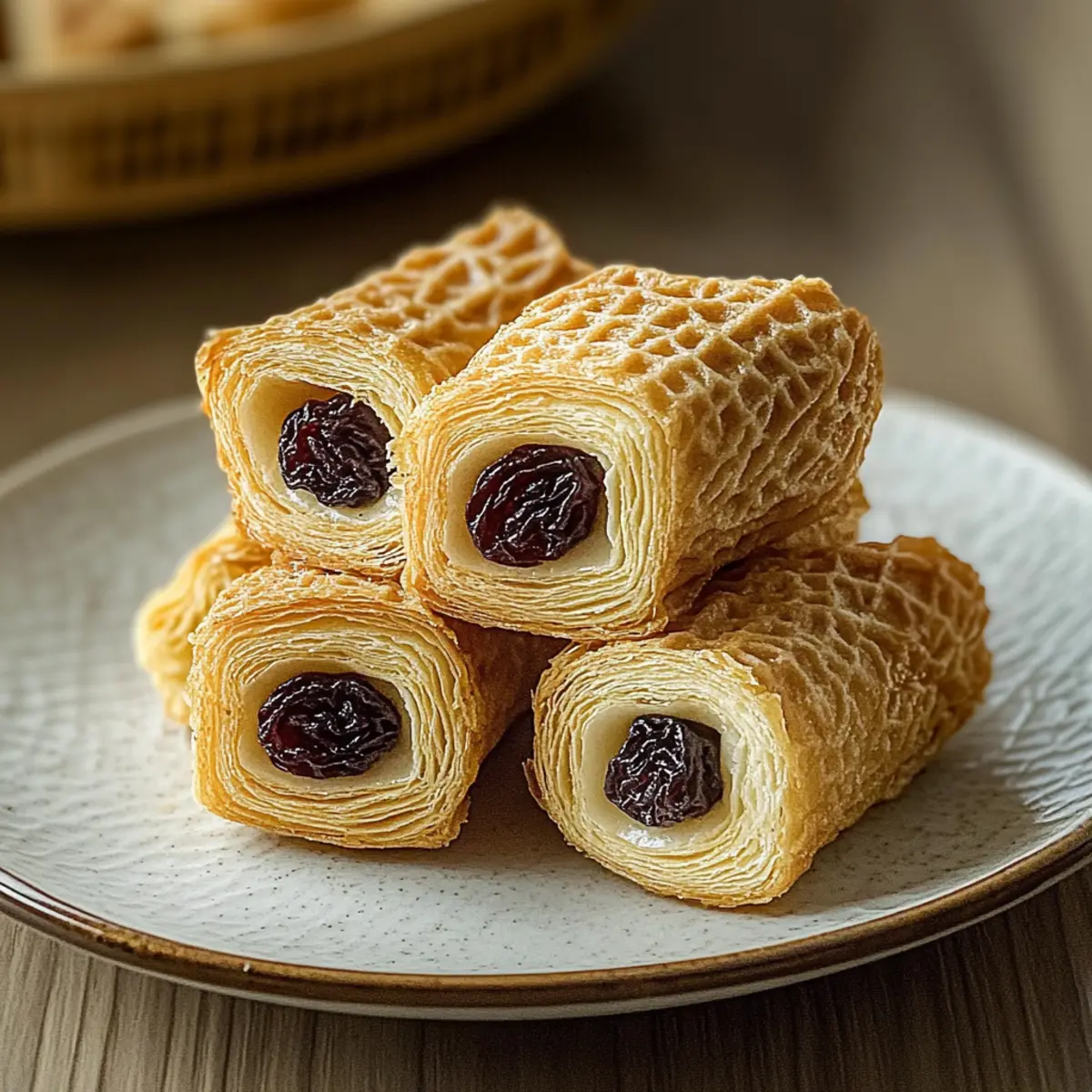 Jump to Recipe Print RecipeAs I savored that first bite, the delightful crunch of the crispy wafer rolled around the sweet, chewy raisins—it struck me how such a simple snack could transcend the ordinary. These Wafer Rolls with Raisins are not only incredibly easy to make, but they’re also wonderfully customizable to suit any palate. Whether you’re preparing a quick treat for the kids or an elegant addition to your dessert platter, these rolls are sure to impress. Plus, they can cater to various diets—think vegan, gluten-free, or even healthier alternatives! Are you ready to create a snack that’s sure to charm both young and old? Let’s dive into this fun recipe and explore the endless possibilities together! Why are Wafer Rolls with Raisins Special? Uniquely Delicious: The combination of crispy wafer and sweet raisin filling creates a delightful textural contrast that’s simply irresistible. Effortless Preparation: With just a few ingredients, these rolls come together quickly, making them a perfect solution for those busy days. Customizable Flavors: Feel free to swap raisins for other dried fruits like cranberries or apricots, catering to everyone’s taste! You might also want to check out our recipe for Moist Strawberry Frosting for a delightful twist on your next dessert. Healthier Options: Easily transform this treat into a vegan friendly snack by using plant-based butter, ensuring it fits your dietary preferences. Crowd-Pleaser: These wafer rolls are fantastic for gatherings—pair them with tea or coffee for a delightful snack experience that keeps everyone coming back for more! Make-Ahead Convenience: Prepare them in advance, saving you time while ensuring they stay fresh and ready to serve. Wafer Rolls with Raisins Ingredients • A collection of ingredients for a delicious treat! For the Wafer Rolls Wafer Sheets – Use a package of standard wafer sheets for the best crispness and structure in your rolls. Raisins – These provide natural sweetness and a chewy texture; feel free to substitute with other dried fruits like cranberries or apricots for a unique twist. Powdered Sugar – Sweetens the filling without a gritty texture; consider using brown sugar for a caramel-like flavor. Unsalted Butter – Adds creaminess and richness; can be swapped for a vegan butter alternative if desired. Vanilla Extract – Enhances the overall flavor profile; this ingredient is optional but highly recommended for a deeper taste. Milk (optional) – Adjusts the filling consistency; if your mixture is too thick, a splash more milk can create a creamier texture. Salt – Just a pinch helps to balance the sweetness in these delightful Wafer Rolls with Raisins. Step‑by‑Step Instructions for Wafer Rolls with Raisins Step 1: Prep the Filling Begin by softening the unsalted butter in a mixing bowl for easier blending. Add in the powdered sugar, vanilla extract, and a pinch of salt, then mix thoroughly until the filling is smooth and creamy, which should take about 2-3 minutes. The texture should be fluffy and well-combined. Step 2: Incorporate the Raisins Once your filling is ready, gently fold in the raisins until they are evenly distributed throughout. This should take about 1-2 minutes. The sweet raisins will add a delightful chewiness to the filling, making your Wafer Rolls with Raisins even more enjoyable. Step 3: Assemble the Rolls Take a wafer sheet and place it on a clean surface. Using a spatula, spread a generous layer of the prepared filling over the entire surface of the wafer. Carefully roll the sheet tightly from one end to the other, ensuring no filling spills out. Repeat this process for each wafer sheet until all the filling is used. Step 4: Chill the Rolls Once assembled, place the rolled wafer treats in the refrigerator for about 30 minutes. This will allow the filling to set and the rolls to firm up slightly. You’ll know they’re ready when they feel more solid to the touch and are easy to slice into portions. Step 5: Slice and Serve After chilling, remove the rolls from the fridge and use a sharp knife to slice them into bite-sized pieces, about 1-2 inches thick. The crispy exterior should contrast beautifully with the sweet, chewy filling, making your Wafer Rolls with Raisins an irresistible treat for any occasion. Step 6: Store Properly If you have leftovers, store them in an airtight container in a cool place for up to a week. This ensures they stay fresh and ready for snacking. You can enjoy them chilled or let them come to room temperature before serving, enhancing their delightful textures. What to Serve with Wafer Rolls with Raisins? As you savor the crispy goodness of these delightful treats, consider these perfect accompaniments that will elevate your snacking experience. Creamy Vanilla Ice Cream: This rich, creamy treat adds a contrasting coldness that balances the warm, crispy rolls perfectly. Fresh Fruit Salad: A vibrant mixture of seasonal fruits brings a burst of freshness to your platter, complementing the sweetness of the rolls. Spiced Chai Tea: The warming spices in chai create a harmonious blend with the sweet raisin filling, enhancing their flavors during a cozy afternoon snack. Dark Chocolate Dipping Sauce: This indulgent dipping option adds richness and a touch of decadence that pairs wonderfully with the crispy texture. Whipped Coconut Cream: Light and airy, this alternative to traditional whipped cream will elevate your wafer rolls with a tropical flair. Nutty Trail Mix: A crunchy blend of nuts and seeds provides a satisfying contrast to the chewy filling, perfect for those who enjoy a mix of textures. Milo or Hot Chocolate: Serve with a glass of warm Milo or hot chocolate for a delightful, comforting pairing that appeals to both kids and adults alike. How to Store and Freeze Wafer Rolls with Raisins Room Temperature: Store leftover wafer rolls in an airtight container at room temperature for up to 1 week to maintain their crispness and f