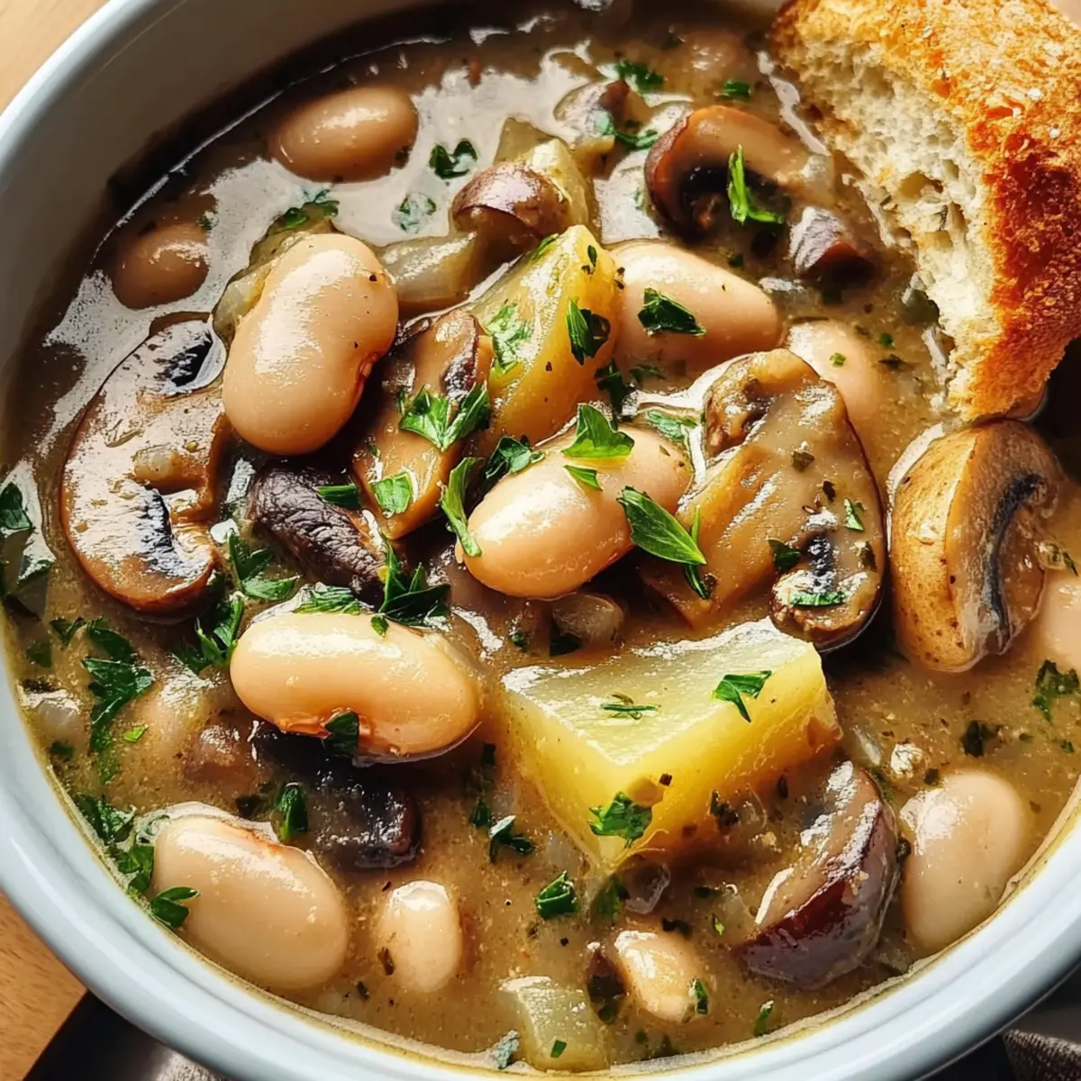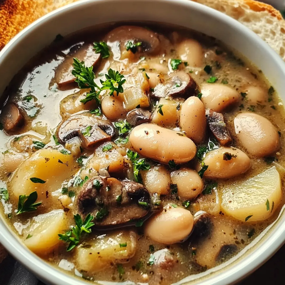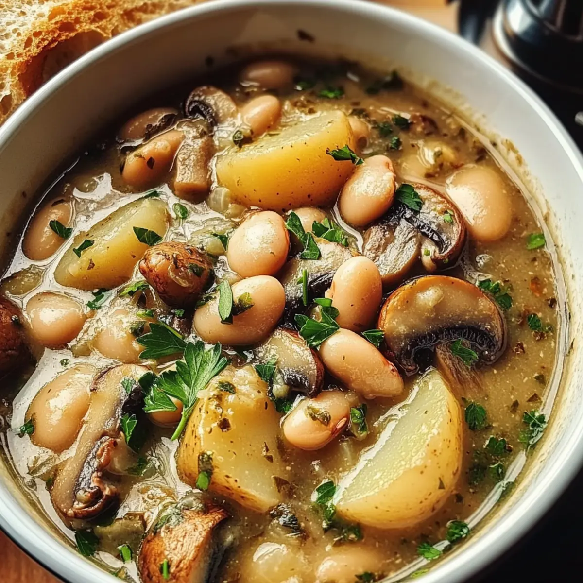 Jump to Recipe Print RecipeAs I watched the rain pour down outside, I couldn’t help but crave something warm and satisfying. That’s when I decided to whip up this Cozy Vegan White Bean Mushroom Stew. With its hearty blend of creamy white beans, earthy mushrooms, and tender baby potatoes, it’s the quintessential comfort food for those chilly evenings. Not only is this dish incredibly easy to make in just one pot, but it’s also vegan and gluten-free, perfect for everyone at the table. Plus, you’ll love how nutritious it is, keeping you energized and content! Ready to discover how to bring this cozy masterpiece to life? Let’s dive in! Why is this stew the ultimate comfort food? Hearty and satisfying, this White Bean Mushroom Stew warms you from the inside out, making it perfect for chilly nights. One-Pot Wonder: With minimal cleanup, you can focus on enjoying the meal rather than stressing over dishes. Nutrient-Pack: Filled with fiber-rich white beans and earthy mushrooms, it’s a healthy choice without sacrificing flavor. Customizable: Adapt this stew by adding seasonal veggies or experimenting with different mushroom varieties, keeping mealtime exciting. Crowd-Pleaser: Ideal for family dinners or cozy gatherings, everyone will appreciate a bowl of this comforting stew! White Bean Mushroom Stew Ingredients For the Stew • Vegan Butter – Adds richness; substitute with olive oil for a lighter option. • Onion – Provides aromatic base flavors; use shallots or leeks for a different taste. • Mushrooms (any combination) – Contributes umami and texture; shiitake and cremini work beautifully together. • Dried Thyme and Rosemary – Imparts herbal notes that elevate the stew; fresh herbs may be used at three times the amount. • Sea Salt and Pepper – Essential for flavor enhancement; adjust to your taste preferences. • Garlic – Brings depth to the dish; fresh minced garlic is best for maximum aroma. • Cornstarch – Thickens the stew for a creamy consistency; can swap with arrowroot powder if needed. • Tamari – Adds a savory, soy-like flavor; can be replaced with soy sauce or coconut aminos. • Dijon Mustard – Provides a tangy flavor to balance richness; omit if you have a mustard sensitivity. • Vegetable Broth – The base liquid; any vegetable stock works well here. • Baby Potatoes – Contributes heartiness; consider using Yukon gold or red potatoes. • White Beans – A nutritional powerhouse offering protein; canned or cooked dry beans are both great choices. • Dairy-Free Milk – Adds creaminess; opt for almond milk, oat milk, or coconut milk for a luscious texture. For Serving • Fresh Parsley – Garnish for a pop of freshness; chopped just before serving enhances presentation. • Crusty Bread – Ideal for dipping; serves as a delightful accompaniment to soak up the stew. This White Bean Mushroom Stew is not only a comforting dish but also a fantastic way to gather around the table with loved ones. Enjoy crafting this hearty meal! Step‑by‑Step Instructions for Cozy Vegan White Bean Mushroom Stew Step 1: Melt the Vegan Butter In a large pot or Dutch oven, melt 2 tablespoons of vegan butter over medium heat. Allow it to foam slightly, creating a rich base for your Cozy White Bean Mushroom Stew. This should take about 1-2 minutes. Once melted, the butter will be ready to embrace the aromatic flavors of the onions. Step 2: Sauté the Onion Add 1 diced onion to the pot, stirring occasionally, and sauté until softened and translucent, roughly 3-5 minutes. The onion should become fragrant and glistening, creating a beautiful foundation for your stew. This stage adds depth to your stew that everyone will appreciate. Step 3: Brown the Mushrooms Next, incorporate 8 ounces of sliced mushrooms along with 1 teaspoon each of dried thyme and rosemary, plus sea salt and pepper to taste. Cook for about 7-10 minutes, stirring occasionally, until the mushrooms are thoroughly browned and have released their moisture. A lovely earthy aroma will fill your kitchen, signaling the perfect cooking progress. Step 4: Add Garlic Stir in 3 minced garlic cloves and cook for an additional minute, allowing the garlic to become fragrant. This will enhance the overall flavor profile of your Cozy White Bean Mushroom Stew. Be sure to stir continuously to prevent the garlic from burning, as overcooked garlic can lose its delightful aroma. Step 5: Incorporate Cornstarch and Flavor Enhancers Sprinkle in 2 tablespoons of cornstarch, mixing it thoroughly into the mushroom mixture to create a thickening agent. Next, pour in 2 tablespoons of tamari and 1 tablespoon of Dijon mustard. Stir well until everything is combined, as this will create a savory coating for the stew’s heartiness. Step 6: Add Liquid and Potatoes Pour in 4 cups of vegetable broth and add 2 cups of baby potatoes, cut in halves. Bring the mixture to a vigorous boil over medium-high heat. Once boiling, reduce the heat to low and let it simmer uncovered for 15-20 minutes. This will allow the potatoes to become tender while infusing flavors throughout the stew. Step 7: Mix in White Beans and Milk After the potatoes are tender, gently fold in 2 cans (about 3 cups) of drained white beans and 1 cup of dairy-free milk. Let the stew simmer uncovered for another 10-15 minutes, adjusting the seasoning as needed. This step enhances the creaminess of your Cozy White Bean Mushroom Stew, making it even richer and more delightful. Step 8: Serve and Garnish Once the stew has thickened to your liking, ladle it into bowls while it’s warm. Garnish with fresh parsley and a sprinkle of black pepper for a pop of color and flavor. This final touch highlights the vibrant ingredients and makes your Cozy White Bean Mushroom Stew inviting and ready to enjoy. What to Serve with Cozy White Bean Mushroom Stew As you cozy up with this heartwarming stew, think about how to elevate your meal to a delightful dining experience. Crusty Bread: