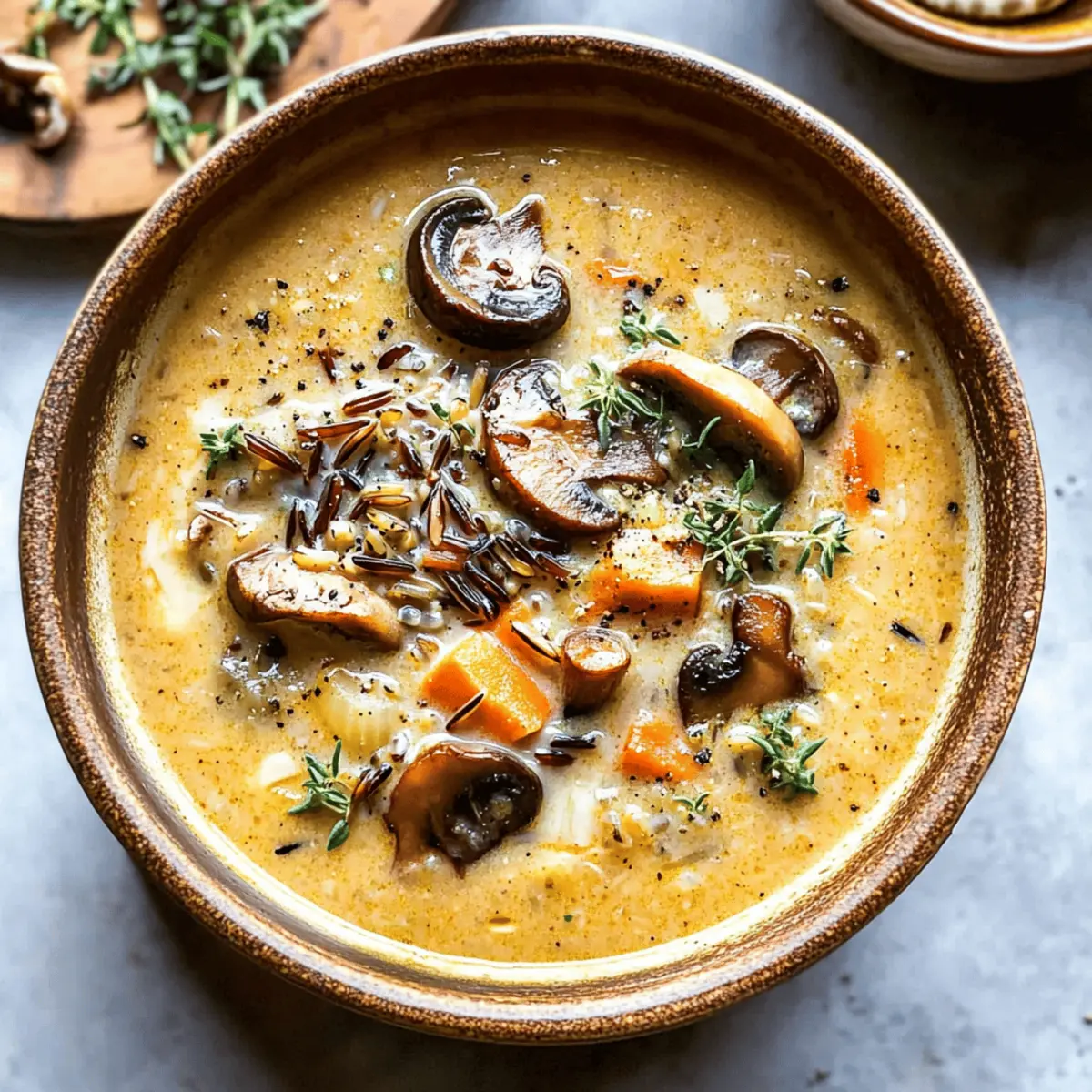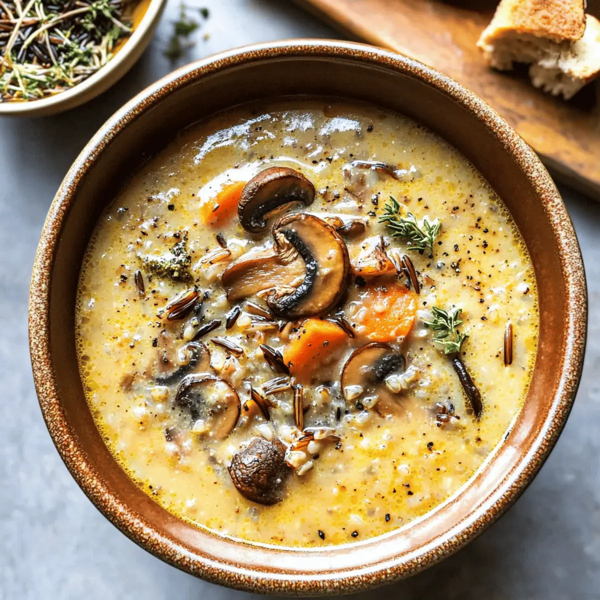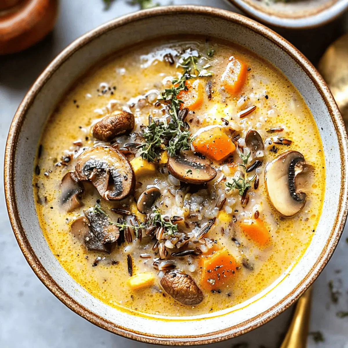 Jump to Recipe Print RecipeAs the chill in the air begins to settle in, I often find myself longing for a steaming bowl of comfort that warms not just the body, but the soul. This Hearty Wild Rice and Mushroom Soup perfectly fits that bill. It’s a delightful blend of meaty mushrooms and aromatic vegetables, simmered in a creamy base that’s truly comforting. Not only is this vegetarian soup a nutritious choice, made entirely from scratch, but it’s also a time-saver, ready in under an hour! Whether you’re looking to impress guests or simply treat yourself to a cozy night in, this recipe promises to become a beloved staple. Ready to let the rich aromas fill your kitchen? Let’s journey together into the heart of this warming dish! Why is this soup a must-try? Comforting Warmth: There’s nothing like a warm bowl of soup on a chilly evening to soothe the soul. Hearty Ingredients: The combination of wild rice and rich mushrooms creates a filling meal that leaves you satisfied without feeling heavy. Easy Preparation: With simple steps and everyday ingredients, this hearty wild rice and mushroom soup can be whipped up in under an hour. Versatile Pairing: Enjoy it alone or complement it with crusty bread or a fresh salad, like a Shredded Brussels Salad for a delightful meal. Nutritionally Packed: Loaded with vitamins and minerals, this vegetarian delight is both nourishing and delicious, making it a guilt-free treat for any occasion! Wild Rice and Mushroom Soup Ingredients • Gather these essentials for a hearty meal! For the Soup Base Olive Oil – Provides a smooth base and enhances flavor; substitute with avocado oil for a different taste. Unsalted Butter – Adds richness and creaminess; use vegan butter for a dairy-free version. Yellow Onion – Brings sweetness and depth to the soup; shallots can be used for a milder flavor. Carrots (3/4 cup, finely chopped) – Adds natural sweetness and color; parsnips can offer a unique flavor. Celery (1/2 cup, finely chopped) – Contributes aromatic flavor; consider adding extra carrots or another root vegetable if needed. For the Mushroom & Rice Baby Bella (Cremini) Mushrooms (8 oz, sliced) – Provides a meaty texture and umami flavor; substitute with shiitake or button mushrooms. Garlic (4 cloves, minced) – Adds a robust taste; garlic powder can be used if fresh isn’t available. Dry Wild Rice Blend (1 cup) – Delivers a nutty flavor and hearty texture; substitute with brown rice or quinoa, adjusting cooking times accordingly. For Seasoning Poultry Seasoning (1 Tbsp) – A blend of herbs that flavors the soup; try Herbs de Provence as a substitute. Kosher Salt (1 tsp) – Enhances the overall flavor; adjust to taste. Black Pepper (1/2 tsp) – Adds warmth and seasoning; use white pepper for a milder taste. For Creaminess Lower Sodium Vegetable Broth (4 cups) – Forms the soup’s base and contributes flavor; homemade broth or low-sodium chicken broth can be used if not vegetarian. Heavy Cream (2/3 cup) – Adds creaminess; substitute with cashew cream for a dairy-free option. Parmesan Cheese (1/3 cup, finely grated) – Introduces a savory, salty depth; omit for a vegan option or substitute with nutritional yeast. Embrace the joy of cooking with this Wild Rice and Mushroom Soup recipe that warms both body and soul! Step‑by‑Step Instructions for Wild Rice and Mushroom Soup Step 1: Prepare the Cream To start, measure out 2/3 cup of heavy cream and let it sit at room temperature. This will help it mix smoothly into your Wild Rice and Mushroom Soup later. While you wait, gather all your other ingredients and ensure they’re within easy reach. Step 2: Sauté the Base Vegetables In a large stockpot, heat 2 tablespoons of olive oil and 2 tablespoons of unsalted butter over medium-high heat. Once hot, add 1 finely chopped yellow onion, 3/4 cup of finely chopped carrots, and 1/2 cup of finely chopped celery. Sauté these for about 8 minutes, stirring occasionally until the vegetables are softened and fragrant. Step 3: Incorporate Mushrooms and Garlic Next, stir in 8 ounces of sliced baby Bella mushrooms and 4 minced garlic cloves into the pot. Cook for 6-8 minutes, allowing the mushrooms to release their moisture and turn golden brown. This will impart a rich umami flavor to your Wild Rice and Mushroom Soup. Step 4: Toast the Wild Rice Add 1 cup of dry wild rice blend to the pot, stirring it into the mixture for 1-2 minutes. This process helps to toast the rice, enhancing its nutty flavor. Then, sprinkle in 1 tablespoon of poultry seasoning, 1 teaspoon of kosher salt, and 1/2 teaspoon of black pepper to season your soup. Step 5: Add the Broth and Simmer Pour 4 cups of lower sodium vegetable broth into the pot, stirring well to combine all the ingredients. Increase the heat to bring the mixture to a low boil. Once boiling, reduce the heat to low, cover the pot, and let it simmer for 45-60 minutes until the wild rice is tender and the flavors meld beautifully. Step 6: Stir in the Cream and Cheese After simmering, remove the lid and stir in the prepared heavy cream and 1/3 cup of finely grated Parmesan cheese. Mix thoroughly until the cheese is melted and incorporated, creating a creamy texture in your Wild Rice and Mushroom Soup. Step 7: Serve and Garnish Ladle the hot soup into bowls, garnishing with fresh herbs or extra cheese if desired. Enjoy this comforting dish right away, savoring every spoonful of the rich flavors and hearty ingredients. Make Ahead Options Preparing your Wild Rice and Mushroom Soup in advance makes dinner stress-free and ensures a cozy meal is just moments away! You can chop your vegetables and measure out your spices up to 24 hours ahead, storing them in airtight containers in the fridge to maintain their freshness. The wild rice can also be cooked in advance, which will help save time during meal prep. When you’re ready to serve, simply sauté the vegetables, add the pre-cooked rice and broth, and follow the fi
