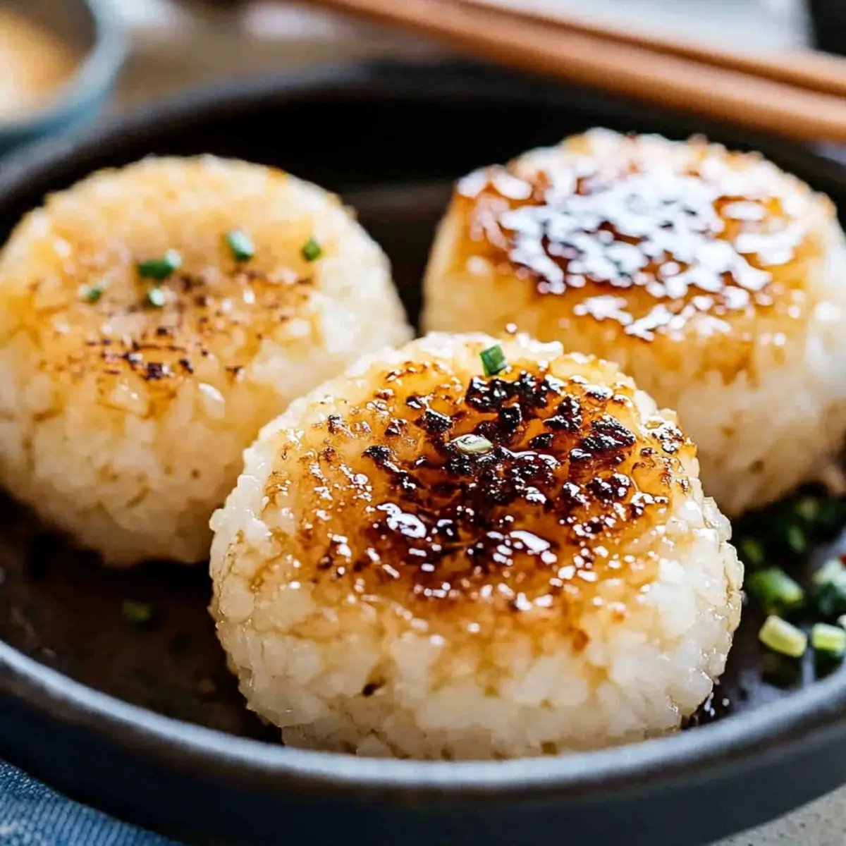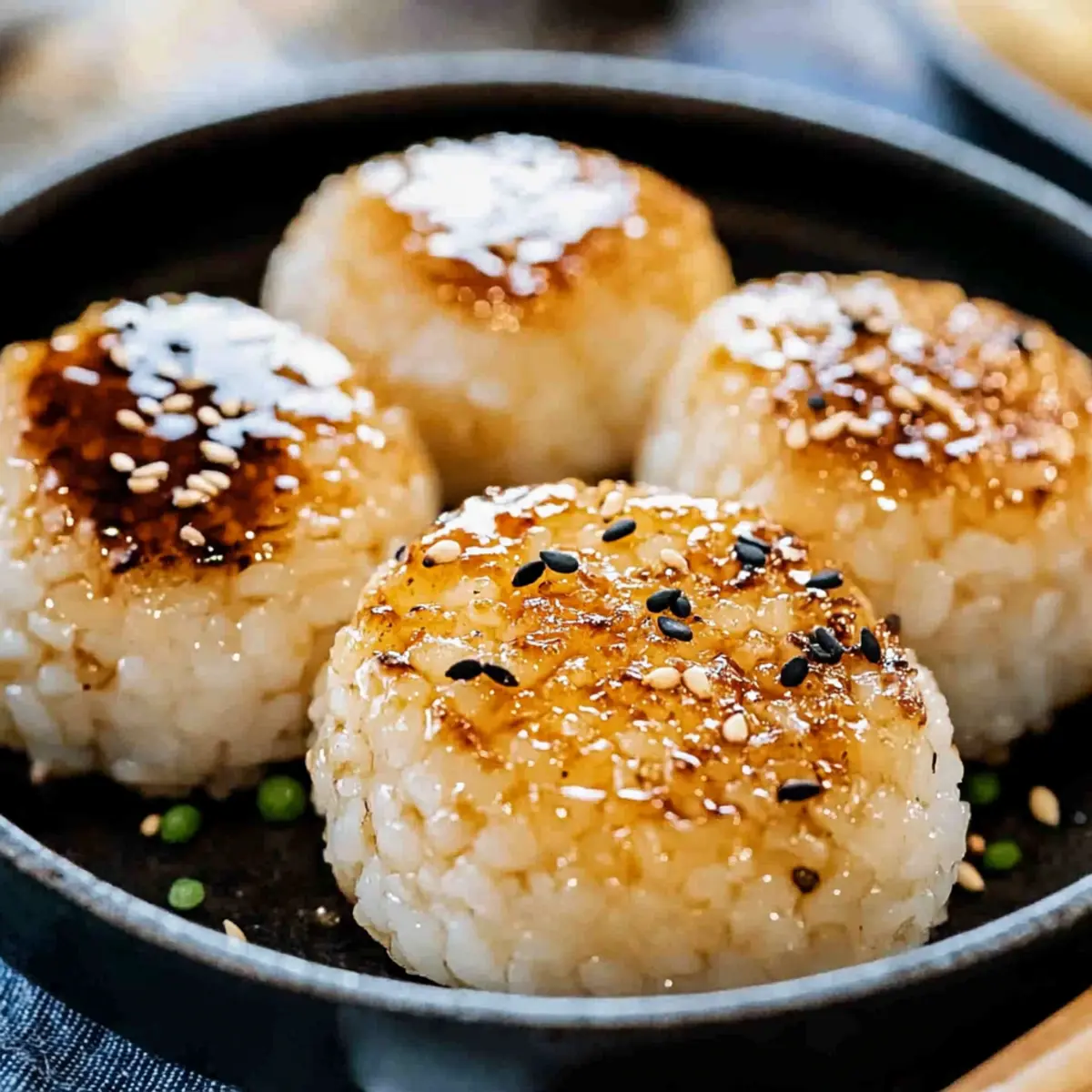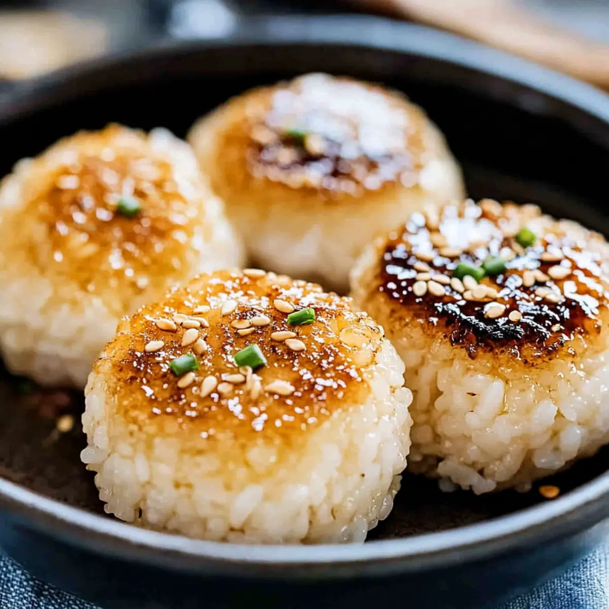 Jump to Recipe Print RecipeAs I stood by the grill, the delightful aroma of Yaki Onigiri danced through the air, immediately transporting me back to the bustling streets of Japan. These irresistible grilled rice balls—crispy on the outside and warm on the inside—offer an accessible yet authentic taste of Japanese cuisine right in your kitchen. Perfect as a wholesome snack or a flavorful side dish, they come with tempting options like miso butter and soy sauce, ensuring there’s a delicious variation for everyone. What makes these Yaki Onigiri such a hit is their quick prep time and versatility; you can customize them to suit any palate and make them a fun family activity. Are you ready to experience this delightful twist on rice? Let’s dive into making your own! Why Are Yaki Onigiri So Popular? Satisfying, Crunchy Texture: The combination of a crispy exterior and fluffy rice inside creates a mouthwatering bite that’s hard to resist. Endless Flavor Varieties: Choose between delicious miso butter or savory soy sauce, or get creative with your favorite fillings for a personalized twist! Quick and Easy: Perfect for busy days, these grilled rice balls can be prepared in no time, making them a staple for any home cook. Fun Family Activity: Get everyone involved in shaping, grilling, and customizing these onigiri—your kids will love it! Healthy and Wholesome: Made with simple ingredients, Yaki Onigiri is a nutritious snack that keeps you fueled without the guilt. Culinary Adventure: Explore the delightful world of Japanese cuisine from your own kitchen, and serve these wonderful treats alongside a warm bowl of miso soup for an authentic experience! Yaki Onigiri Ingredients For the Rice • Short Grain Rice – Essential for achieving that perfect sticky and fluffy texture; Japonica “Koshihikari” is best. • Water – Crucial for cooking the rice to the right consistency. For the Miso Butter Mixture • Miso – Adds rich umami for flavor; can substitute with tahini for a non-soy option. • Mirin – Sweet rice wine that enhances the flavor; use sugar or honey as a replacement. • Sake – Deepens the flavor; can be skipped if you don’t have it. • Sugar – Balances the flavors in the miso mixture; maple syrup or honey are good alternatives. • Butter – Provides delicious richness and helps achieve that crispy exterior when grilling. For the Soy Sauce Mixture • Soy Sauce – Essential for the savory soy-flavored onigiri; opt for gluten-free if needed. • Vegetable Oil – Used for grilling to prevent sticking; canola or olive oil work wonderfully. For Garnishing • Chives – Optional for added flavor and color; fresh herbs enhance the presentation. • Sesame Seeds – Adds a lovely crunch; can replace with everything bagel seasoning for extra flavor. For Grilling • Everything Bagel Seasoning – Optional for a savory twist; use sesame seeds for a simpler option. Get ready to create your mouthwatering Yaki Onigiri that’s perfect for snacking or enjoying as part of your meal! Step‑by‑Step Instructions for Yaki Onigiri Step 1: Cook the Rice Begin by rinsing 2 cups of short grain rice under cold water until the water runs clear, then soak it for 30 minutes. Drain and transfer the rice to a rice cooker, adding the appropriate amount of water according to your cooker’s instructions. Cook until the rice is fluffy and sticky, which typically takes about 30 minutes, ensuring it’s warm as you proceed to shape the onigiri. Step 2: Prepare Miso Mixture In a medium mixing bowl, combine 2 tablespoons of miso, 1 tablespoon of mirin, 1 tablespoon of sake (optional), and 1 teaspoon of sugar, blending with a fork until smooth. Integrate 1 tablespoon of softened butter to enhance the rich, umami taste. Set aside this miso mixture while you prepare the rice balls, ensuring it stays spreadable and ready for application. Step 3: Shape the Rice Once the rice is fully cooked, let it cool slightly for ease of handling. Use damp hands or cling wrap to prevent sticking, and divide the rice into 6 equal portions. Shape each portion firmly into a triangle or oval form, pressing gently to ensure they hold together. This step is crucial for achieving the desired texture of your Yaki Onigiri prior to grilling. Step 4: Grill (Miso Flavor) Heat a cast iron skillet over medium heat and add a dollop of butter to melt. Once the butter is sizzling, carefully place the shaped rice balls in the skillet. Brush the tops generously with the prepared miso mixture and grill for about 3-4 minutes on each side, checking for a crispy golden-brown exterior. This creates a delightful contrast to the soft rice inside. Step 5: Grill (Soy Sauce Flavor) For a savory twist, wipe the skillet clean, then add a splash of vegetable oil to coat the surface. Place the rice balls back in and brush each with soy sauce, grilling them for 3-4 minutes on each side. Ensure they develop a nice char while also adding a hint of rich flavor. Adding a small pat of butter in the end will enhance the crispiness and flavor even more. Step 6: Garnish and Serve Once grilled to perfection, remove your Yaki Onigiri from the skillet, allowing them to cool slightly. Garnish with a sprinkle of sesame seeds, chives, or everything bagel seasoning for added flavor and visual appeal. Arrange the rice balls on a serving platter, and prepare to enjoy this tasty and versatile Japanese snack with family or friends! What to Serve with Crispy Grilled Yaki Onigiri? Elevate your meal experience with delightful pairings that beautifully complement these crispy, flavorful rice balls. Miso Soup: A classic pairing, the warm, umami-filled broth enhances the flavors of Yaki Onigiri, creating a comforting balance. Fresh Cucumber Salad: Crisp and refreshing, this salad adds a cool contrast to the warm, grilled rice, making your meal feel light and vibrant. Pickled Vegetables: The tangy crunch of pickled veggies brightens the dish and complements the sub