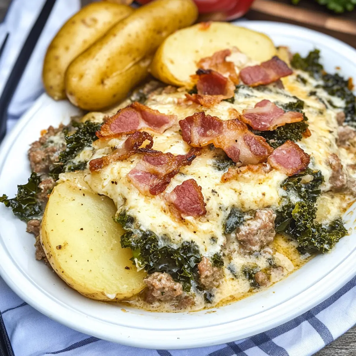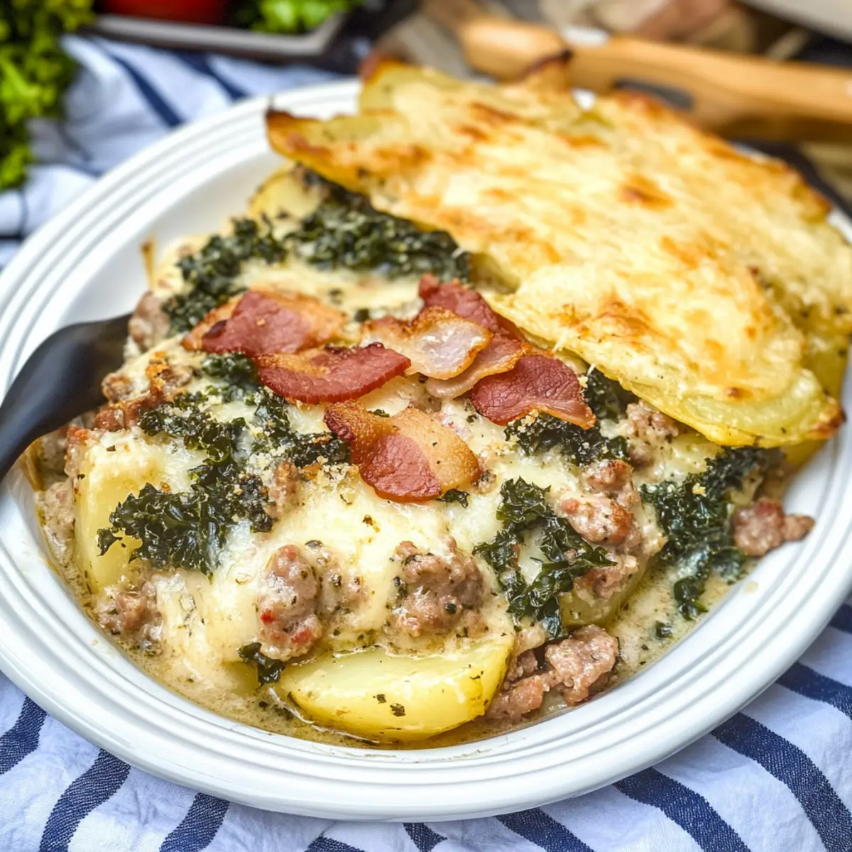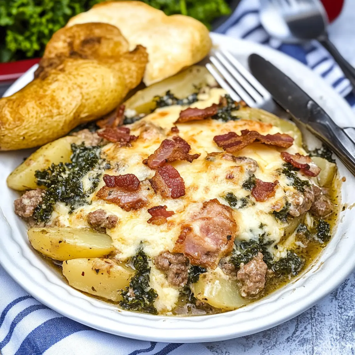 Jump to Recipe Print RecipeAs I ladled the creamy broth from my favorite Italian Zuppa Toscana soup into a baking dish, a wave of nostalgia swept over me. This Zuppa Toscana Casserole elegantly transforms a classic into a hearty dinner that’s sure to impress the family. Packed with tender layers of potatoes, savory Italian sausage, crispy bacon, and nutritious kale, every bite is a warm hug on a chilly evening. Not only is it a satisfying comfort food, but it’s also incredibly easy to prepare, making it a weeknight hero for busy home chefs. Plus, leftovers? They taste even better the next day! Are you ready to bring a bit of Italy to your kitchen with this delightful casserole? Why You’ll Crave This Casserole Hearty, satisfying meal: This Zuppa Toscana Casserole packs a punch with layers of creamy potatoes and flavorful sausage, making it perfect for any family dinner. Easy preparation: With simple steps, even novice cooks can master this dish with confidence. Crowd-pleaser: It’s an instant hit with friends and family, ideal for gatherings or cozy weeknights alike. Comforting flavors: Reminiscent of the classic soup, this dish warms your soul as much as your stomach. Versatility at its finest: Feel free to swap out ingredients or add veggies—like bell peppers or mushrooms—to suit your taste. For more comforting recipes, check out my Tater Tot Casserole or the delicious Dorito Casserole. Zuppa Toscana Casserole Ingredients For the Casserole Bacon (8 oz) – Adds crispy texture and savory flavor. Reserve 1/4 cup bacon grease for cooking. Ground Italian Sausage (1 lb) – Provides rich, meaty flavor. Cooked, crumbled, and drained before layering. Russet Potatoes (7 cups, thinly sliced) – Forms the base and adds bulk to the casserole. Even layering is key for even cooking. White Onion (1 small, peeled & diced) – Enhances flavor with mild sweetness. Any onion variety can be used if white is unavailable. Garlic Paste (2 tbsp) – Adds aromatic depth. Fresh minced garlic can be a substitute. Kale (6 cups, chopped and stems removed) – Provides nutrition and a pop of color. Can substitute with spinach if preferred. Flour (1/2 cup) – Thickens the cream sauce. Cornstarch can be used as a gluten-free alternative. Chicken Broth (4 cups) – Base for the sauce, adds flavor. Vegetable broth can be used for a vegetarian option. Heavy Whipping Cream (1-1.5 cups) – Adds richness and creaminess. Milk can be used for a lighter version, though it will be less creamy. Egg (1 large, beaten & tempered) – Helps stabilize the sauce. Omit for a dairy-free option. Salt & Pepper – Enhances overall flavor to taste. Parmesan Cheese (1.5 cups, divided) – Adds savory flavor and a cheesy topping. Mix of mozzarella can enhance cheesiness. Step‑by‑Step Instructions for Zuppa Toscana Casserole Step 1: Preheat the Oven Begin by preheating your oven to 400°F (200°C). This will ensure a perfectly baked Zuppa Toscana Casserole, where all flavors meld beautifully. While the oven warms up, gather all your ingredients to streamline the cooking process, making it a breeze to layer your casserole once the oven is ready. Step 2: Layer the Potatoes In a 9×13″ baking dish, start by evenly layering the thinly sliced russet potatoes to create a sturdy base. Take your time to spread them out, ensuring they cover the bottom completely. This layering is key to providing that hearty foundation for the comforting flavors of the Italian sausage and bacon to come. Step 3: Add the Meat Next, spread the cooked and crumbled Italian sausage and crispy bacon over the potato layer. Make sure to distribute the meat evenly, so every bite of your Zuppa Toscana Casserole has a delicious bite of both sausage and bacon. This mix enhances the savory profile, creating a mouthwatering experience. Step 4: Sauté the Aromatics In the skillet with the reserved bacon grease, add the diced white onion and garlic paste. Sauté this mixture over medium heat for 2-3 minutes, stirring occasionally, until the onions are softened and translucent. The aroma will fill your kitchen, signaling the deliciousness that is about to unfold in your casserole. Step 5: Cook the Kale Add the chopped kale to the skillet, stirring until it wilts down, which should take another 2-3 minutes. This adds both nutrition and a vibrant color to your Zuppa Toscana Casserole. Then, sprinkle in the flour, mixing it with the wilted kale for about a minute to create a flavorful base for the creamy sauce. Step 6: Prepare the Cream Sauce Gradually whisk in the chicken broth to the skillet, allowing it to simmer while stirring occasionally. Cook this mixture until slightly thickened, about 3-5 minutes. Next, stir in the heavy whipping cream, transforming it into a rich, creamy sauce that will bind all the ingredients together in your delightful casserole. Step 7: Temper the Egg To stabilize the sauce, temper the beaten egg by gradually mixing a small amount of the hot cream mixture into it, whisking continuously. Then, slowly pour this tempered egg mixture back into the skillet, stirring well. This step ensures a velvety texture for your Zuppa Toscana Casserole without any scrambled bits. Step 8: Combine and Pour Mix in half of the Parmesan cheese into the skillet, stirring until melted and smooth. Then, pour this creamy concoction evenly over the layered potatoes, sausage, and bacon, ensuring every layer is covered. This cheese sauce is the secret to that golden, bubbly top you’re aiming for. Step 9: Bake the Casserole Cover the baking dish tightly with aluminum foil and place it in the preheated oven. Bake for 50-60 minutes, allowing the flavors to meld and the potatoes to soften. You’ll know it’s ready when the edges begin to bubble, and the smell fills your kitchen with mouthwatering aromas. Step 10: Add Cheese and Finish Baking After the initial baking time, carefully remove the foil and sprinkle the remaining Parmesan cheese over the top of the cassero
